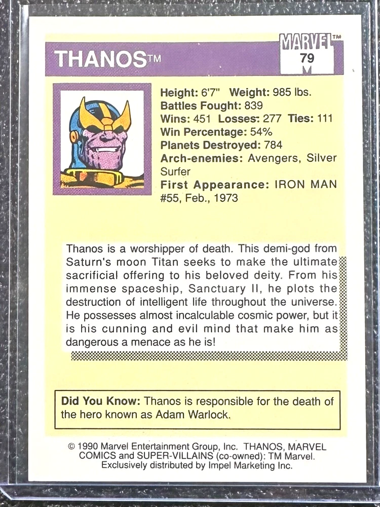 Vintage: Yes Card Number: 79 Manufacturer: Impel Features: Base Set Set: 1990 Marvel Universe I Original/Licensed Reprint: Original Type: Non-Sport Trading Card Character: Thanos Year Manufactured: 1990 Language: English Country/Region of Manufacture: United States Franchise: Marvel (MCU)