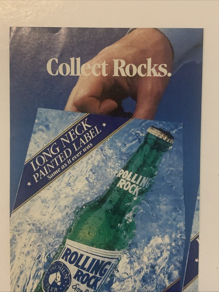 The product is a vintage 1990 Rolling Rock magazine print ad featuring the brand's beer. The ad is a two-piece set with each piece measuring approximately 5"x11" and is perfect for collectors looking to display proudly. The multi-color ad was created in the United States and comes with a Rolling Rock box and bucket, making it a unique and nostalgic addition to any collection of memorabilia from the 90s era. Ideal for fans of Rolling Rock beer and vintage advertising, this collectible item offers a glimpse into the brand's history and marketing strategies of the past.