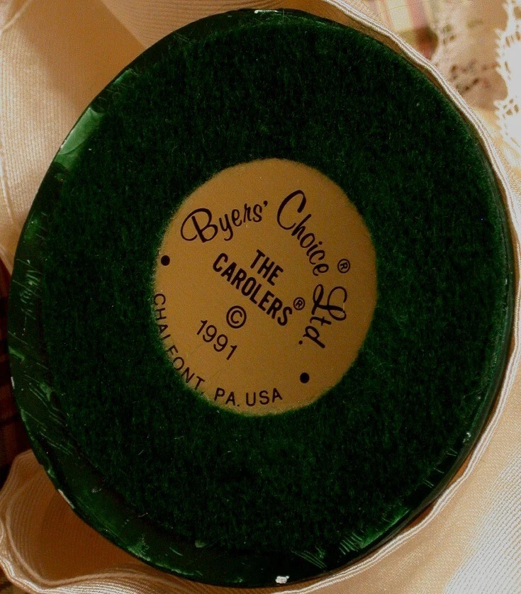 Year Manufactured:1991Seller Notes:“In vey good condition with a few spots of color worn from edge of base. No stains or tears.”Brand:Byers’ ChoiceCountry/Region of Manufacture:United StatesMaterial:Mixed MaterialsColor:MulticolorHandmade:YesType:FigurinePersonalize:NoTime Period Manufactured:1990-1999Occasion:Christmas