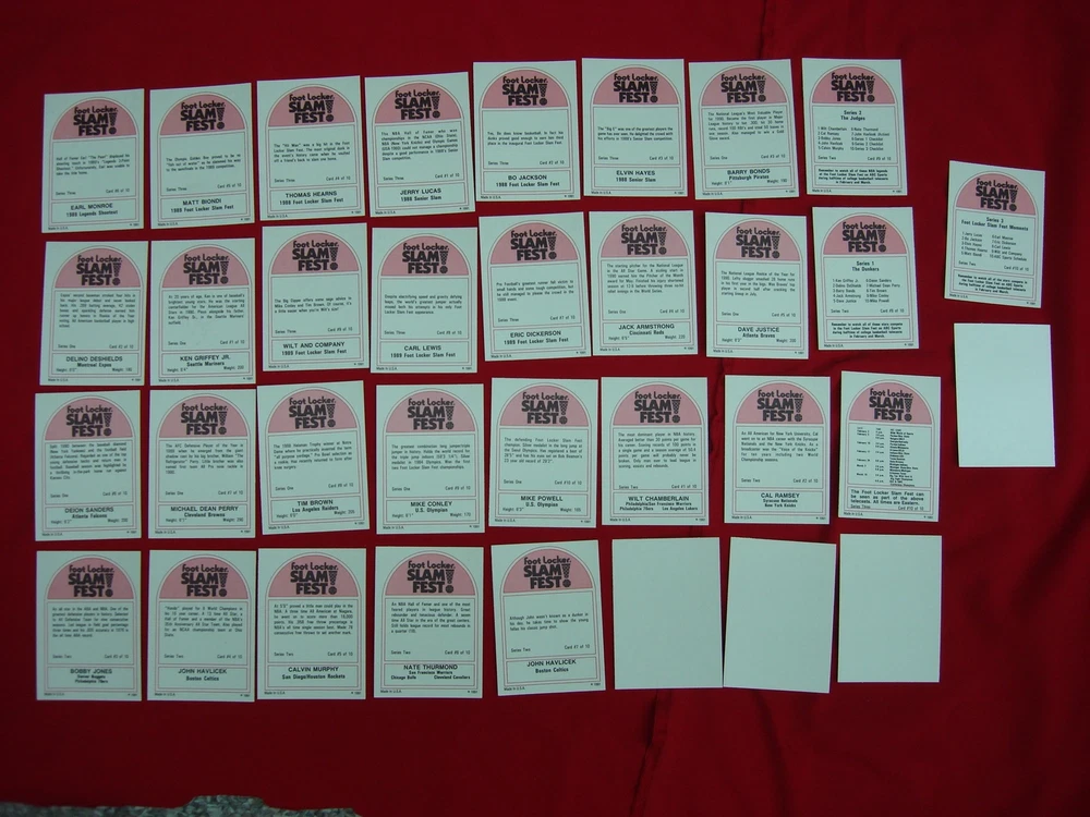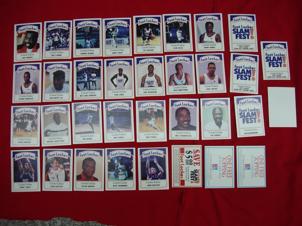 1991 FOOT LOCKER SLAM FEST SERIES 1, 2 & 3 FACTORY SEALED SET 1991 FOOT LOCKER SLAM FEST SERIES 1, 2 & 3 FACTORY SEALED SET Description ********* HERE IS A 1991 FOOT LOCKER SLAM FEST SETS SERIES 1, 2 & 3 CHAMBERLAIN, PERRY, DEION SANDERS, GRIFFEY JR, CARL LEWIS & EARL MONROE *COUPONS ARE EXPIRED* PLEASE SEE THE PHOTOS! YOU DETERMINE CONDITION, GRADE AND QUALITY! CARDS ARE PRICED APPROPRIATELY, ACCORDING TO CONDITION! ~PLEASE VIEW OUR OTHER NON-SPORT TRADING CARDS~ PLEASE NOTE : OUR PRICES ARE FIRM. THEY ARE THE LOWEST WE CAN SELL IT FOR. WE DO NOT ACCEPT OFFERS. IF YOU OFFER..YOU WILL BE BLOCKED Terms, Payment and Shipping Information We currently only ship to the United States and through eBay's Global Shipping Program. We will help with shipping and handling charges on multi-auction wins. Shipping is usually $1.00 per auction after the first, unless there are weight or size issues. You must ask for a combined invoice when you are done buying or bidding. Most folks figure the S/H charges into their total price. A careful eBayer who takes the time to study the photos, reads the entire description, and asks pertinent questions is our best customer. The digital images we display have the most accurate color possible. However, due to differences in electronic displays, we cannot be responsible for variations in color between the actual product and your display. We reserve the right to cancel any bid. Be sure to check out our other items: Listing and template services provided by inkFrog