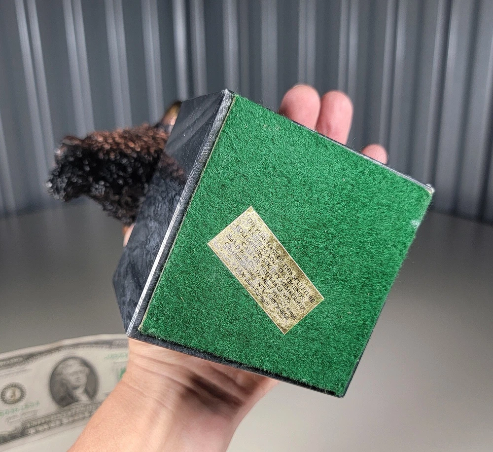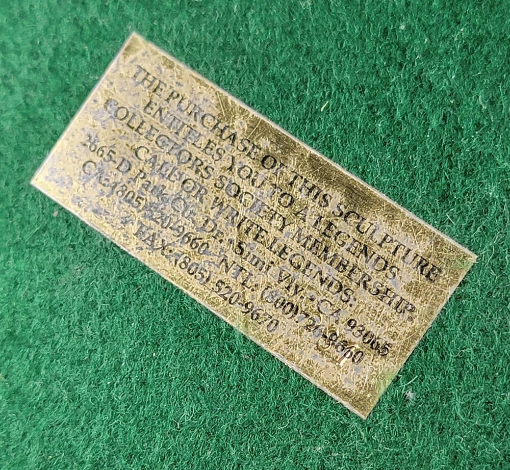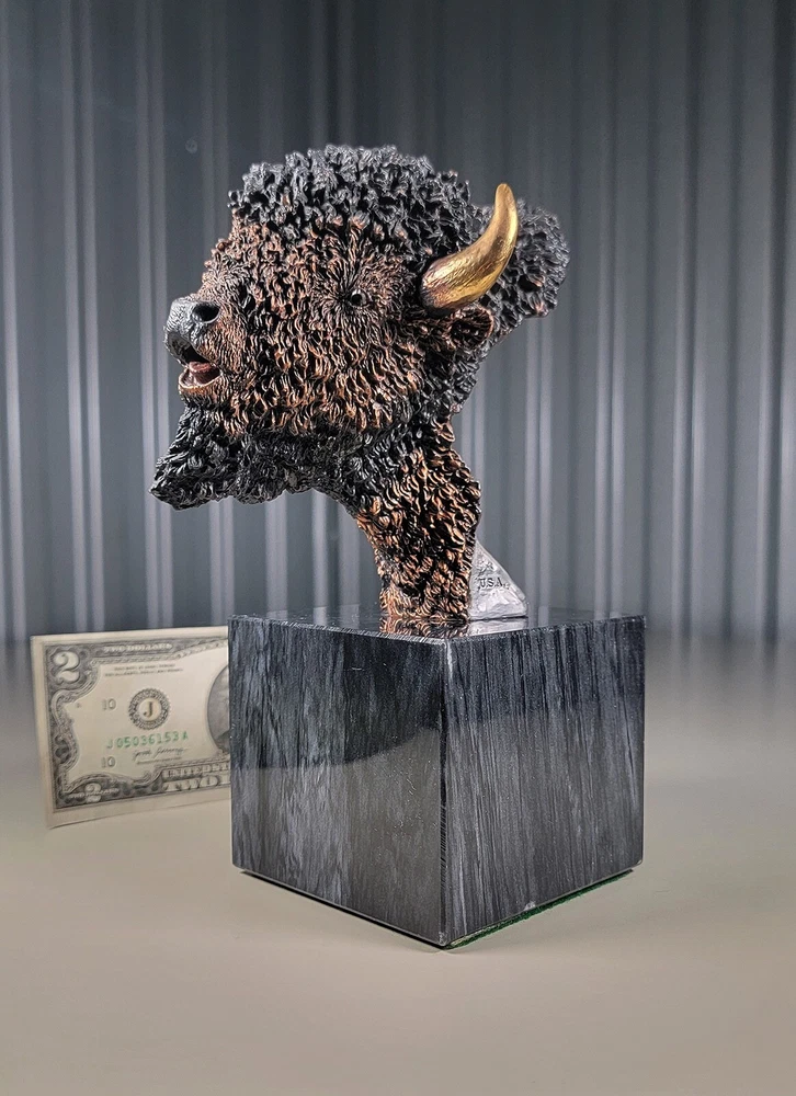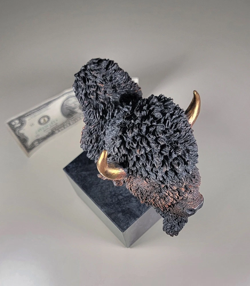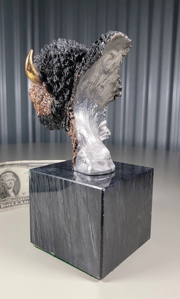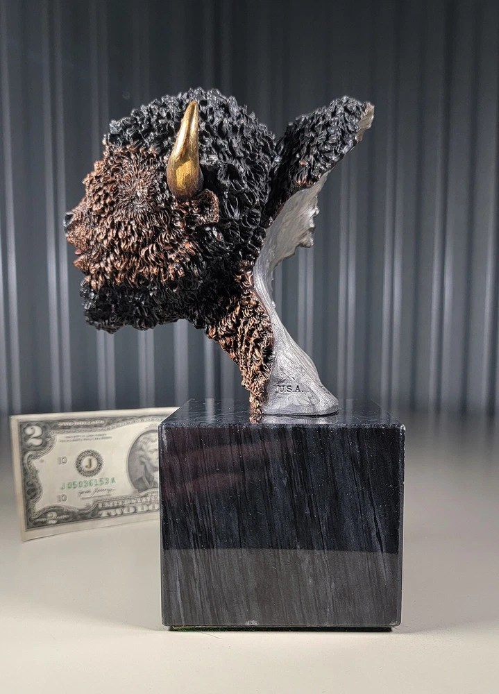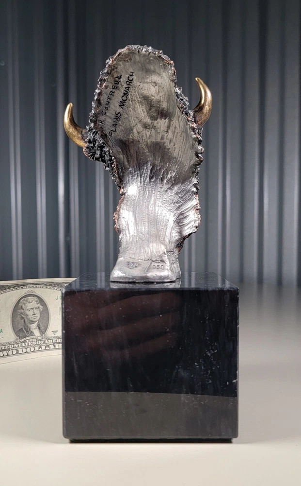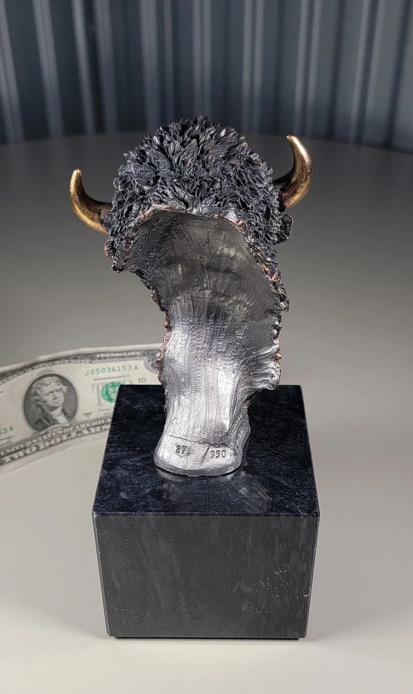 1991 KITTY CANTRELL Legends Wildlife Sculpture-BUFFALO-Plains Monarch DIMENSIONS: Overall: 8" tall x 5" deep x 3 3/4" wide. Weight: 8 lbs. DESCRIPTION: Vintage limited edition wildlife sculpture by KITTY CANTRELL. "Plains Monarch". Buffalo bust. "Legends" series. #275 from and edition of 950. Mixed media cast metal on a marble base with felted bottom. All original. Maker's marks: "K. Cantrell - Plains Monarch - Legends - ©1991 - 275/950 - U.S.A." in casting; gold foil label on bottom with an additional number stamp (illegible). No literature or original packaging is included. I recently acquired this sculpture from the original owner. CONDITION: Some very light handling wear: a few scattered miniscule edge rubs to the marble base. See photos. Nothing significant / conspicuous. Presumably the sculpture is secured with a nut on threaded rod underneath the felt. It isn't at all conspicuous when sitting, but when you pick the sculpture up it feels as if the nut isn't absolutely tight (but not so loose that the sculpture turns on its base). Otherwise excellent original condition with no damage and no significant wear. No restorations / repairs / touch ups. No chips, flakes, nicks, breaks, cracks, losses. No scratches, scuffs, bruises. No significant rubs. Very clean as found. No stains or discolorations. No oxidation, corrosion, etc. From a smoke free home. Condition is consistent with infrequent, careful handling.Excellent original condition.
