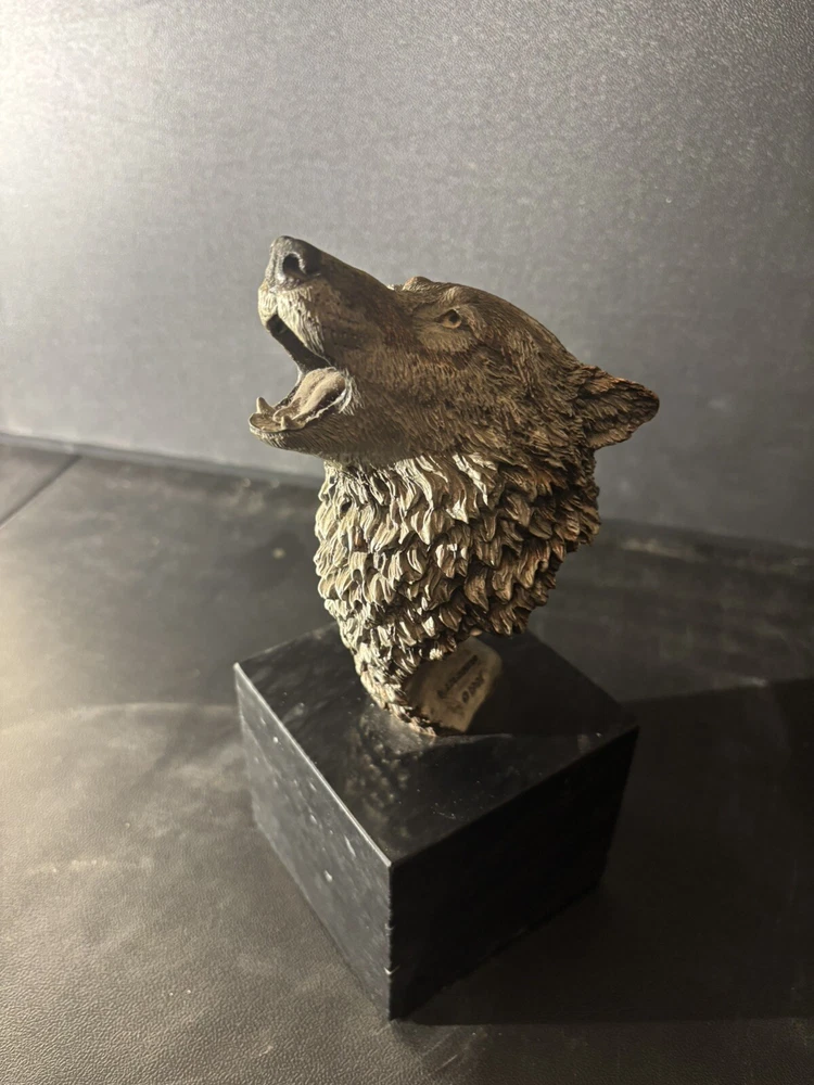 Title: Spirit Song Year Created: 1991 Dimensions: 9” H x 3 1/2” L x 3 1/2” W Weight: 7 lbs Limited Edition: No. 835 of 950 Base Material: Marble What is Mixed Media? Mixed media refers to an intricate blend of fine metals and finishes, including lost wax bronze, fine pewter, brass, copper, and 24-karat gold vermeil. To enhance the sculpture’s aesthetic, artists apply a range of patinas such as black nickel, rose copper, and turquoise, achieved through precision torching techniques. This masterful combination imbues each piece with exceptional texture, color, and depth. About Kitty Cantrell Award-winning artist and devoted environmentalist Kitty Cantrell is celebrated for her breathtaking sculptures of North American wildlife. With an unmatched ability to capture the spirit and raw essence of animals untouched by human hands, Cantrell’s works often feature wolves, eagles, and humpback whales. A native Californian, Kitty has an extraordinary talent for portraying the authentic characteristics of the creatures she sculpts. Her creative process begins with a general concept, evolving into meticulous research to ensure anatomical precision. She pays close attention to the smallest details, from the span of a wing to the curve of a tail, ensuring the utmost authenticity. Kitty’s process involves shaping a preliminary sculpture from soft clay to evaluate form and composition. This is followed by crafting a master sculpture with refined details and anatomical accuracy. Once complete, the final design is sent to the Legends/Genesis foundry in Los Angeles, California, where a resin cast is created, and the production process begins. In line with her passion for wildlife conservation, Kitty Cantrell donates a portion of the proceeds from her art to organizations such as The Nature Conservancy, the World Wildlife Fund, and the Grounded Eagle Foundation, demonstrating her enduring commitment to preserving the natural world. Happy to answer any questions you might have. This piece would be an amazing addition to anyone’s home in a variety of different settings such as a striking office piece or masterpiece on the mantel. The Spirit Song sculpture is a beautiful piece of art that will hold its value for generations to come.
