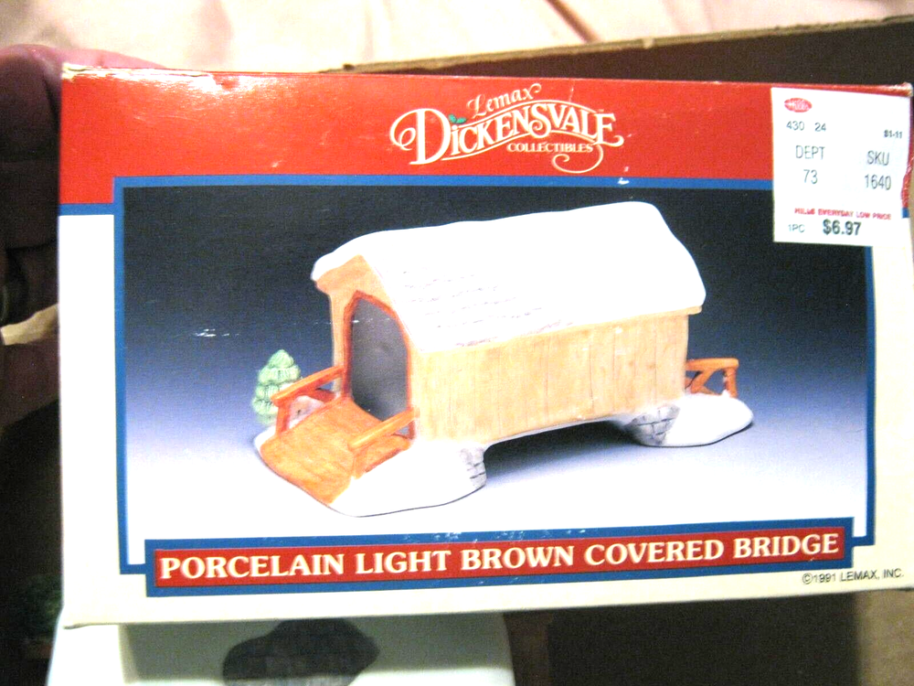 1991 Lemax Porcelain Light Brown Covered Bridge in Box. Item in good condition. Still has LeMax small sticker on the bottom. Box, as pictures show, has a ripped area and a price sticker in the corner. Size approx. 6" x 3" x 3". (D0601) Please see photos for condition and email any questions you may have.
