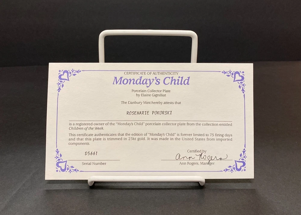 1991 "Monday's Child" Vintage Limited Edition Plate - Danbury Mint [INCLUDES CERTIFICATE OF AUTHENTICITY] P late #: D5661 Art by Elaine Gignilliat " Children Of The Week " Series NOT TO BE USED FOR FOOD. DECORATION PURPOSES ONLY. [RMP-DC7]
