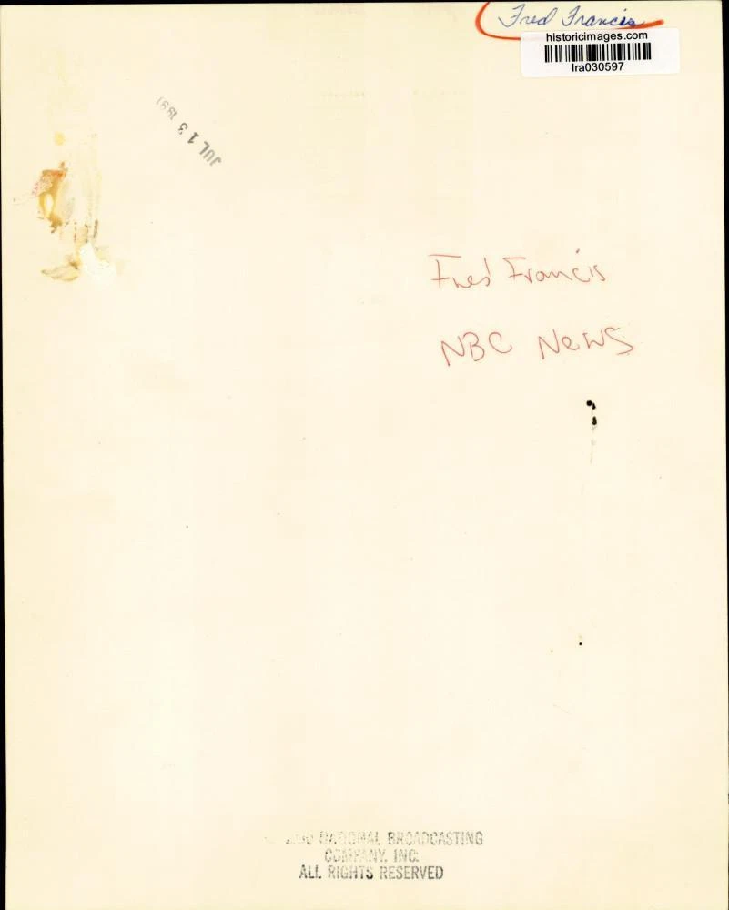 ebay template Note: Please study the images carefully to determine the condition of this vintage photograph, as it may not be in perfect condition. It may contain wrinkles, cracks, and possibly even tears due to its age and how it was handled before it got to us. A scanner may interpret colors and contrast differently than human eyes will, so it is possible that the actual photograph may be slightly darker or lighter in person. This vintage photograph is offered for sale as a collectible item and conveys no transfer of copyright. 1991 Press Photo Fred Francis of NBC News - lra30597 This is an original press photo. Fred Francis of NBC NewsPhoto measures 8 x 10inches. Photo is dated 7-13-1991. PHOTO FRONT PHOTO BACK Historic Images Part Number: lra30597 Sell Smarter with Kyozou. Inventory and Ecommerce Management