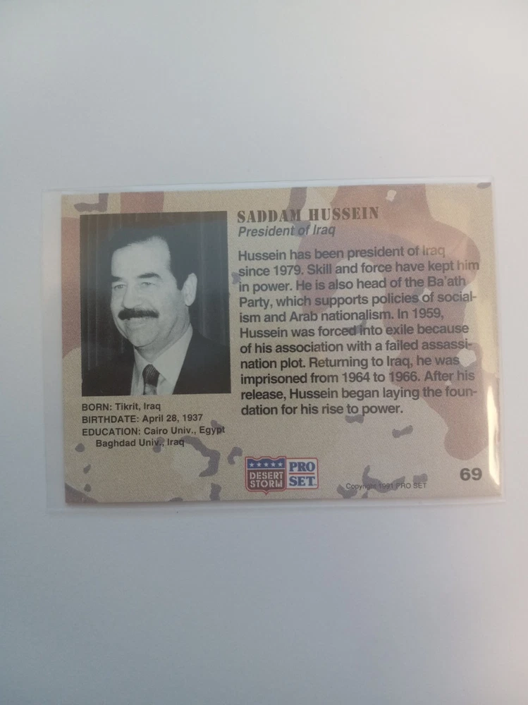 This 1991 Pro Set Desert Storm Saddam Hussein Rookie RC #69 SP is a valuable addition to any trading card collection. With a standard size and non-sport type, this card features the infamous Iraqi leader during his early years. The card is in excellent shape, with no signs of wear or damage. The Desert Storm set is highly sought after by collectors, and this Saddam Hussein card is a gem in the collection. It is an original, licensed reprint and comes from the Pro Set manufacturer. Whether you're a history buff or a card collector, this card is a must-have.