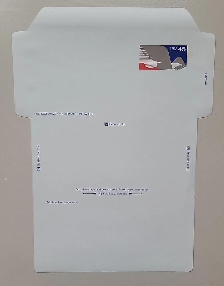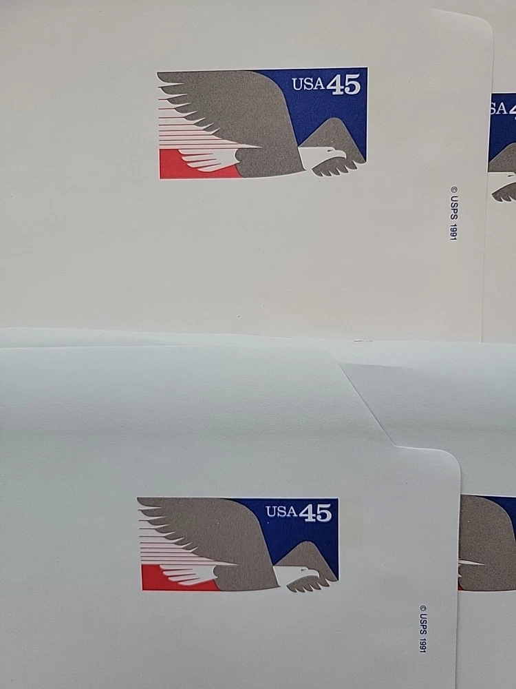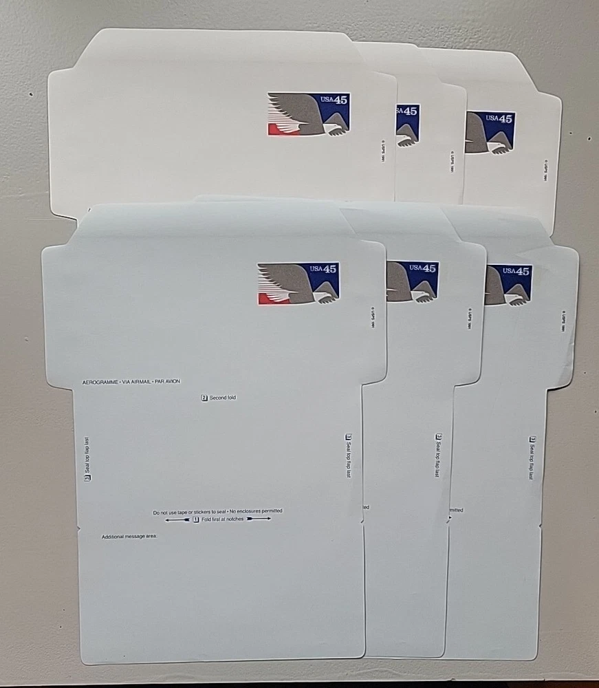 1991 United States 45c Air Letter-Scott #UC63 Unused. Unfolded. 3 Blue/ 3 white. You choose the color. Aerogramme. I am not an expert. Please see the pictures. This is a representation of the group for sale. If there are variations from this picture, I will sell it separately. I know shipping seems like a lot, but this is what I am being charged. Feel free to ask questions. I will combine shipping. See my other items! Thanks!