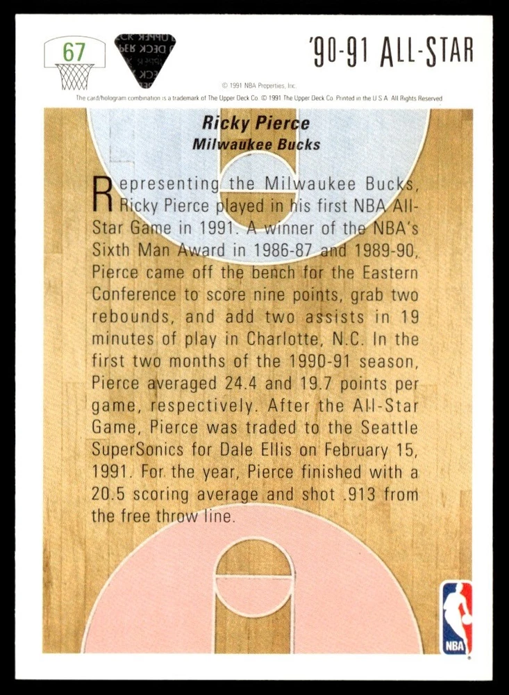 About Me Other Listings Feedback Add to Favorites Contact Me Mesplay Enterprises 1991-92 Upper Deck Ricky Pierce Milwaukee Bucks #67 No stock photo / These are real scans or pictures Details Description: Ricky Pierce Category: Basketball Year: 1991 Product: Upper Deck Team: Milwaukee Bucks Card Number: 67 Dimensions: 3½" x 2½" SKU: BK A0001 R12 U (58) Listing By Kronocard trading cards software v2.7.0.1