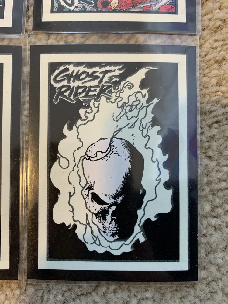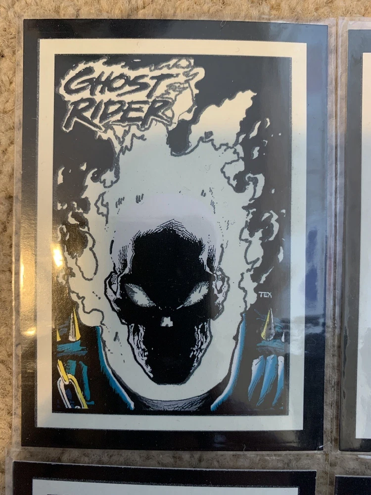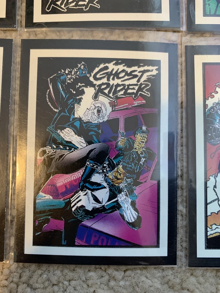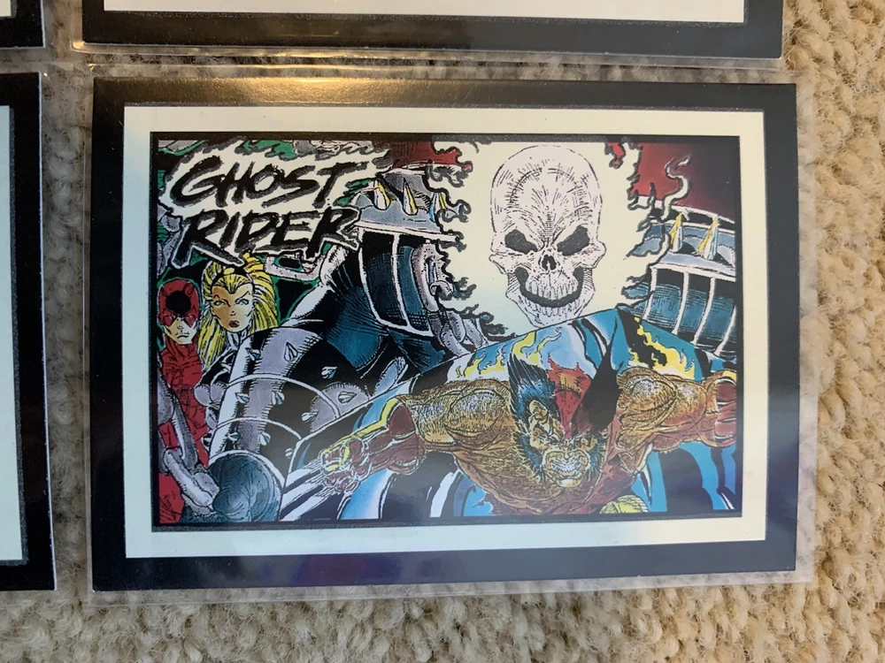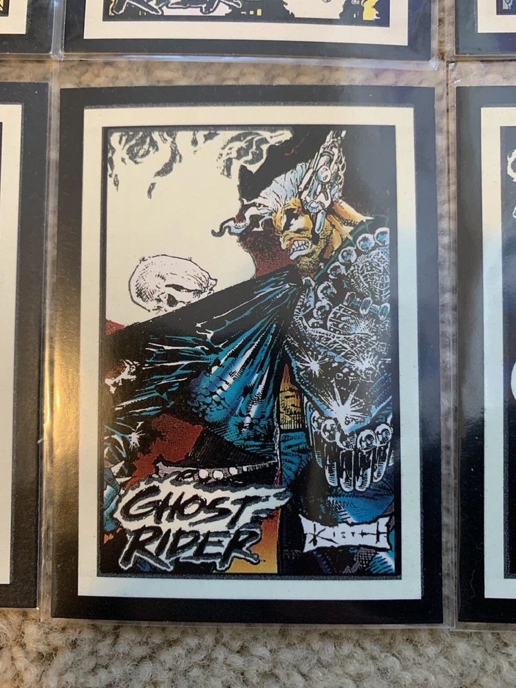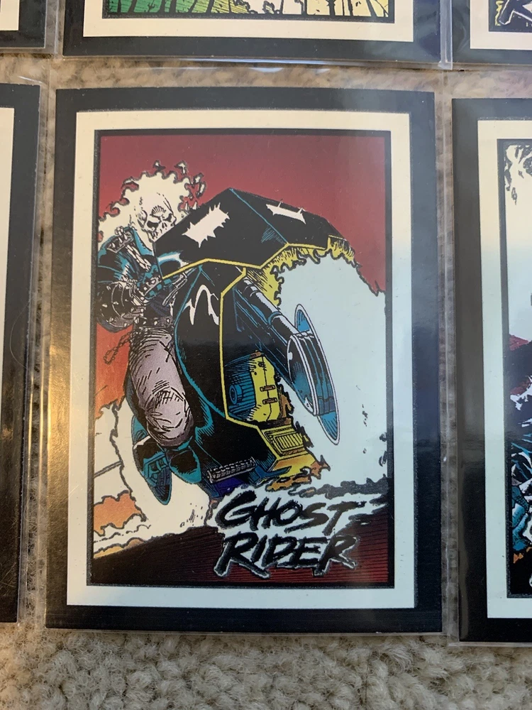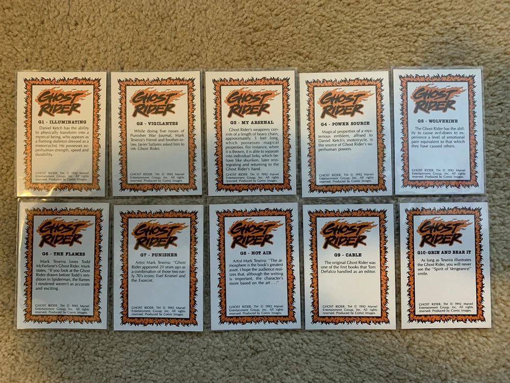 This is a 1992 Marvel Ghost Rider COMPLETE GLOW IN THE DARK INSERT CARD SET, #G1-G10 by Comic Images! Set Includes: G1 - Illuminating G2 - Vigilantes G3 - My Arsenal G4 - Power Source G5 - Wolverine G6 - The Flames G7 - Punisher G8 - Hot Air G9 - Cable G10 - Grin and Bear It Condition: All cards are Near Mint/Mint. Will ship bubble wrapped for maximum protection to ensure they arrive undamaged and in perfect condition. Please ask with any questions.
