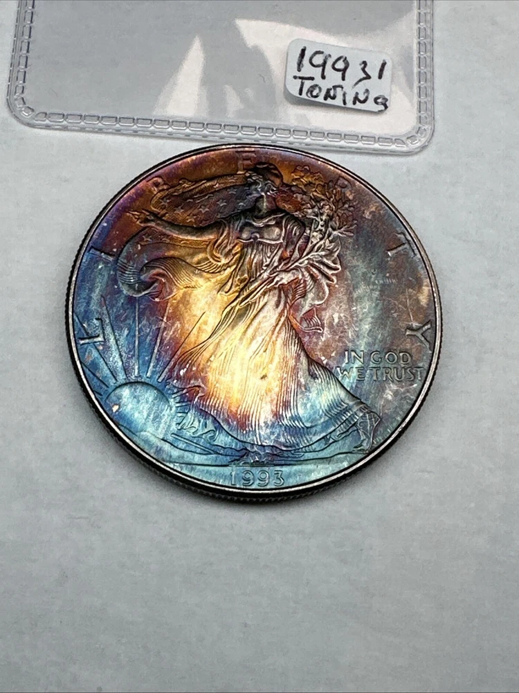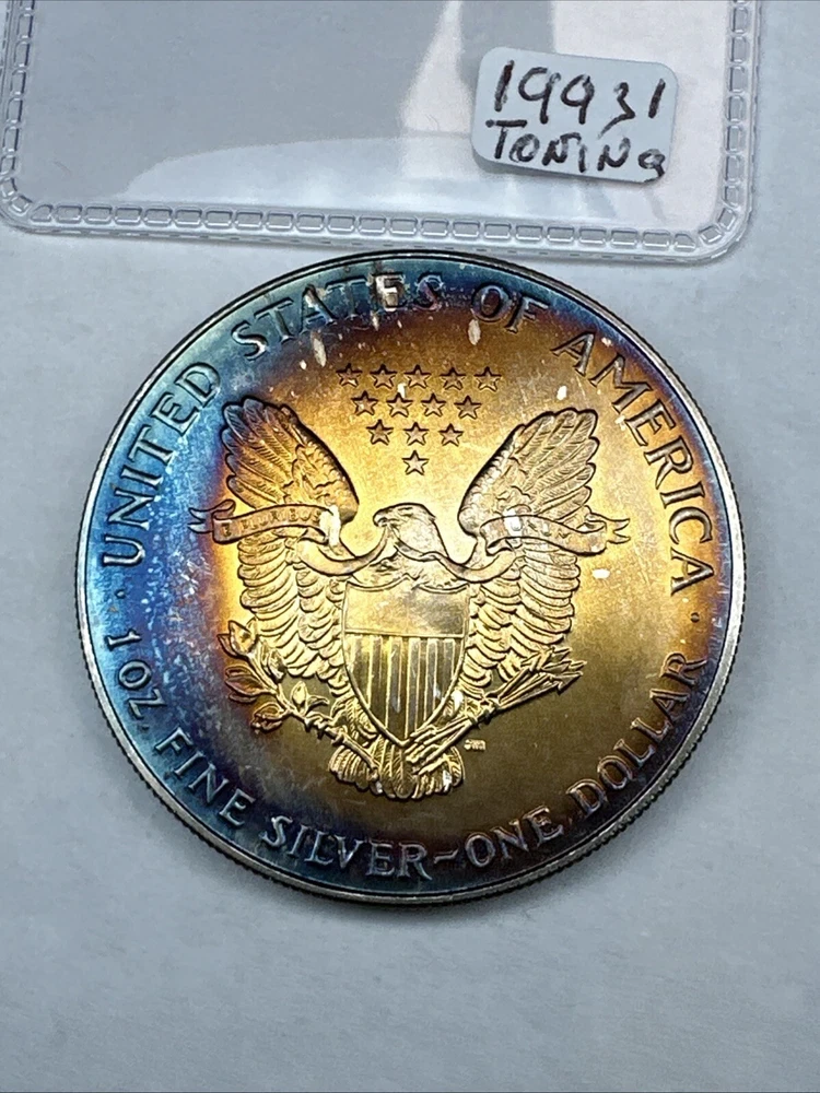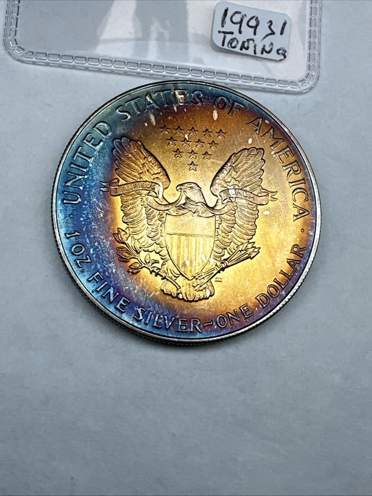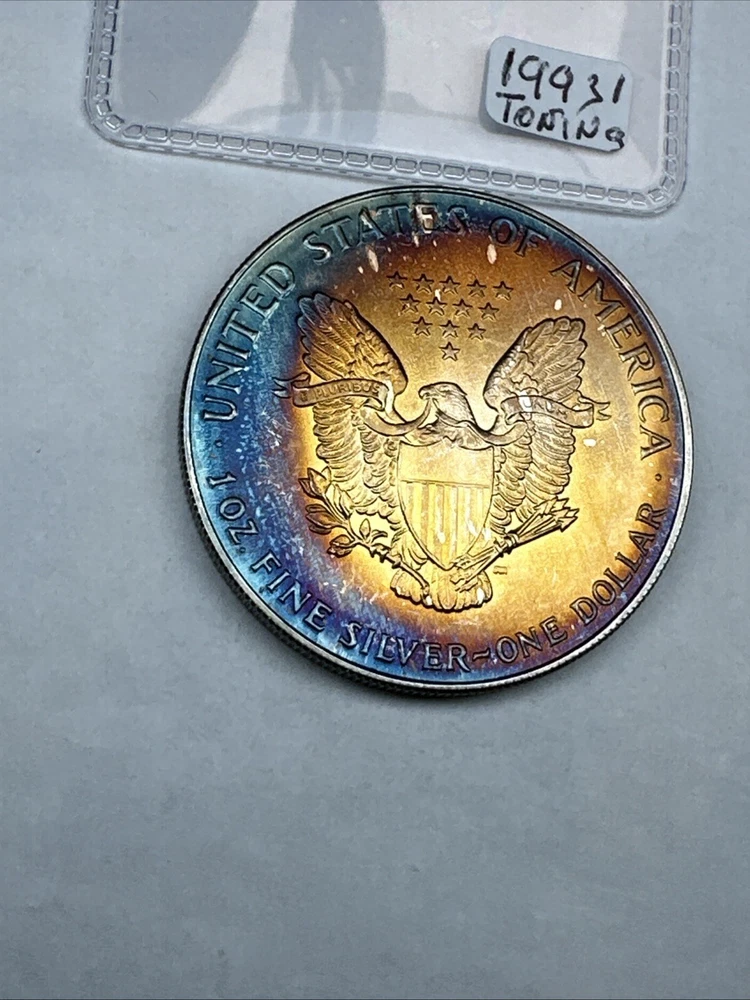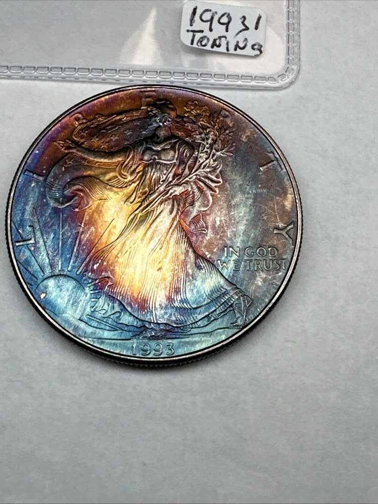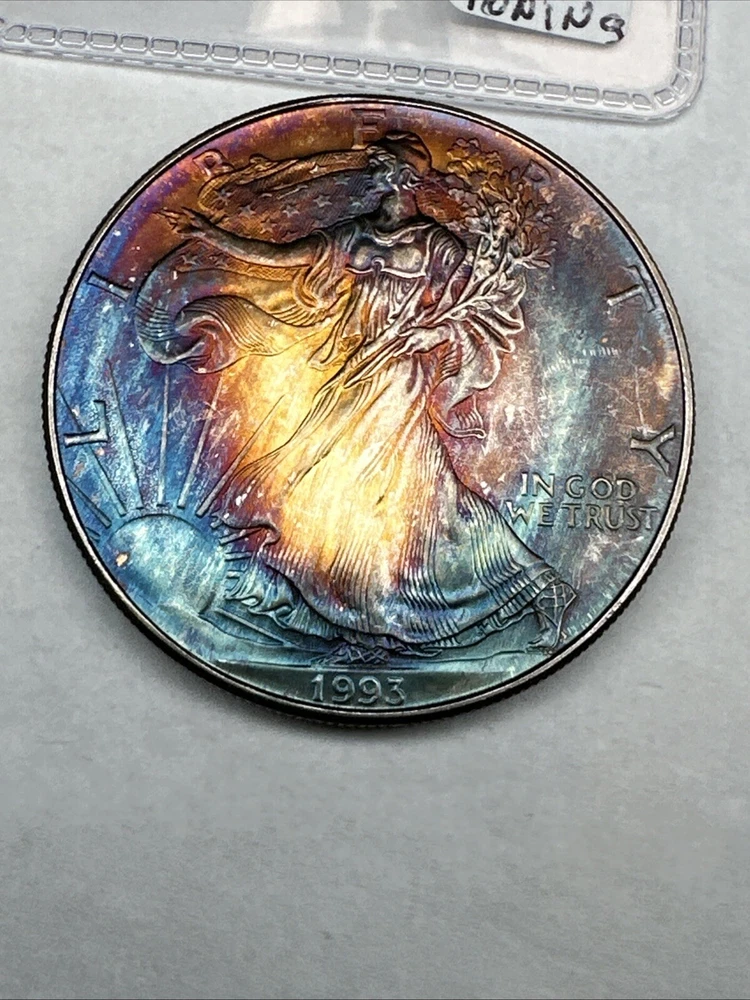 This is a 1993 American Silver Eagle coin minted by the U.S. Mint. It contains 1 oz of .999 fine silver with cool rainbow toning. The coin is uncirculated and comes in ungraded condition. It features the iconic American Eagle design and is a popular choice among bullion collectors and investors. Cool Rainbow Monster Toning.