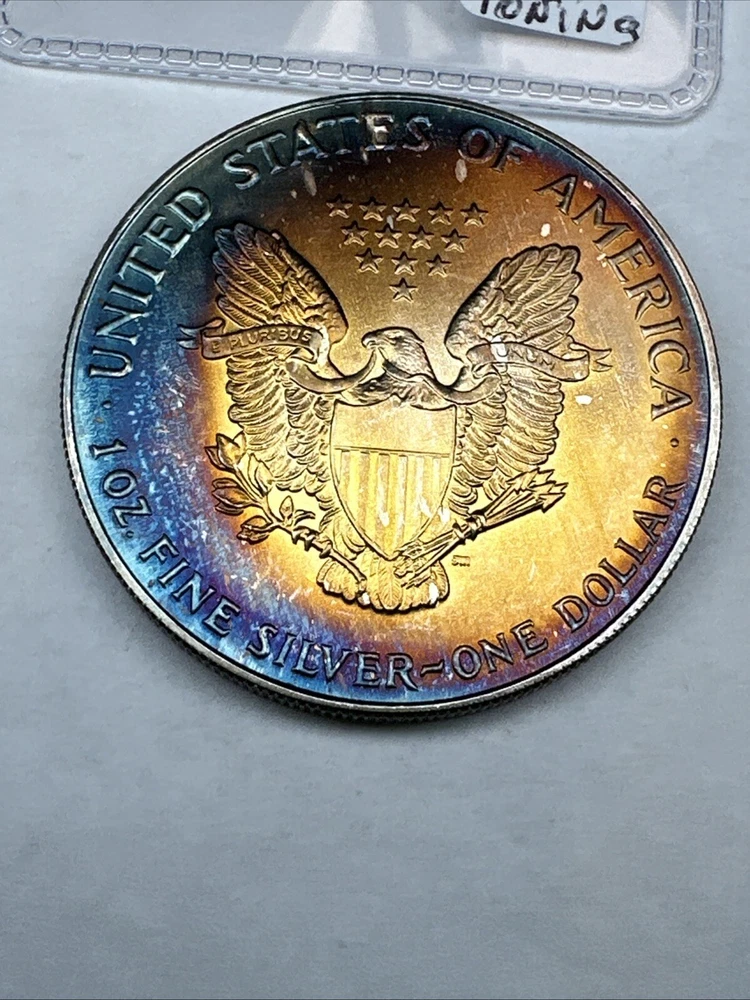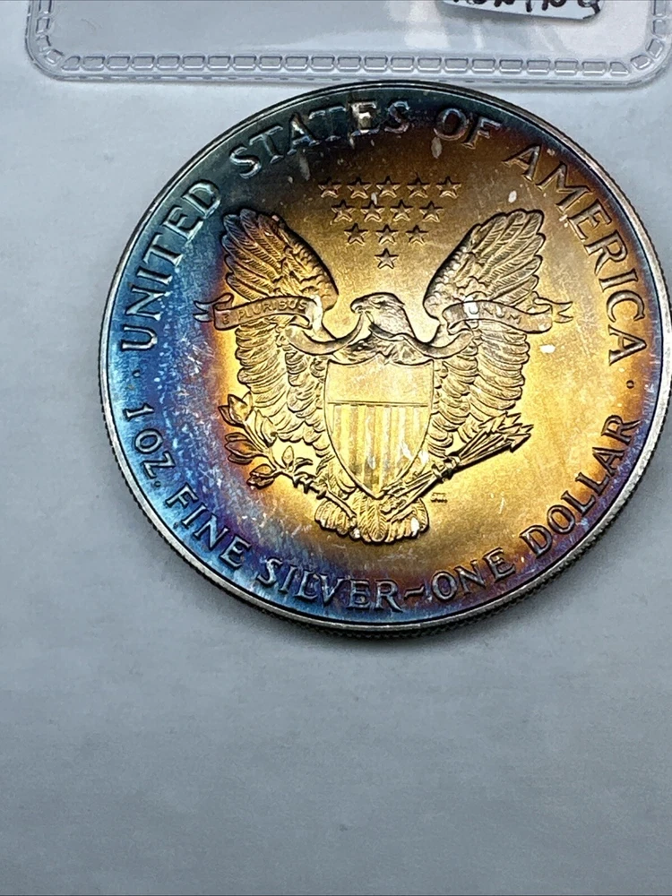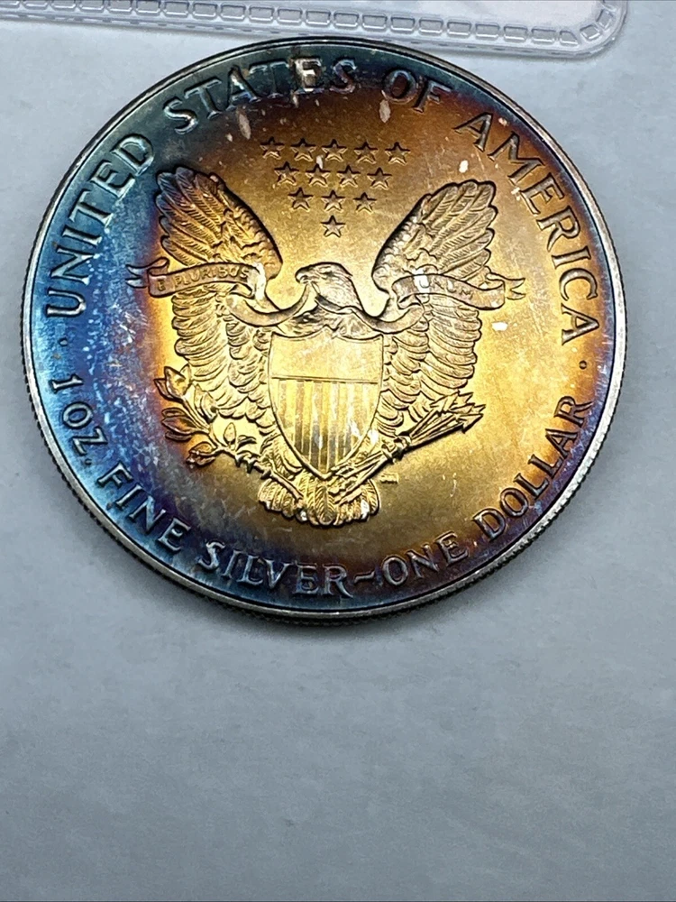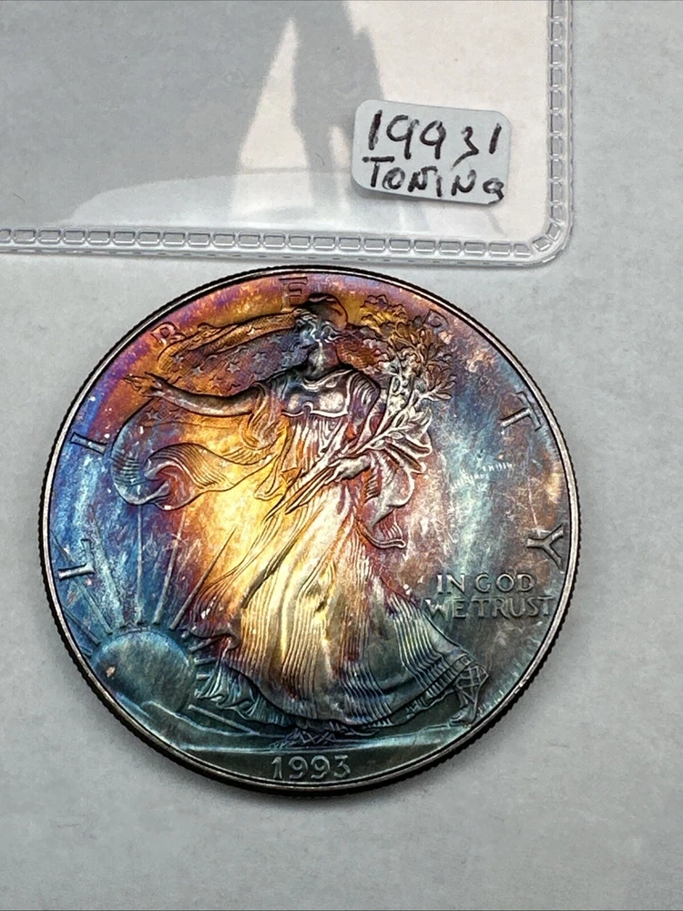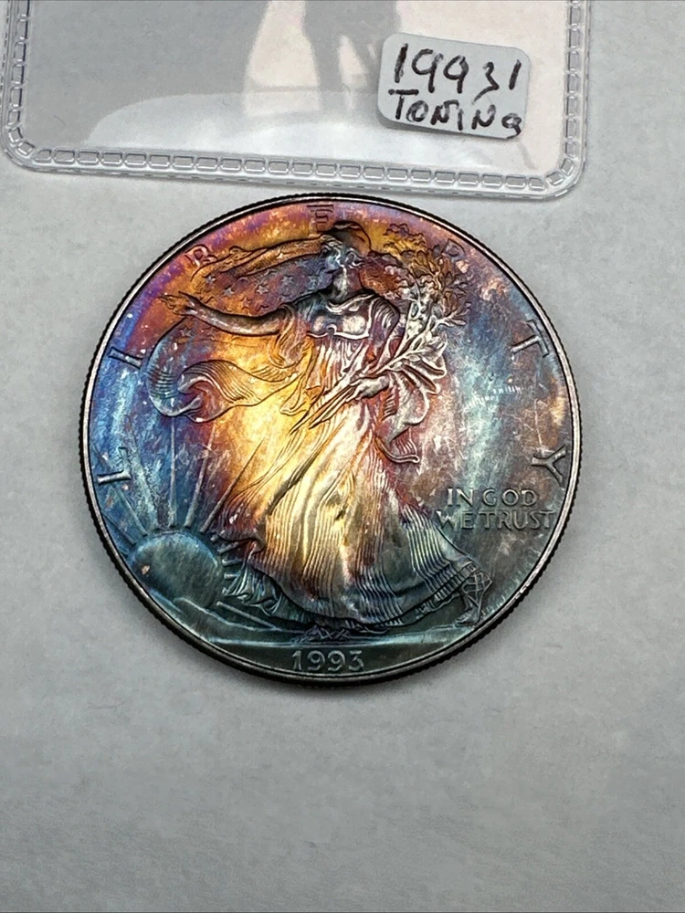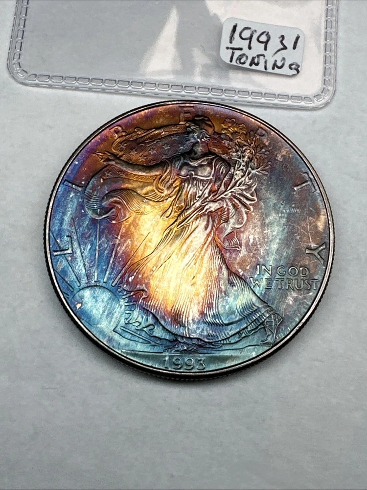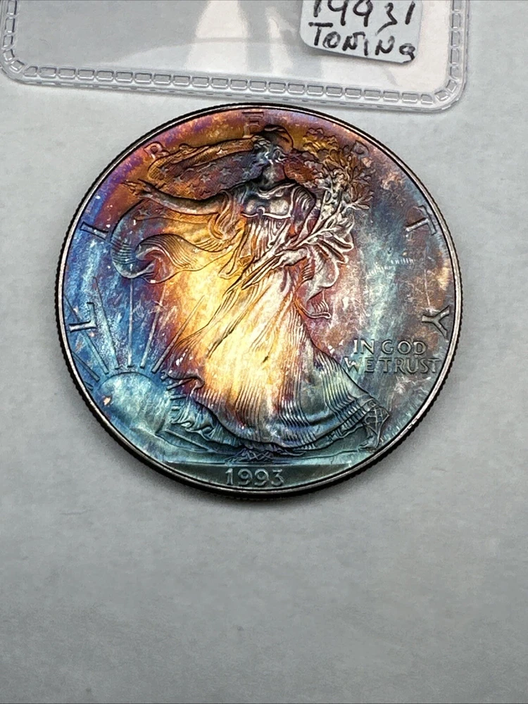 This is a 1993 American Silver Eagle coin minted by the U.S. Mint. It contains 1 oz of .999 fine silver with cool rainbow toning. The coin is uncirculated and comes in ungraded condition. It features the iconic American Eagle design and is a popular choice among bullion collectors and investors. Cool Rainbow Monster Toning.
