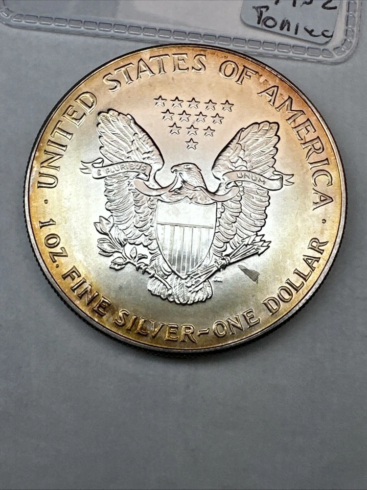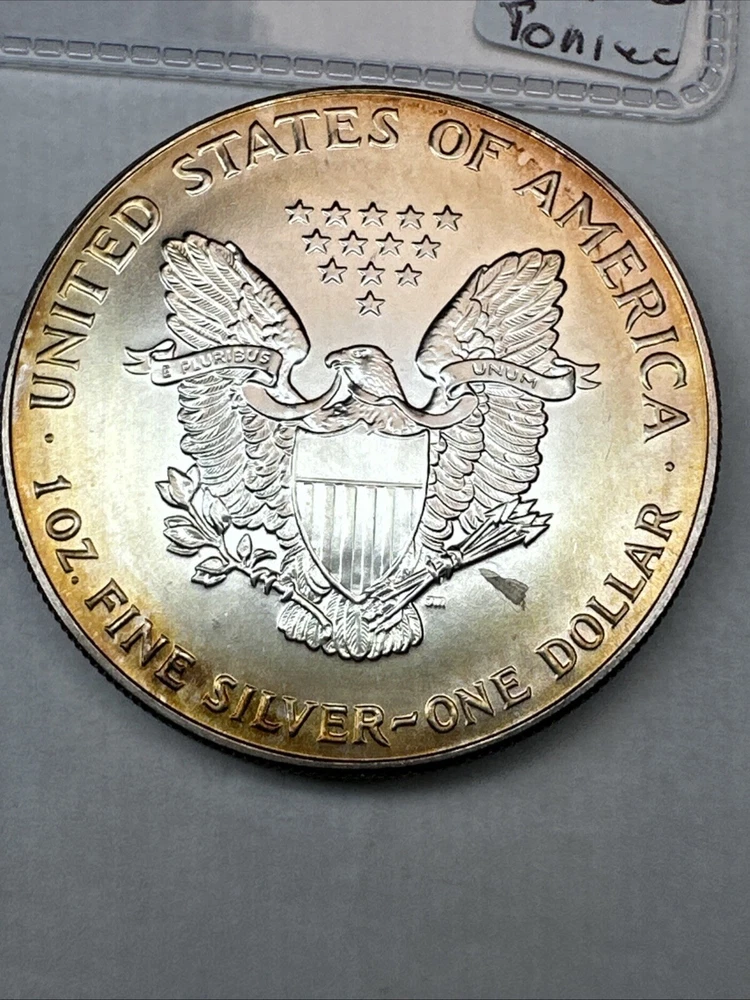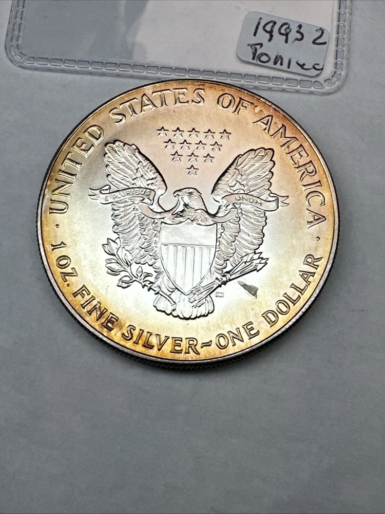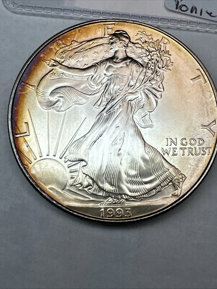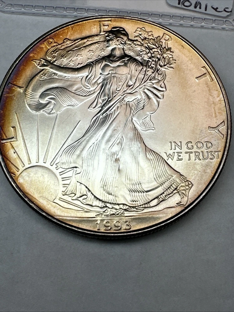 This is a 1993 American Silver Eagle coin, minted by the U.S. Mint. It contains 1 oz of 0.999 fine silver with cool toning. The coin features a depiction of Lady Liberty on the obverse and a heraldic eagle on the reverse. It is uncertified and has a total precious metal content of 1 oz.