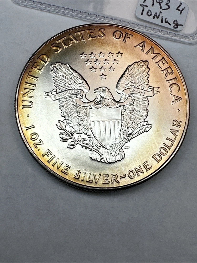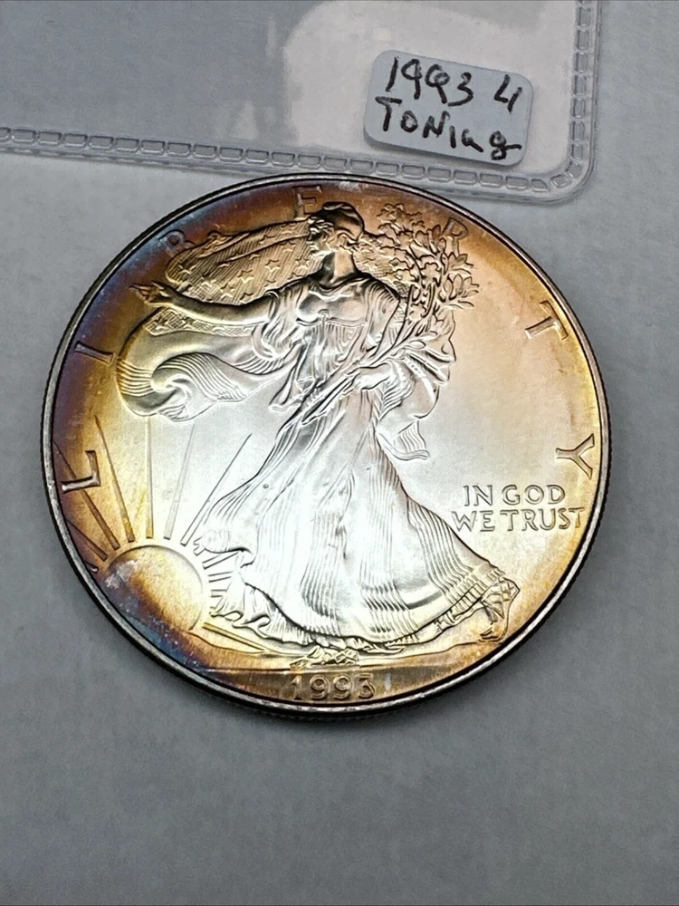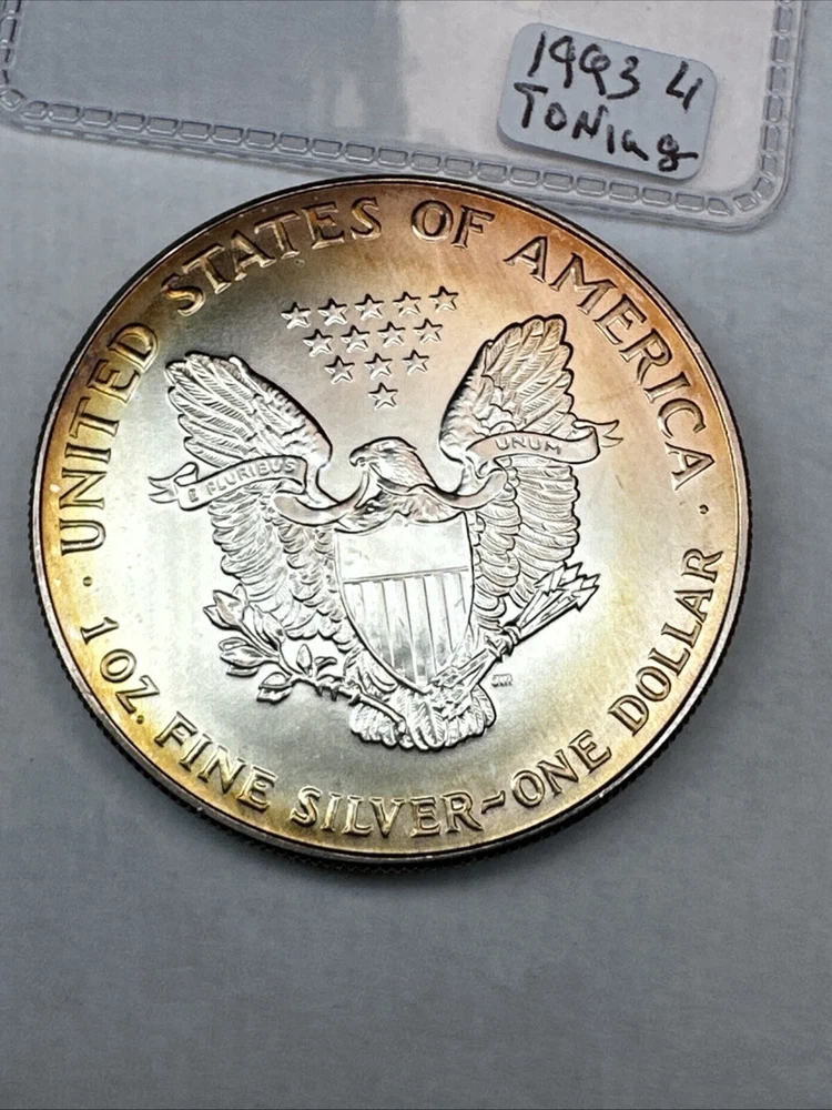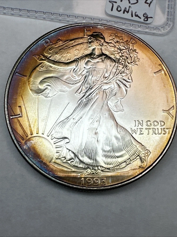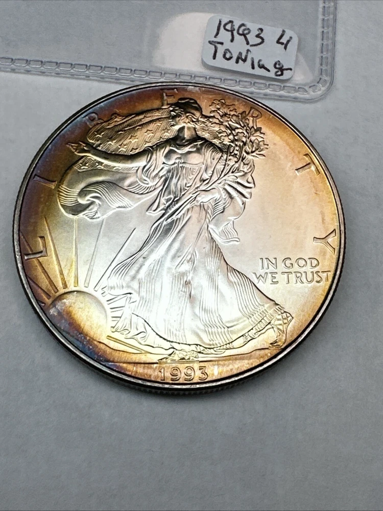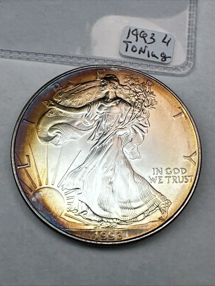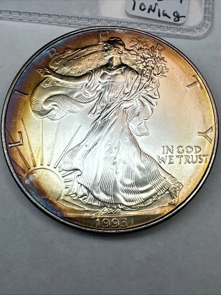 This is a 1993 American Silver Eagle coin, minted by the U.S. Mint. It contains 1 oz of 0.999 fine silver with cool toning. The coin features a depiction of Lady Liberty on the obverse and a heraldic eagle on the reverse. It is uncertified and has a total precious metal content of 1 oz.
