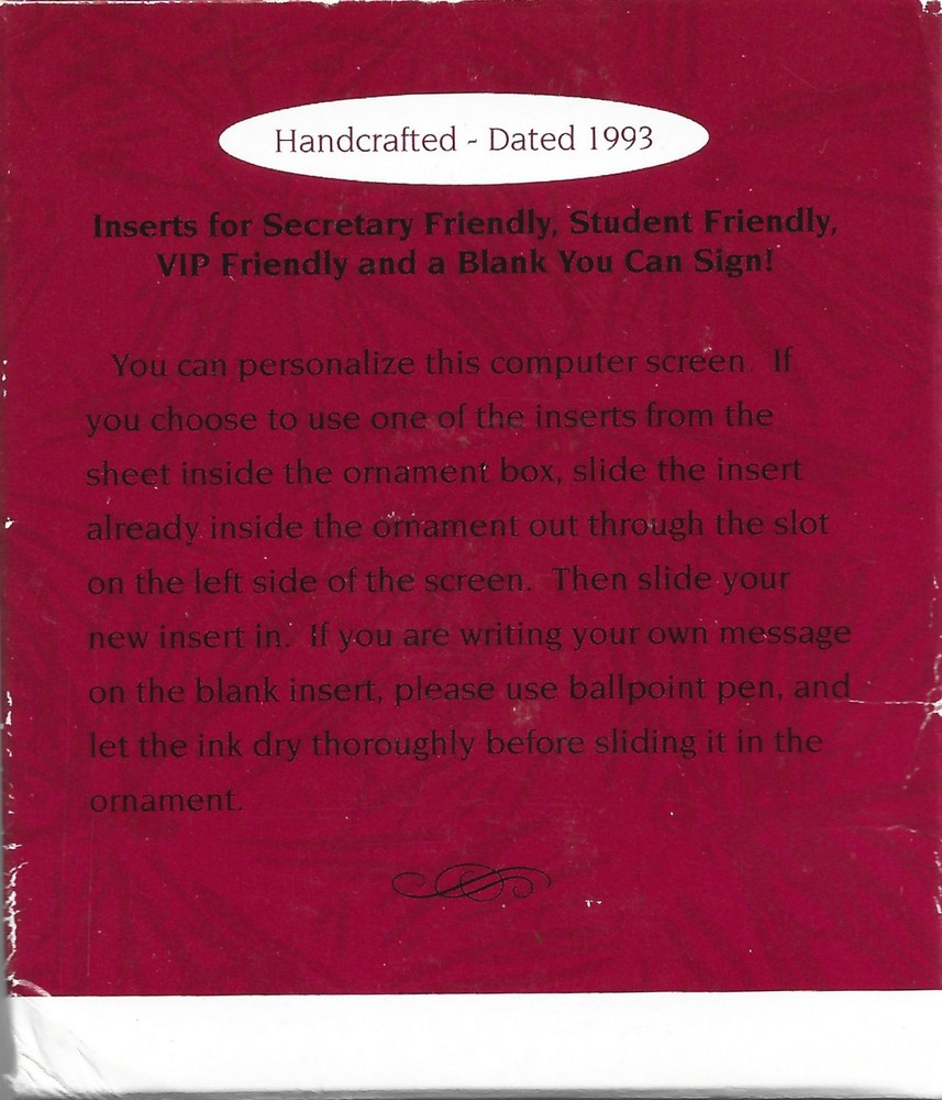 PEOPLE FRIENDLY PERSONLIZABLE 1993 HALLMARK KEEPSAKE ORNAMENT MIB (BD) PEOPLE FRIENDLY PERSONLIZABLE 1993 HALLMARK KEEPSAKE ORNAMENT MIB (BD) WE ALWAYS COMBINE SHIPPING AND REFUND OVER CHARGES AND MONITOR ORDERS THROUGHOUT THE DAY TO MAKE ADJUSTMENTS People Friendly 1993 Hallmark Keepsake Ornament Four Customizable screens included. (see back of box image) Measures 2 1/2" H. Item: # QX5932 (ornament is mint - box is damaged, see detail images ) Payments Checkout must be verified within 3 days of the auction close, or your item(s) will be re-listed and may not be available. When inquiring about your purchase, it is very important that you include the Auction Information, Description, and Shipping Address. If you have any questions, please e-mail us BEFORE bidding or purchasing. We will be happy to answer any of your questions. PLEASE LEAVE A --PHONE NUMBER-- FOR UPS/FED-EX DELIVERIES THANK YOU Shipping Our shipping providers vary by item and/or manufacturer. Our goal is to provide the lowest shipping cost while insuring the highest degree of satisfaction with your delivery. TO AVOID SHIPPING DELAYS, PLEASE LEAVE A --PHONE NUMBER-- FOR THE CARRIER SERVICE SHIPPING COSTS ARE NOT REFUNDABLE UNLESS ITEM IS FAULTY OR INCORRECT !! INTERNATIONAL SHOPPERS !! We realize that many items available in the USA may not be easily obtained elsewhere and vice versa, so we are happy to ship our items Worldwide. Shipping and handling charges will be totaled on your invoice. Please familiarize yourself with the estimated parcel post, freight and mail charges to your country from the US. A fairly short list of examples will allow you to determine easily, in most cases, if your shipping fees will be prohibitive. Handling charges will be added for acquiring and filling out the proper forms required for shipping to individual countries. Quoted price includes delivery to US addresses only Please contact us BEFORE bidding for other locations; there may be additional charges If you shop online internationally we would suggest that you: get estimates from the major carriers for your reference (use a variety of weight and size combinations of flats and packages) do not purchase items that cannot be shipped to your country (**get information on restricted materials from your government) keep this information in your address book or other handy location for use when shopping worldwide For all purchases being shipped outside of the continental United States, please request an invoice before paying for your item. ** You may be surprised at some of the things that are not allowed to be shipped in and out of many countries. !!! PLEASE REQUEST A QUOTE FOR -- COMBINED SHIPPING -- WE WILL ADJUST BILLING IF YOU'VE ALREADY PAID We do combine. You can wait for an invoice before paying or we will refund the excess postage if any. "For your convenience, in most cases you can check the combined shipping amount in the listing. (Shipping tab under the main image) 1. If buying more than one item from one listing, simply click on the "Shipping and Payments" tab next to the "Description" tab; enter the quantity and your zip or postal code, then click "Get Rates". 2. If purchasing different items from multiple listings, try using the shopping cart feature. You can add items to the shopping cart and when you are finished you can check the total before committing to buy. It will not total the adjusted shipping amount, but you may be able to request a total at that point ,though. If the amount doesn't seem correct, ask us about it before buying. Usually it is very close to the right amount. Whenever an item is purchased with excessive postage added, we refund the difference. We ship via the best rate or according to your preference if notified at time of purchase." Terms Please read this listing carefully and contact us with any questions BEFOR E BIDDING or PURCHASING. Some or all of the terms below may apply UNLESS OTHERWISE NOTED IN LISTING Each customer must contact us prior to any return. Return and/or exchange of merchandise must take place within 30 days of receipt of product. All products to be returned must be in original condition. All refunds will require a return authorization and the item must be shipped back for inspection and processing prior to refund. Please note that refunds take up to 30 days to post to your account and may not be visible until your next months billing statement. Merchandise that is -- not defective -- may be returned for a refund in the amount of the items purchase price minus the shipping cost and a restocking fee of 15% of the purchase price of the item. We reserve the right to decline any return or exchange where the product is not in acceptable condition. The terms of our return policy may change without notice. If you have any questions, please contact us. OUR GOAL Our goal is to earn the trust of our customers. To do this we know we must offer competitive pricing, but we also know low prices alone will not make our business superior. To ultimately be able to say that we have done our best, we know we have to combine honest and helpful dealings with outstanding service before, during, and after the sale. We understand that long term customer satisfaction depends on our ability to maintain knowledgeable and courteous customer service practices as well as a tireless effort to find a better deal on a better product. Thank you for visiting Listing and template services provided by inkFrog