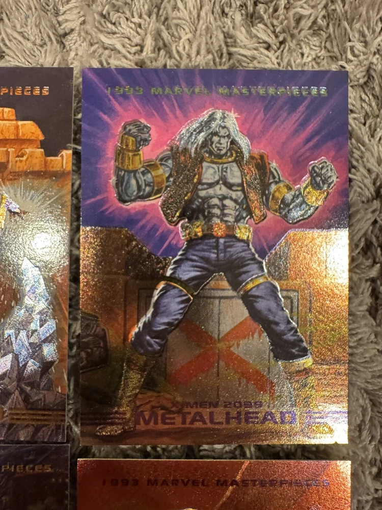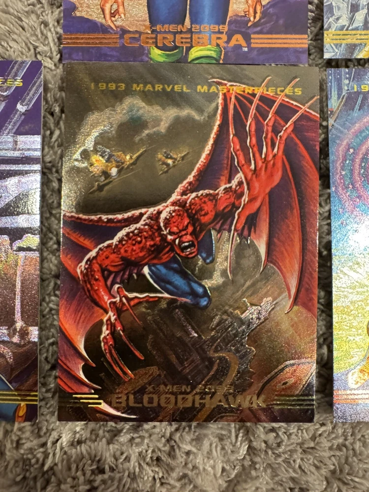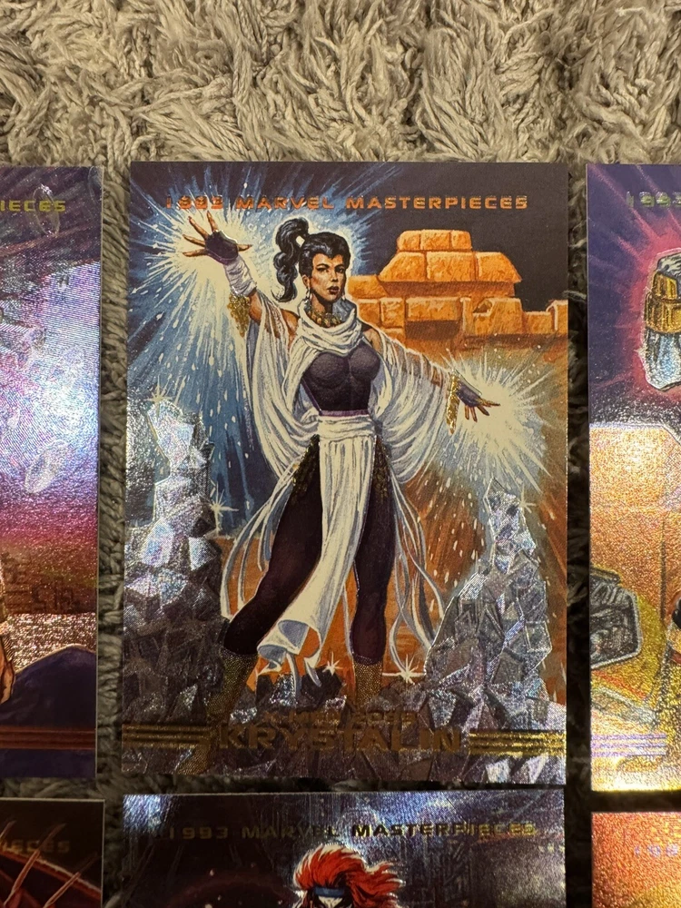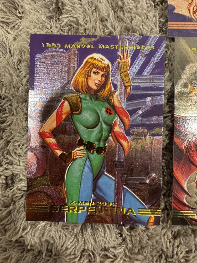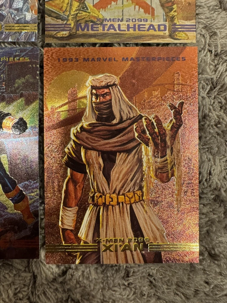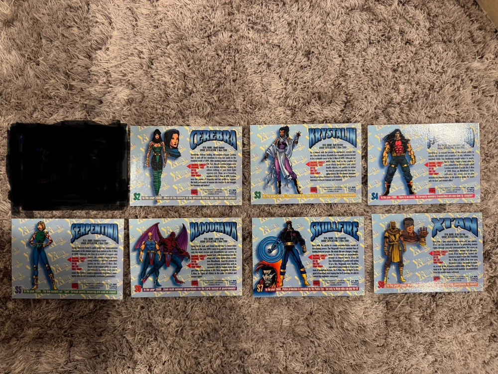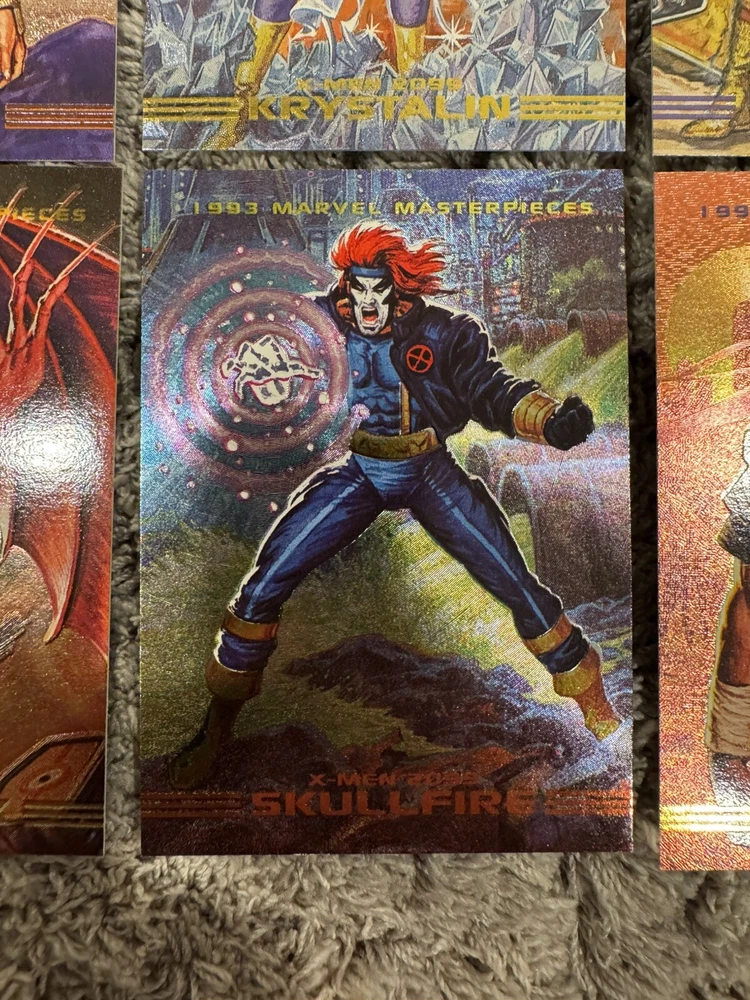 This is a 1993 Marvel Masterpieces NEAR COMPLETE X-MEN 2099 DYNA ETCH INSERT CARD SET, #S1-S8 by SkyBox! Includes an ORIGINAL PACK WRAPPER with purchase! Only missing 1 card! S1 - Meanstreak Set Includes: S2 - Cerebra S3 - Krystalin S4 - Metalhead S5 - Serpentina S6 - Bloodhawk S7 - Skullfire S8 - Xi'an Condition: All cards are Near Mint/Mint. Will ship bubble wrapped for maximum protection to ensure they arrive undamaged and in perfect condition. Please ask with any questions.