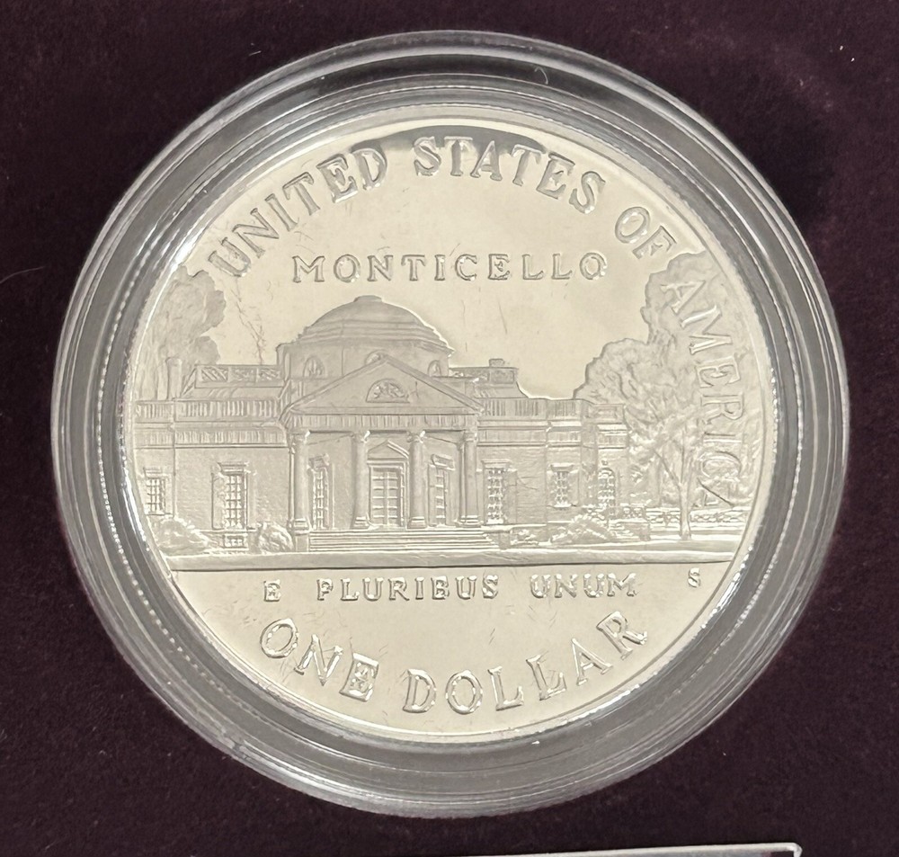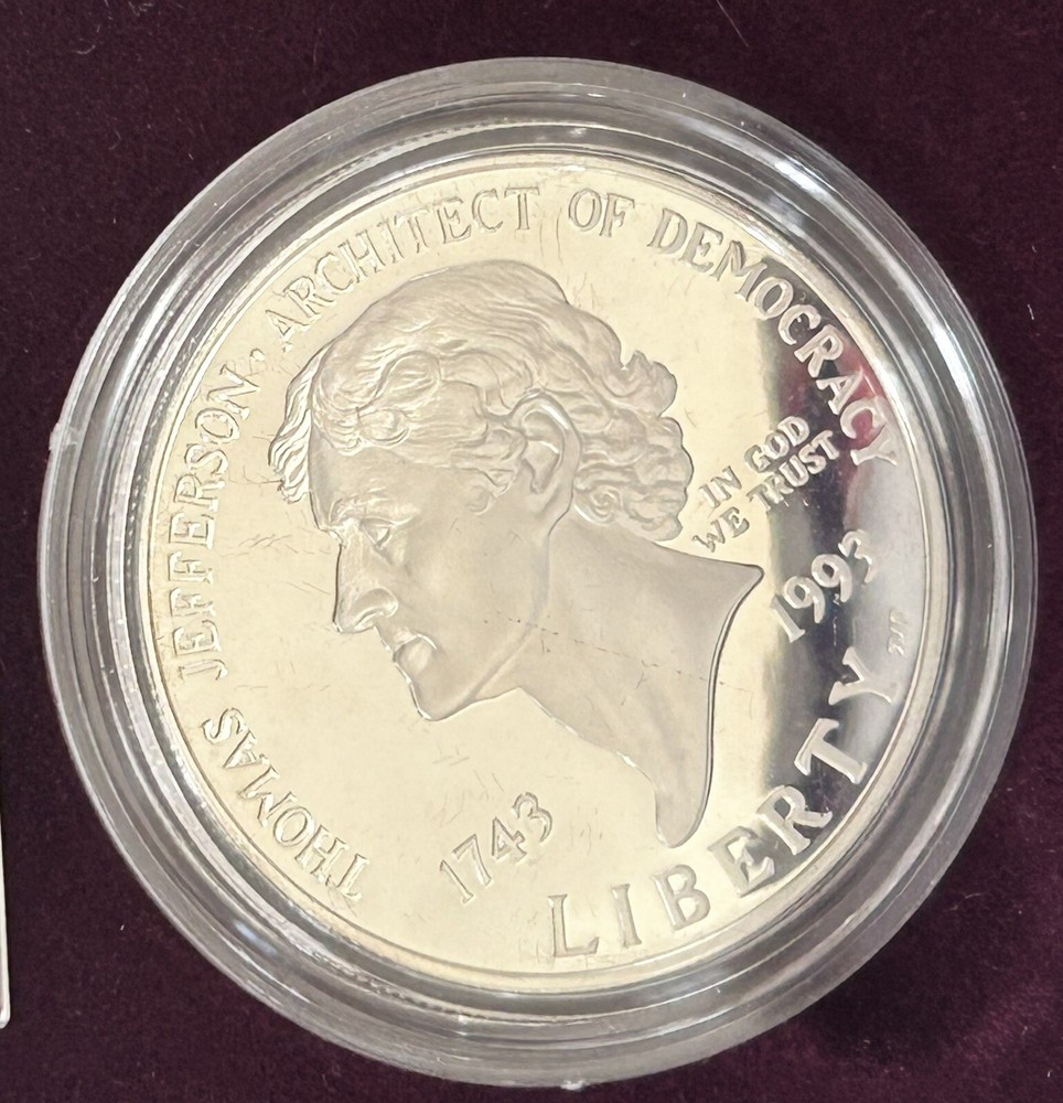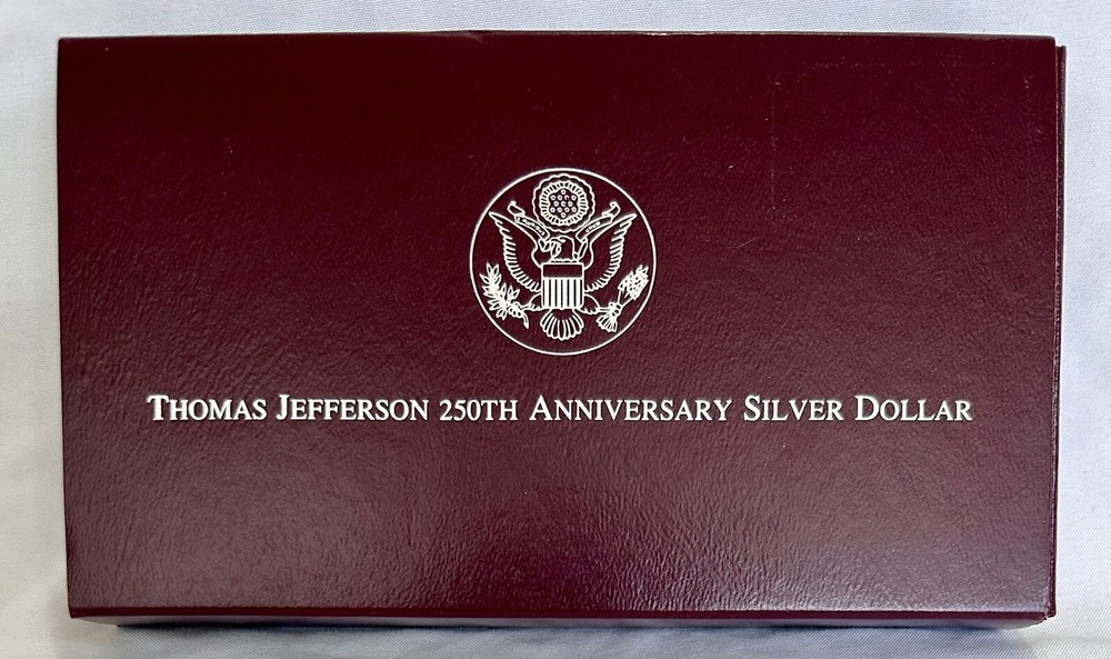 Celebrate a monumental piece of American history with the 1993 Thomas Jefferson 250th Anniversary Uncirculated Silver Dollar. Composed of .9 fineness silver, this coin is a tribute to the esteemed third president and his enduring legacy. Minted in San Francisco, it features a commemorative design that honors Jefferson's contributions to our nation. This silver dollar comes directly from the U.S. Mint, ensuring its authenticity and uncirculated quality. A perfect addition to any collection, it represents not only a piece of history but also the craftsmanship and tradition of American coinage. Own a piece of the Jefferson legacy with this pristine, collectible silver dollar.