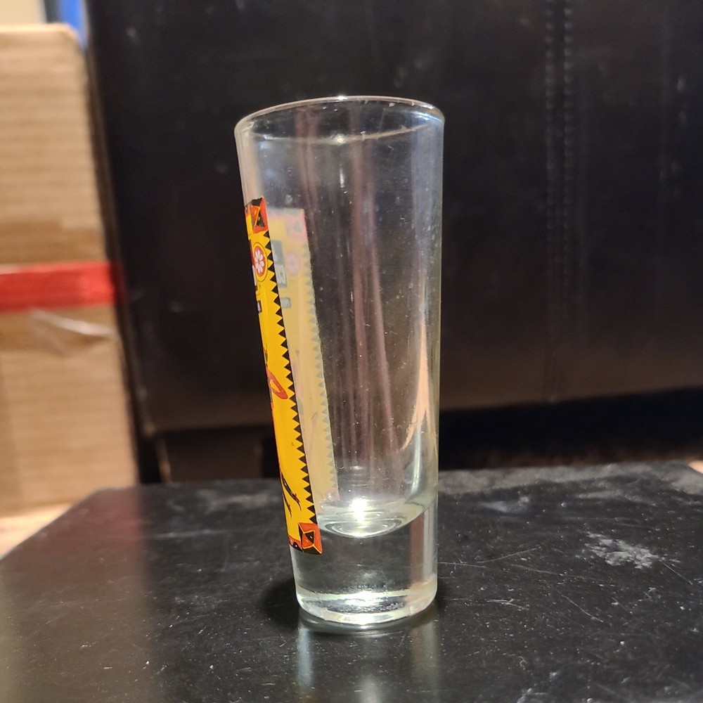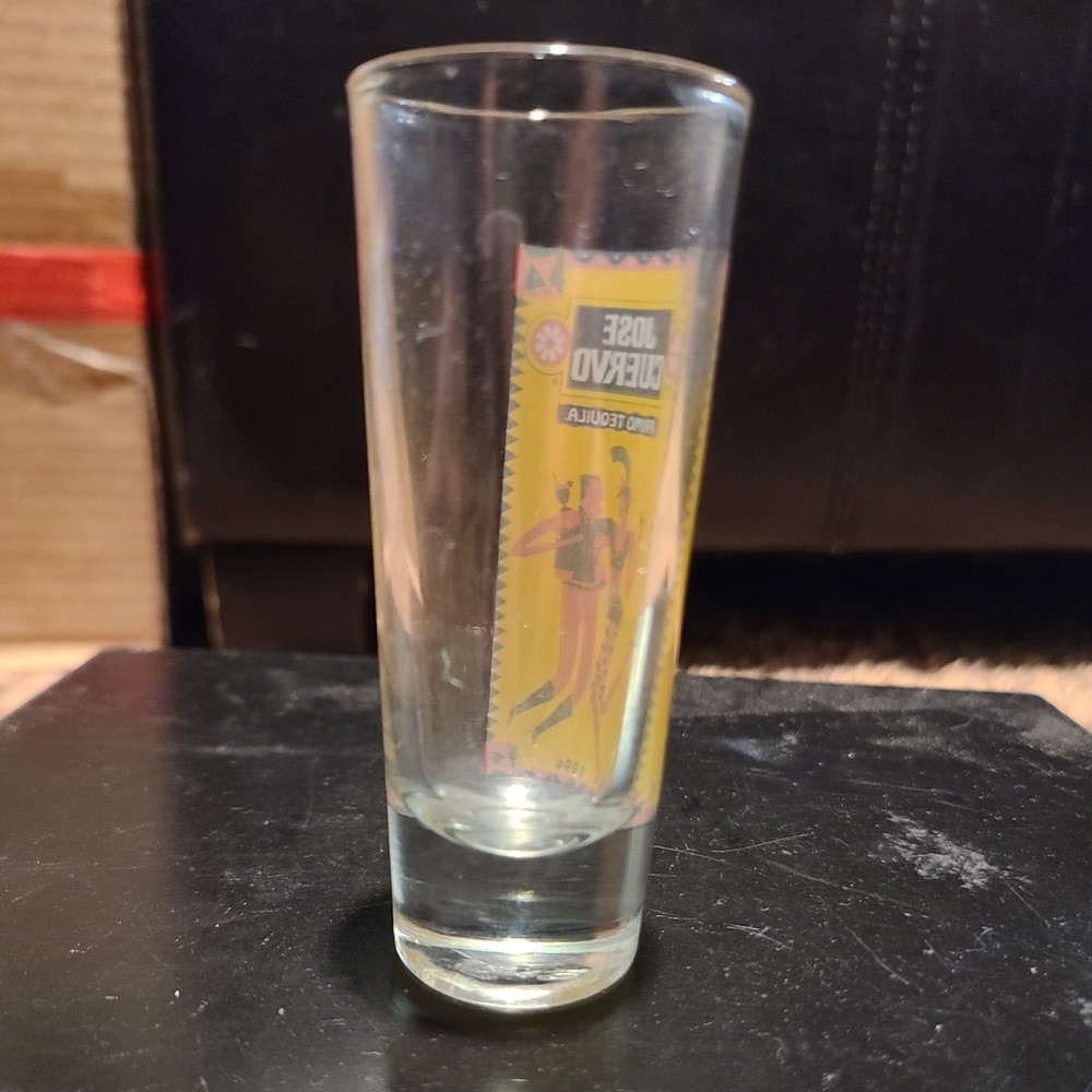 This vintage Jose Cuervo Tequila shot glass, made in 1994, stands at 3 5/8" tall and holds 1 fluid ounce. The multicolor glass showcases the branding of Jose Cuervo Tequila, making it a collectible item for enthusiasts of alcohol, advertising, and barware. This original piece from the 1990s adds a unique touch to any collection of shot glasses or tequila memorabilia.