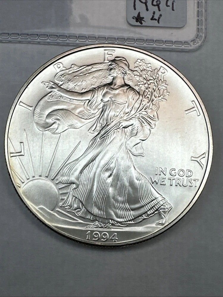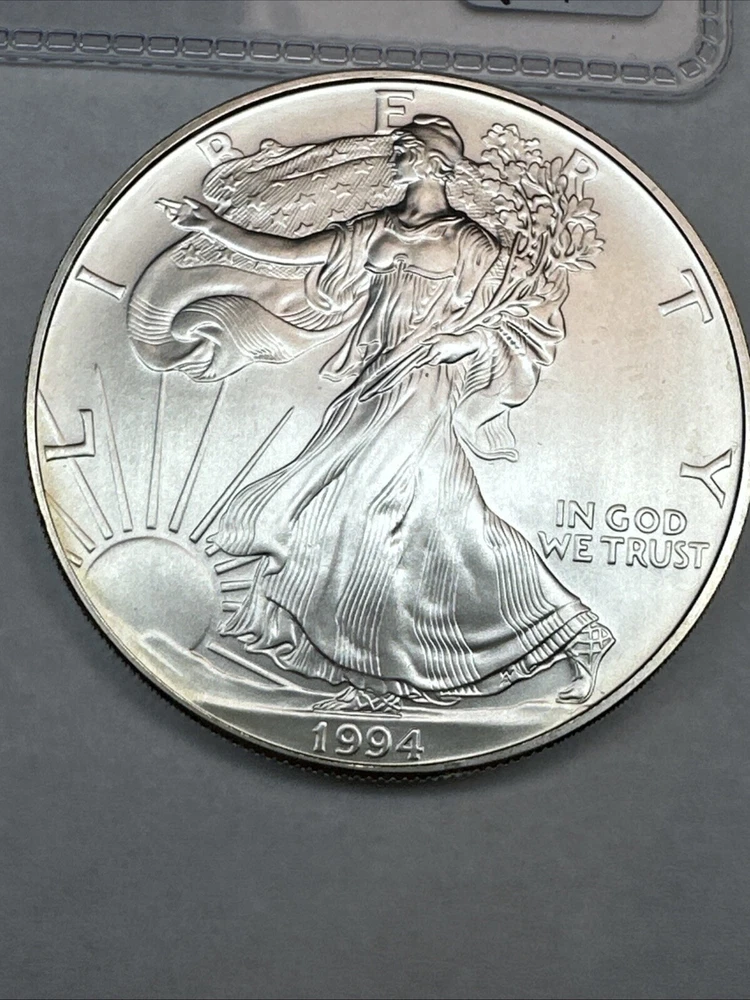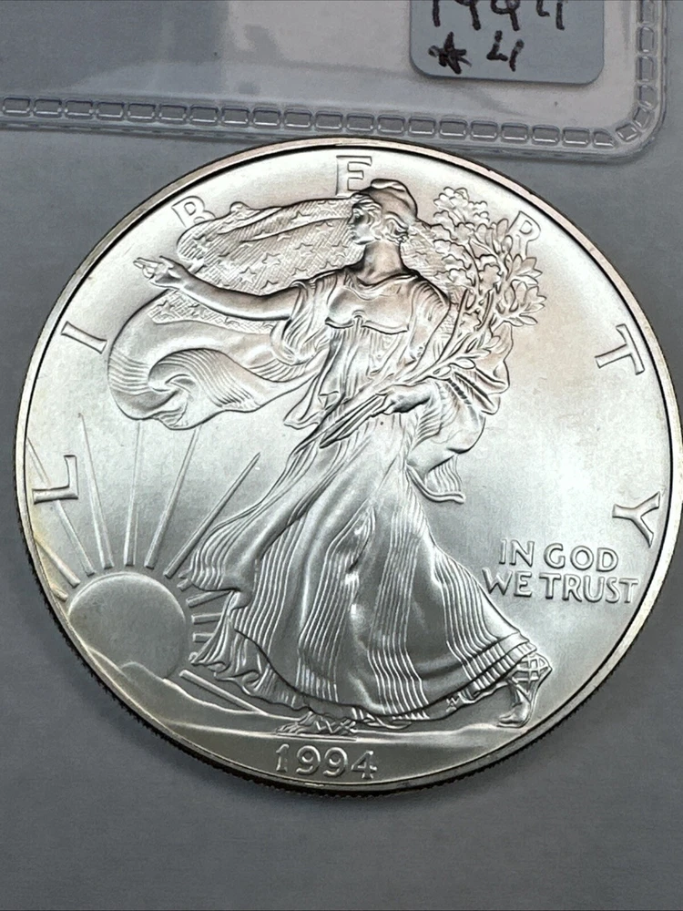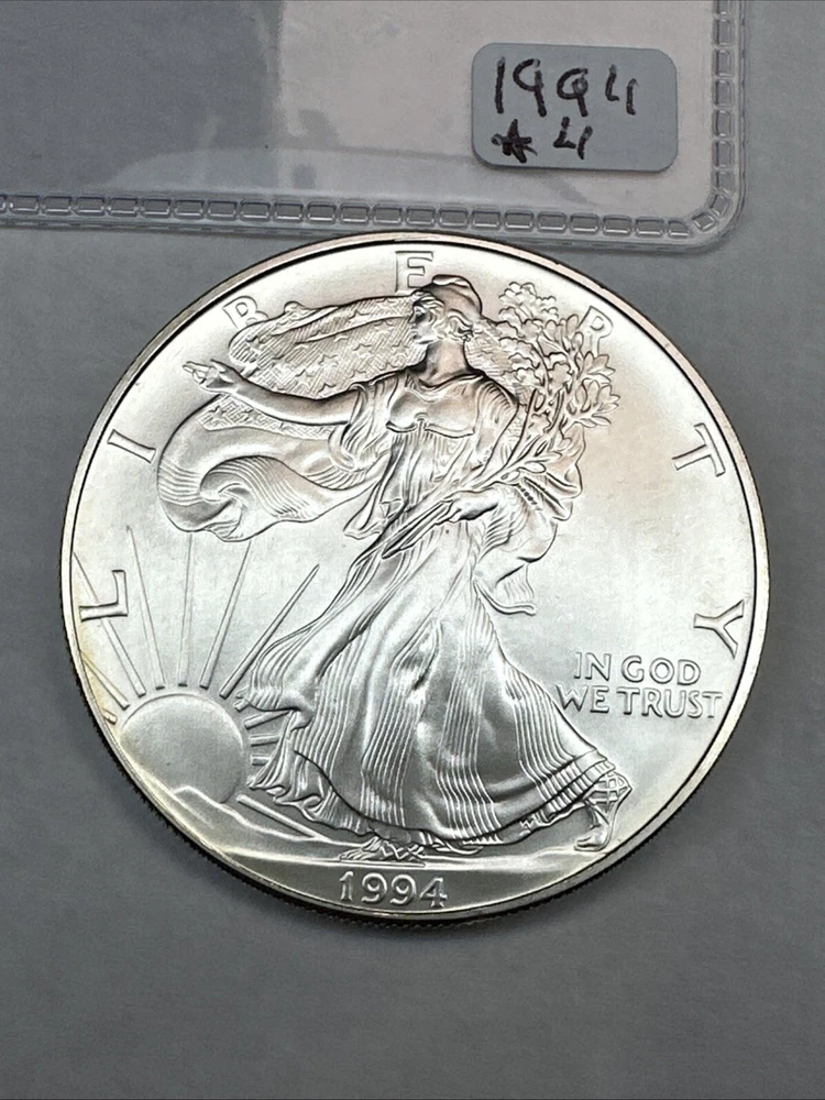 Certification: Uncertified Coin: American Eagle Fineness: 0.999 Grade: Ungraded Composition: Silver Country/Region of Manufacture: United States Total Precious Metal Content: 1oz Year: 1994 Brand/Mint: U.S. Mint Precious Metal Content per Unit: 1 oz Strike Type: Business