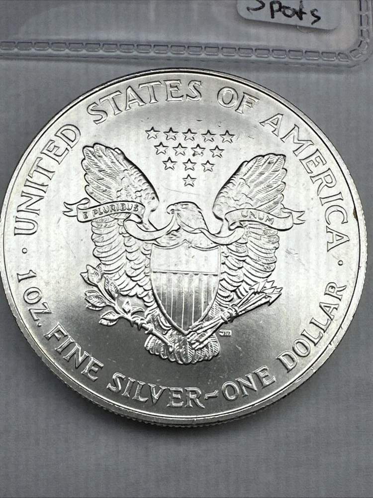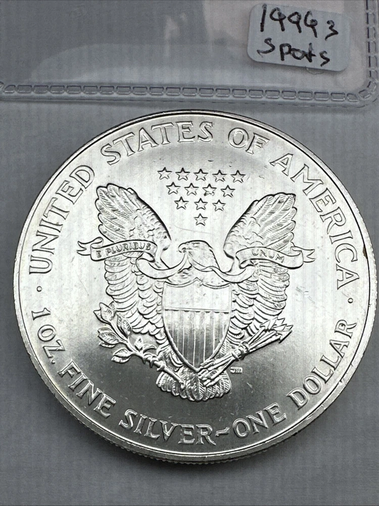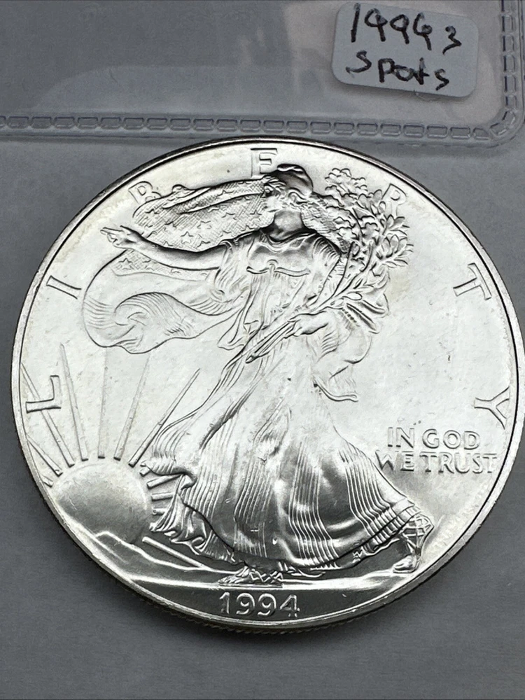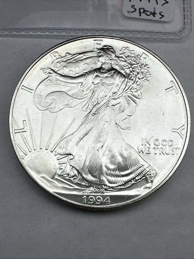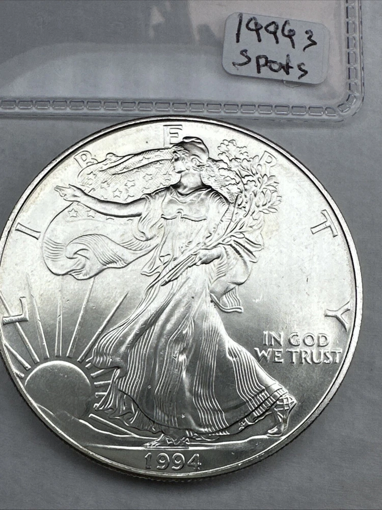 This is a 1994 1 oz American Silver Eagle coin minted by the U.S. Mint. It has a fineness of 0.999 fine silver and is uncirculated, with some spots. This key date coin features the iconic American Eagle design and contains a total of 1 oz of silver content.