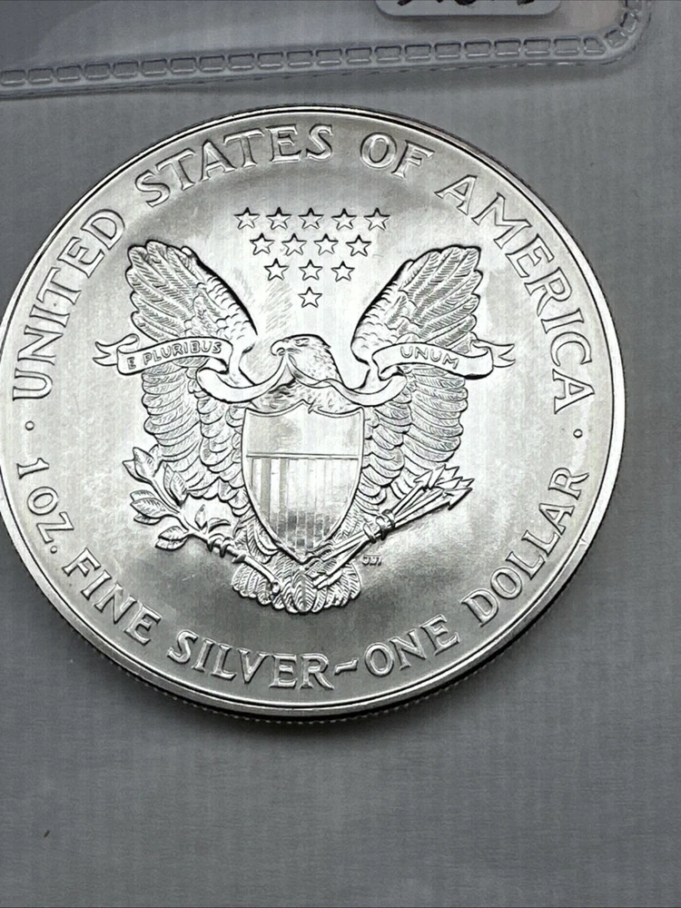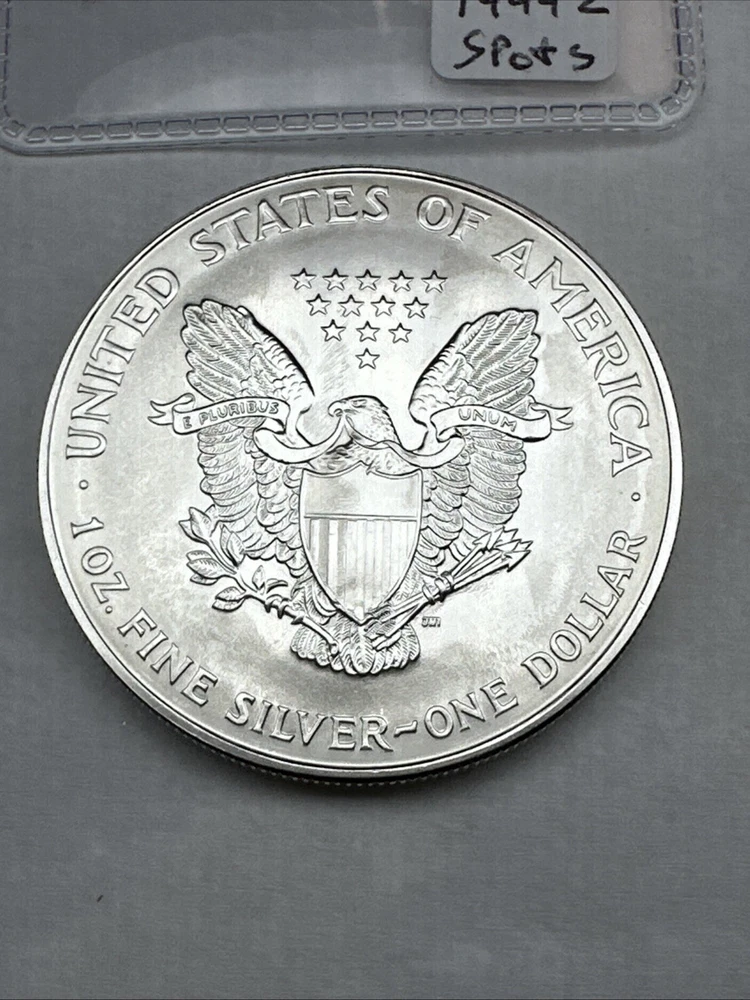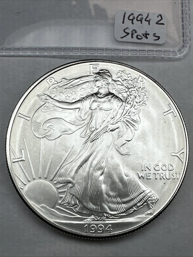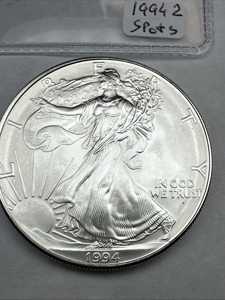 This is a 1994 1 oz American Silver Eagle coin minted by the U.S. Mint. It has a fineness of 0.999 fine silver and is uncirculated, with some spots. This key date coin features the iconic American Eagle design and contains a total of 1 oz of silver content.