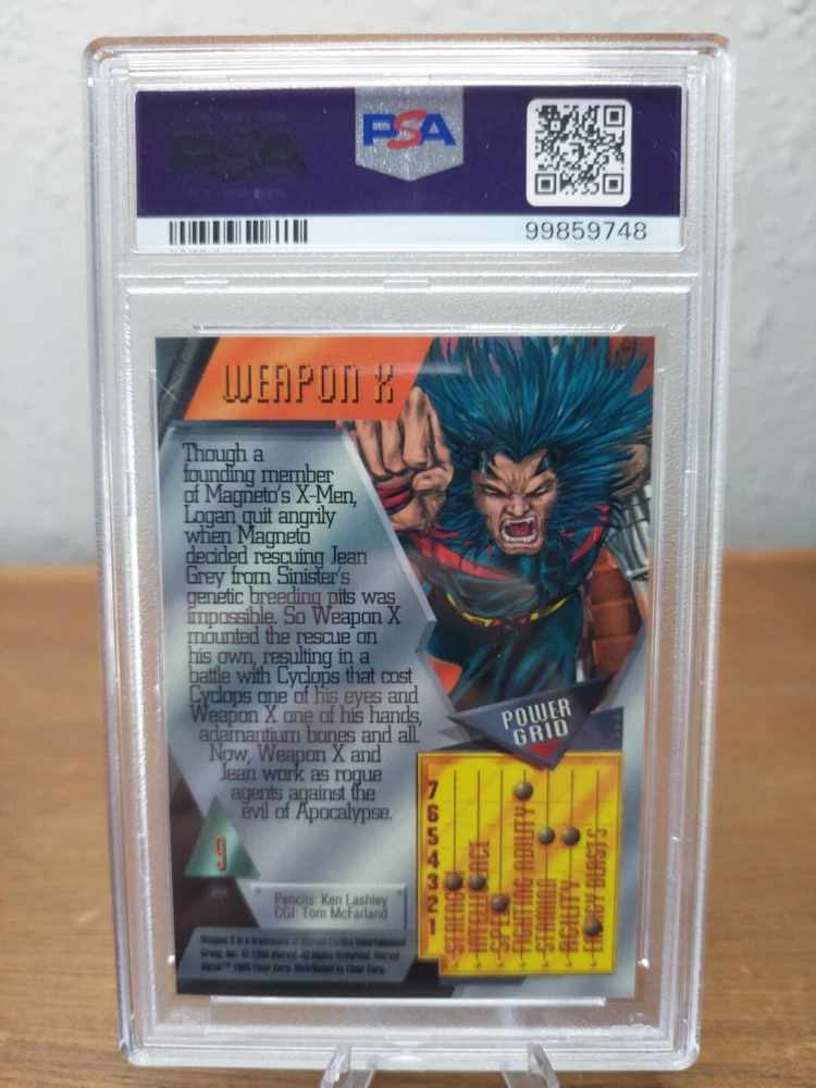 Up for sale is a 1995 Marvel Metal #9 non-sport trading card featuring Weapon X. This card is a part of the base set and has an embossed feature. It is a rare find with a low population report and has been graded PSA 9 Mint. The card was manufactured by Fleer in the United States and has not been autographed. The featured artists are Ken Lashley and Tom McFarland. The card belongs to the Marvel (MCU) franchise and is perfect for collectors of action, adventure, and comics genre cards.
