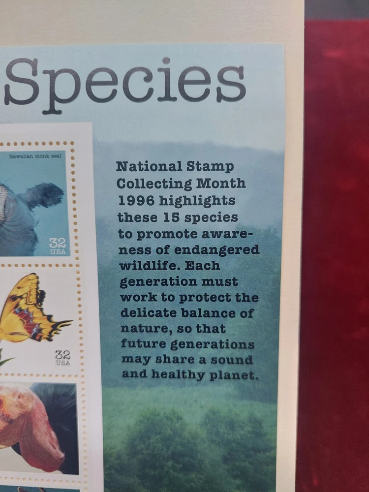 The 1996 Endangered Species Sheet of 15 Stamps is preowned and in near mint condition, they have no wear or tear on them and the have no damage to them either. They come as shown in the pictures provided. NOTICE WE ONLY SHIP TO THE CONTINENTAL U.S.A.