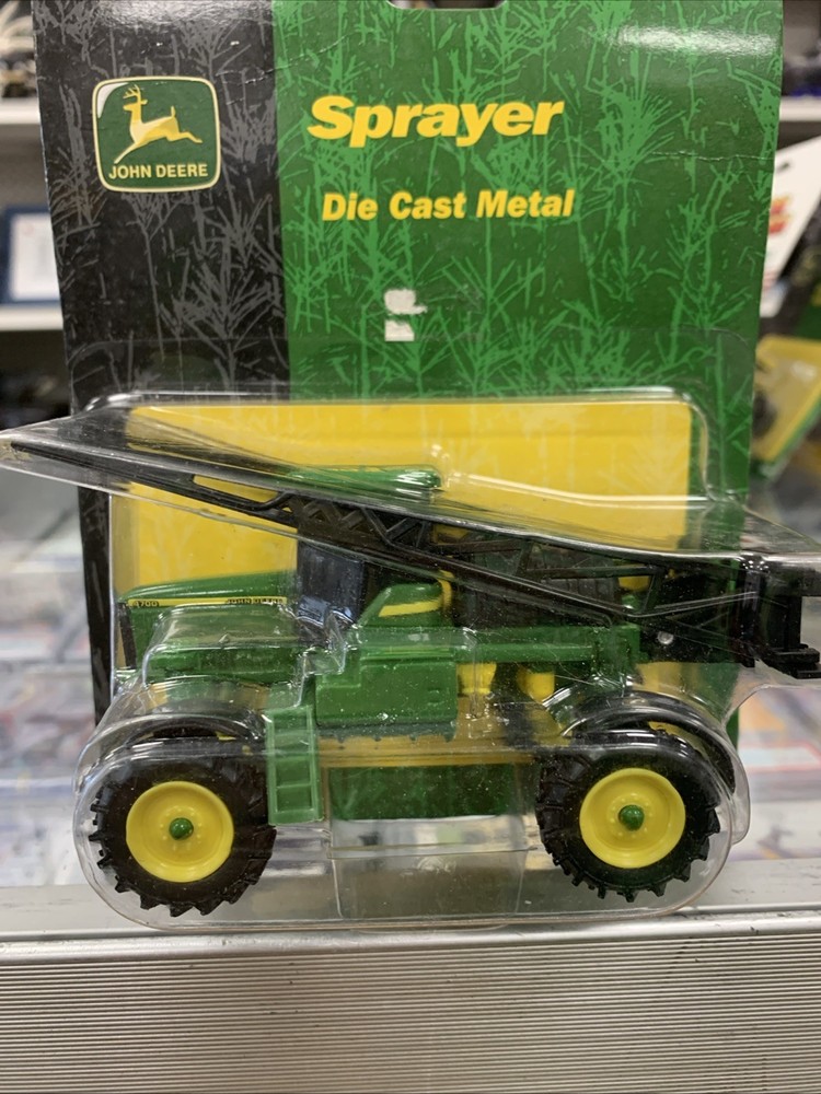 The product is a 1996 Ertl John Deere 4700 Field Sprayer in 1/64 scale, still in its original packaging. This die-cast metal toy vehicle features the iconic green color associated with John Deere equipment. The detailed design of the field sprayer makes it a great addition to any farm vehicle collection, especially for fans of the John Deere brand.