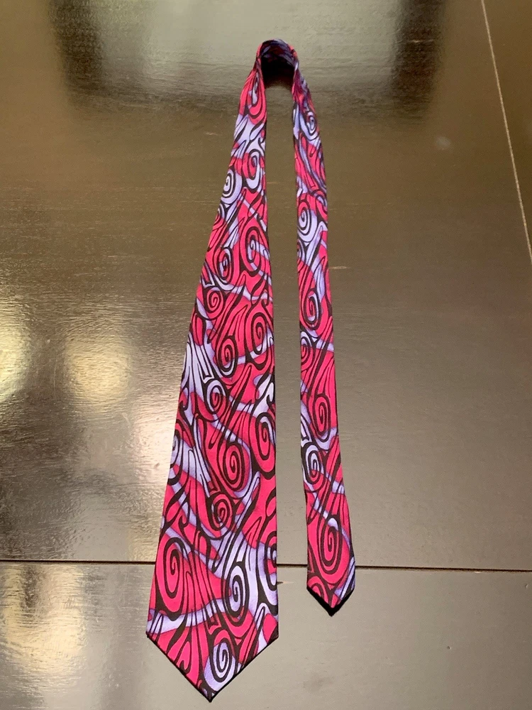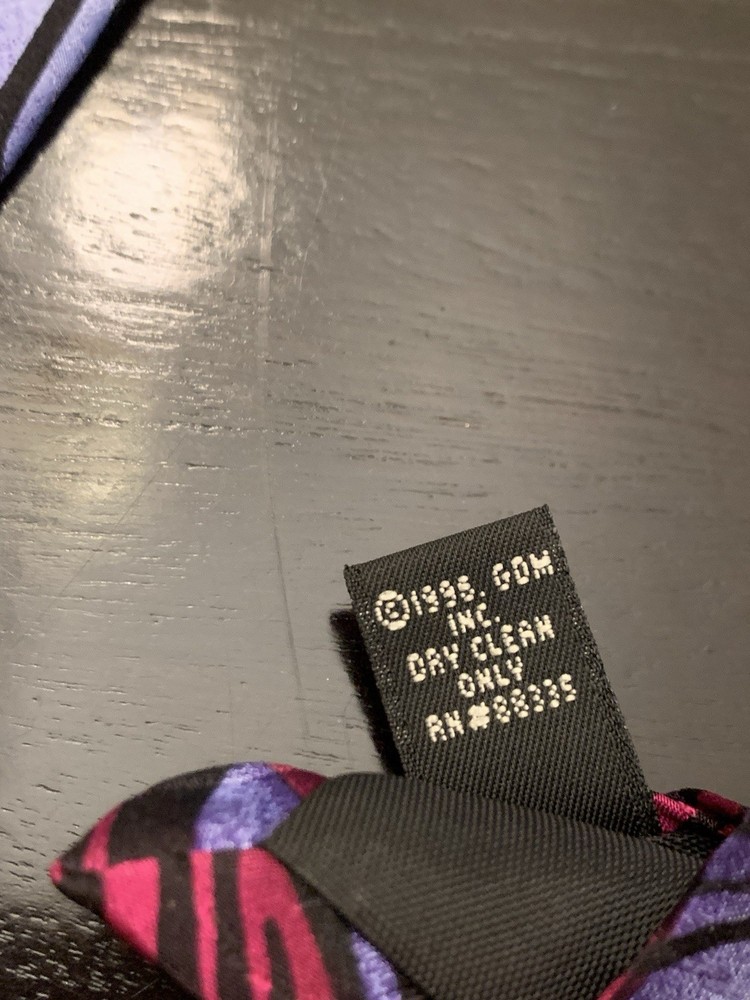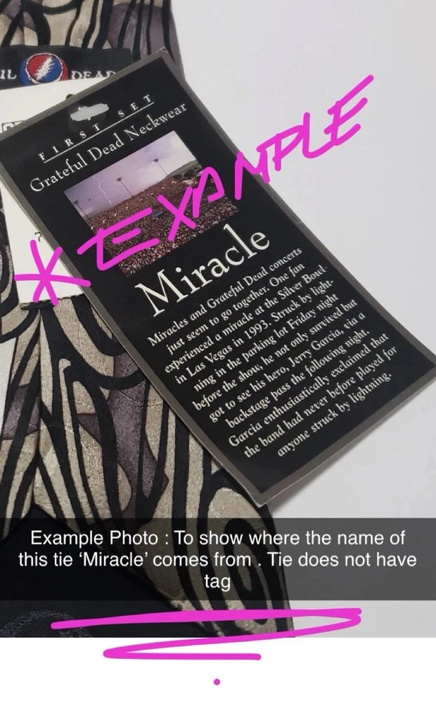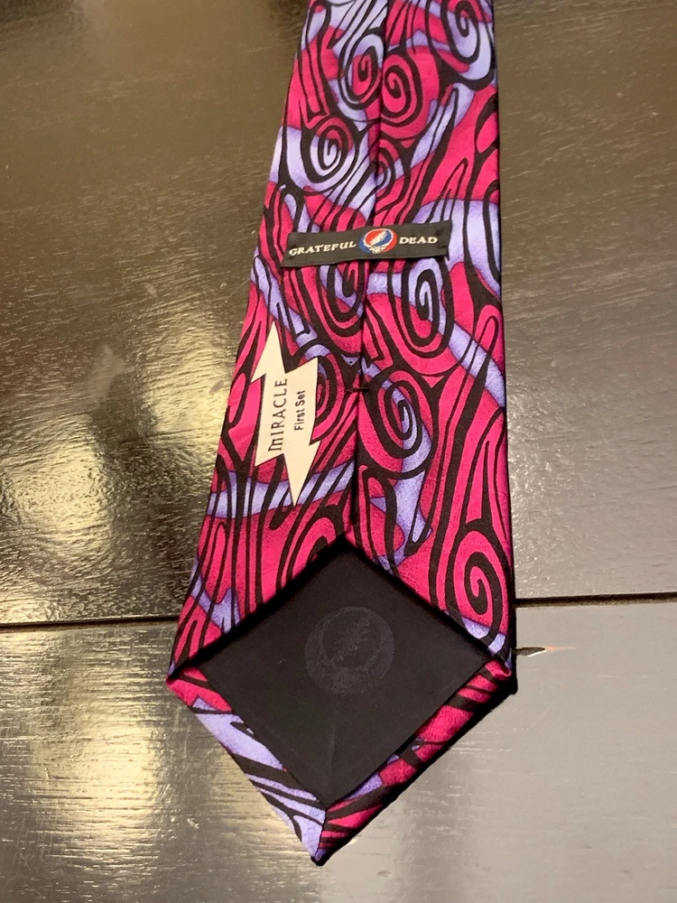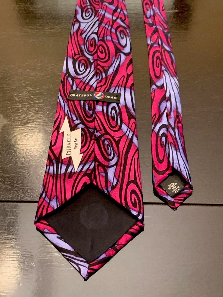 This neon fushia black tie with a hologram skull accent is the perfect addition to any Grateful Dead fan's wardrobe. The tie features a geometric pattern with skulls, the year 1996, and Jerry Garcia's name. Made from 100% silk, this vintage tie is of high quality and will make you stand out in any crowd. The tie is a wide short tie, measuring less than 57 inches in length. It is a first set tie from Miracle, a brand known for its unique and eye-catching designs. This tie is perfect for men who want to add a touch of the 90s and Grateful Dead to their outfit. Made in the United States, this tie is a must-have for any collector or fan.