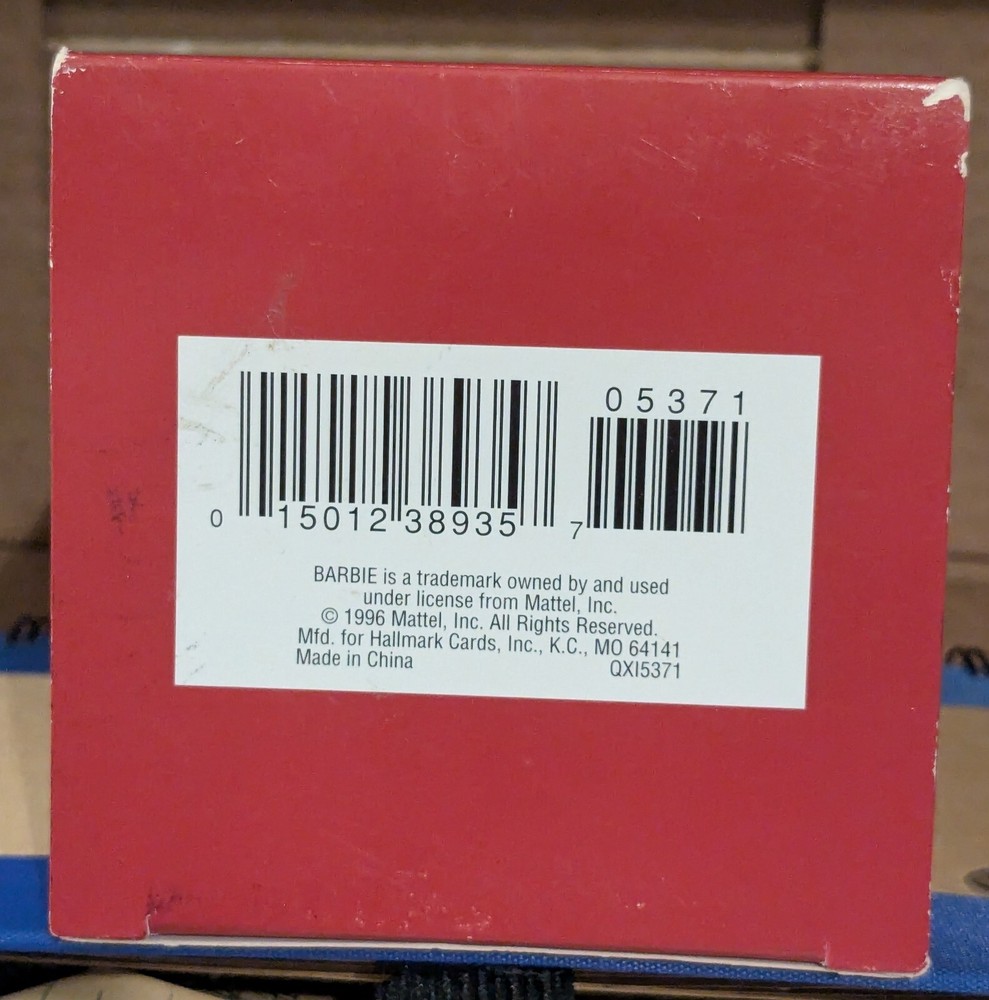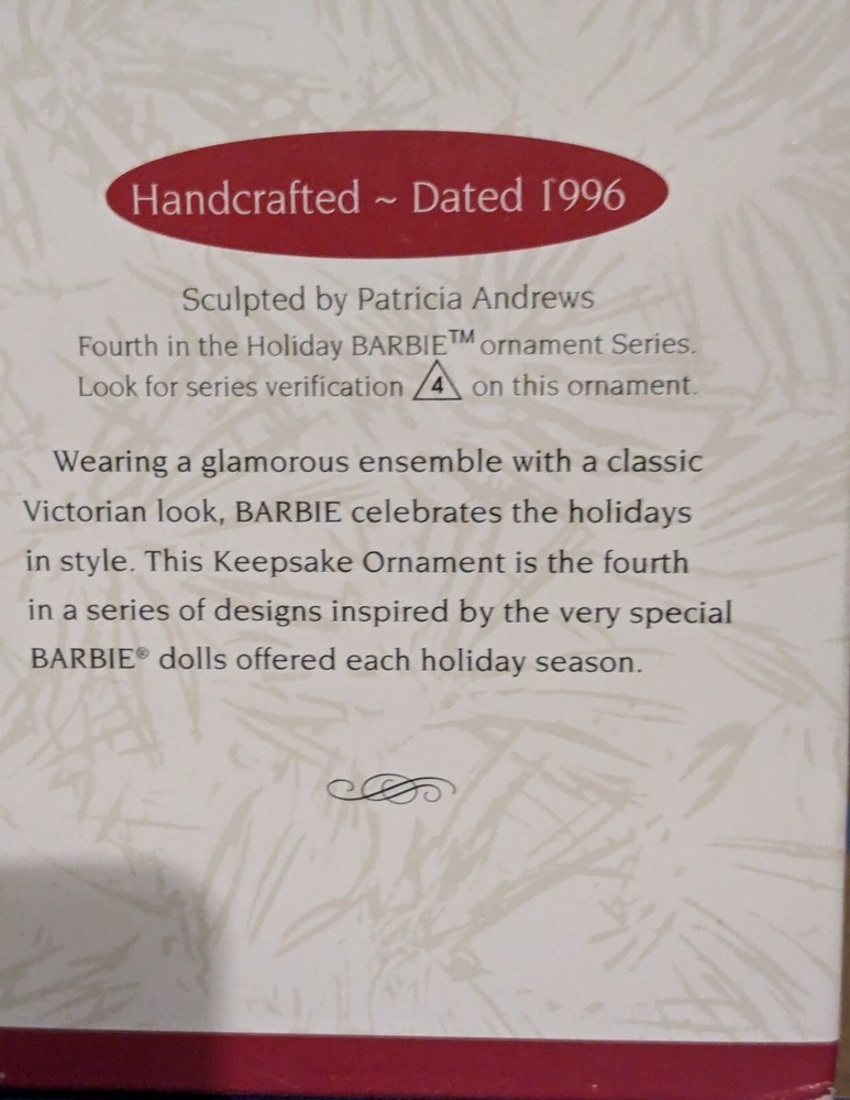Year: 1996 Number of Items: 1 Character: Holiday Barbie Brand: Hallmark Collection: Barbie Item Width: 4 in Time Period Manufactured: 1990-1999 Pattern: No Pattern Item Weight: 5 oz Personalize: No Material: Plastic Vintage: Yes Set Includes: Ornament Country/Region of Manufacture: China Handmade: No Theme: Holiday Color: Multicolor Department: Adult Size: Small Franchise: Barbie Item Height: 4 in Recipient: Multipurpose Subject: Barbie Age Level: Over 18 Years Shape: Barbie Style: Victorian Occasion: Christmas Item Length: 4 in Features: Artist Designed, Decorative, Hanging, Vintage, Limited Edition, Standing, Boxed Type: Ornament Antique: No Year Manufactured: 1996