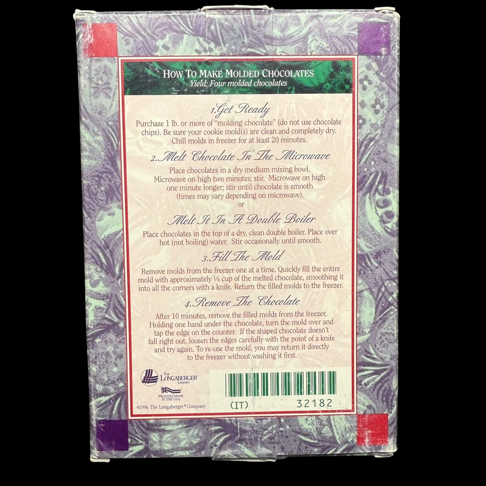 Piece is new in box with no condition issues. Outside box has very light wear. Mold measures 6.75"x4.75" Recipe for using mold as chocolate mold is printed on the back of the box.