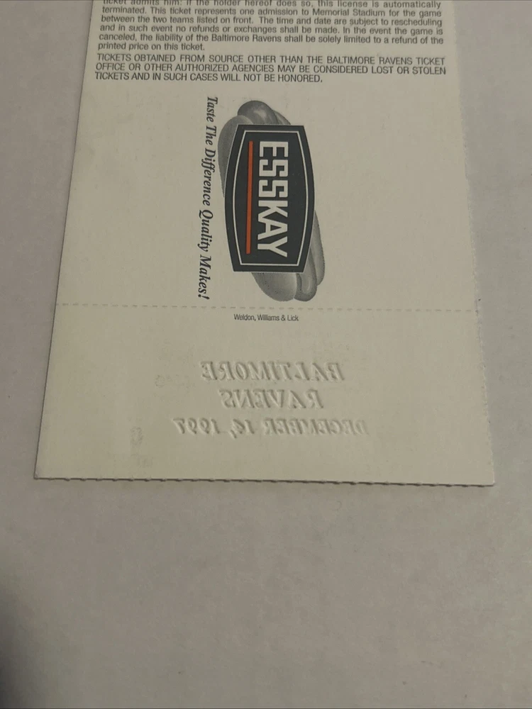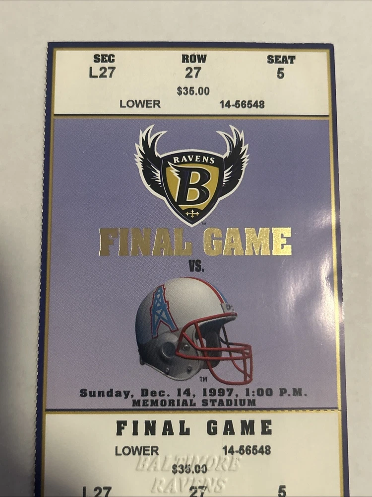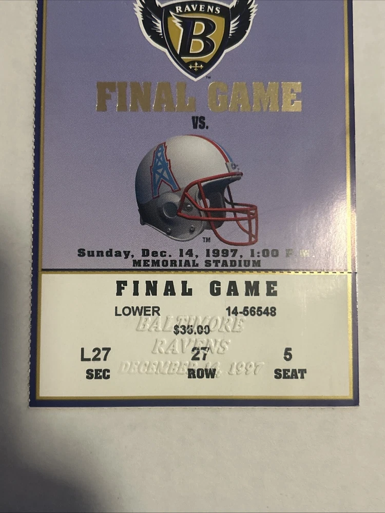 1997 Baltimore Ravens Final Game Ticket Stub at Memorial Stadium vs Houston Oilers - 12/14/97