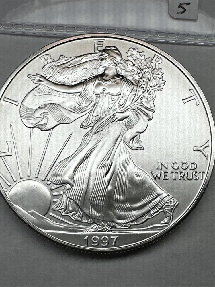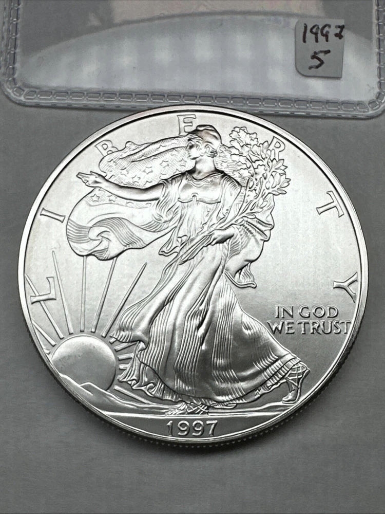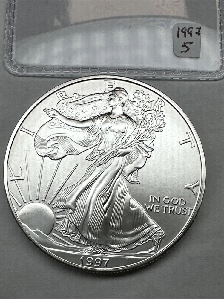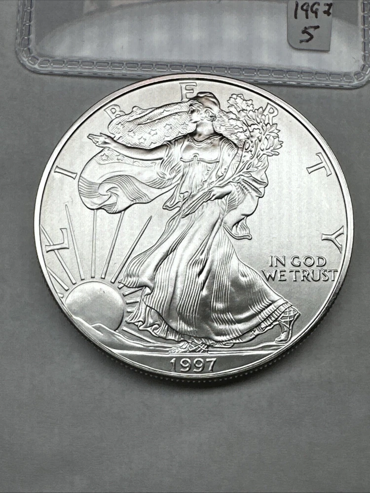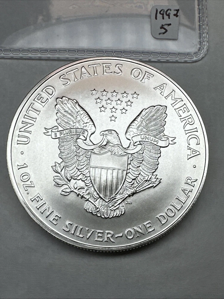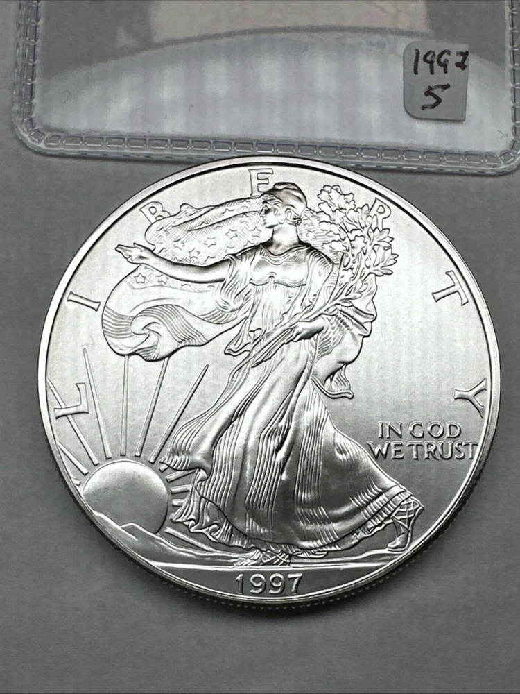 Certification: Uncertified Fineness: 0.999 Country/Region of Manufacture: United States Total Precious Metal Content: 1 oz Brand/Mint: U.S. Mint Strike Type: Business Grade: Ungraded Coin: American Eagle Precious Metal Content per Unit: 1 oz Year: 1997 Composition: Silver