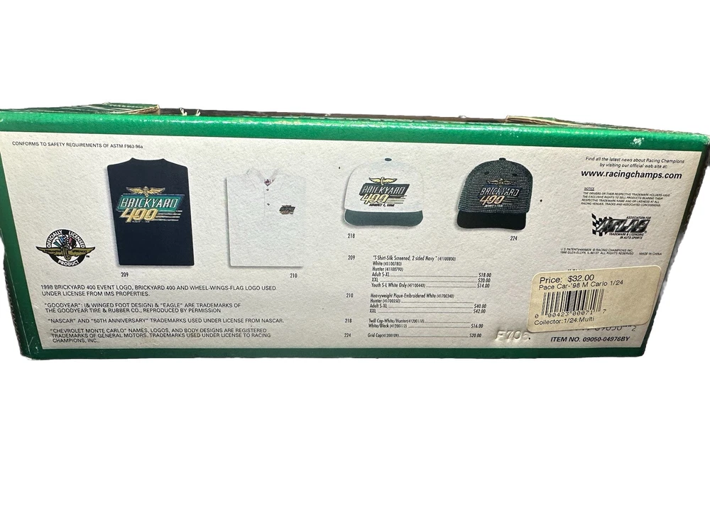 This 1998 Brickyard 400 Chevy Chevrolet Pace Car Replica 1:24 NASCAR is a must-have for any NASCAR fan or collector. The iconic car, featuring the Chevrolet logo and NASCAR branding, is beautifully detailed and perfectly sized for display or play. With its brand name Lionel, this diecast car is of the highest quality and will make a great addition to any collection. Whether you're a fan of the Cars character family or simply love sport and touring cars, this 1:24 scale model is sure to impress. Don't miss out on the chance to own this piece of NASCAR history.