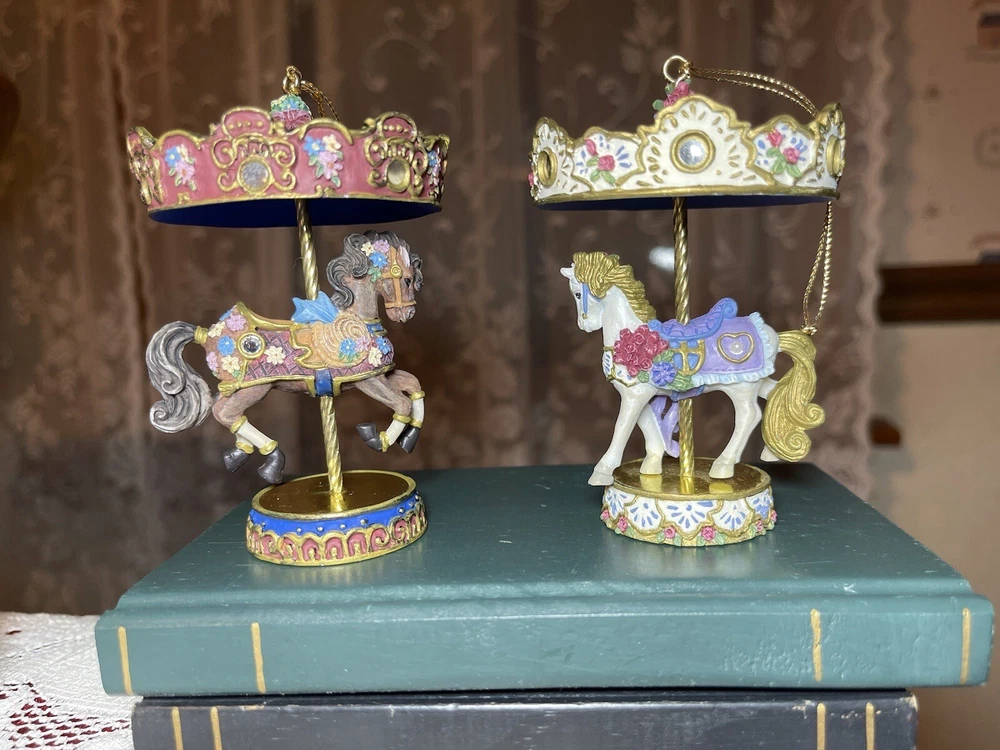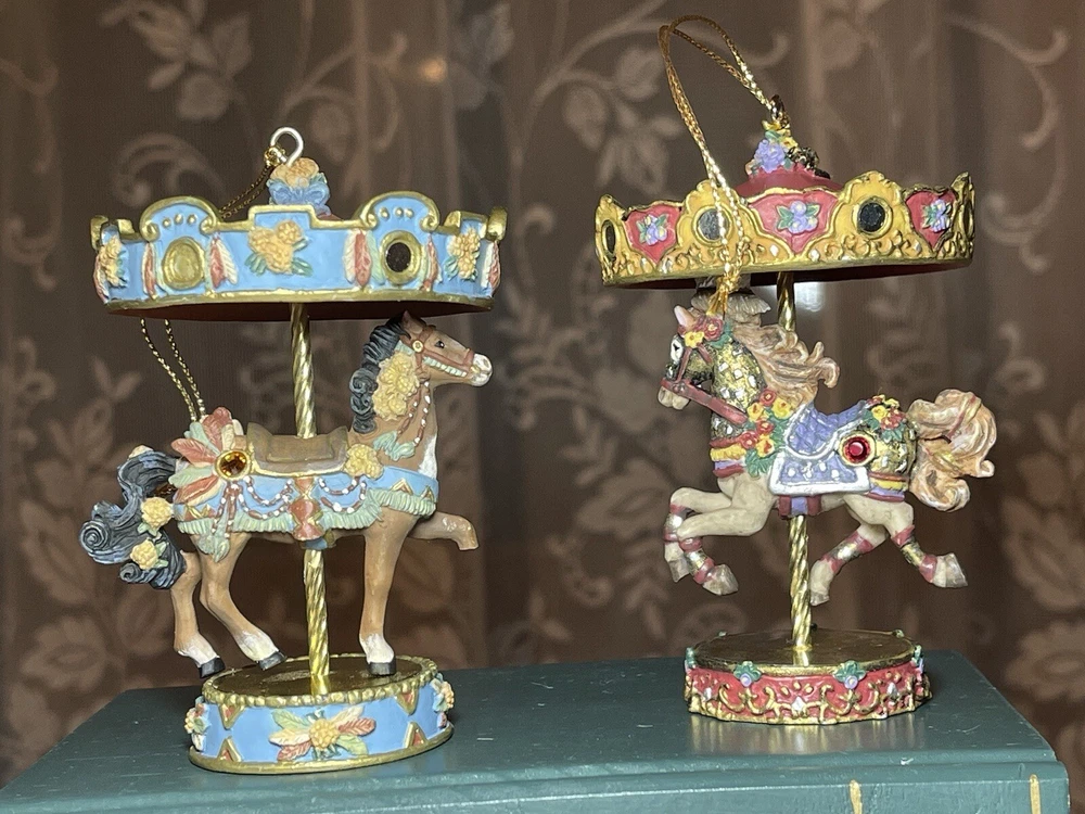 Enhance your holiday decorations with this beautiful set of 8 Bradford Edition Carousel Horse Ornaments. Crafted with exquisite details, these multicolored ornaments are perfect for any collector or horse lover. Each ornament portrays a different horse, representing a season or holiday, making them a great addition to your Christmas tree or year-round decor. The set includes a variety of horses from the Bradford Exchange, all manufactured in 1999. Don't miss out on this unique collection of carousel horse ornaments. Stones are intact on each side of horse except for one side, light green stone, on Summertime Cantor. I have relisted them and lowered the price because 4 of the 8 have repairs in the resin pictured and one with missing lower leg, can’t really tell on a tree but priced accordingly. These are really detailed and beautiful! Need a new home that would appreciate them.