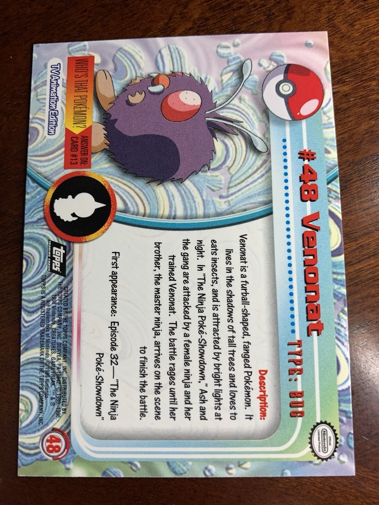 1999 Topps Pokemon TV Animation Black Logo #48 Venonat Up for sale is a 1999 Topps Pokemon TV Series card. Please review pictures as the card pictured is of the actual card that you will receive. The card will be placed in a penny sleeve and shipped in a cardboard box with delivery tracking. I have 100% positive feedback and have been selling items on ebay for many years. Let me know if you have any questions or need additional pictures and I will be happy to provide them. Yes - I do offer combined shipping. Additional shipping cost for each ungraded (raw) card is FREE and for each PSA graded item is only $0.50. Pokémon Official Trading Cards , informally known as Pokémon Trading Cards series 1 , was a set of Pokémon-themed trading cards manufactured by Topps in 1999. There were 90 cards in total: 76 Pokémon cards, 13 character cards, and a checklist card. Each of these 90 cards also had two foil card versions (silver and rainbow) in their main United States distributions. This set contained no bonus "chase cards". In the United States There were four different printings. These cards all had an oval Nintendo seal. The printings are distinguished by a blue, black, green, or red Topps logo, with card texts being updated between the first (blue) and second (black) printings. Due to an error, all foil cards after the first printing were printed with black logos, but can still be distinguished by the differences in their debossings. § 1st printing: blue logo on all cards, foil cards had a smooth texture with no debossings. § 2nd printing: black logo on all cards, Pokémon foil cards were debossed with rays and starbursts, while TV cards had a sandpaper finish. § 3rd printing: green logo on non-foil cards only, Pokémon foil cards were debossed with flames and teardrops, while TV cards had dots and rectangles. § 4th printing: red logo on non-foil cards only, Pokémon foil cards were debossed with Poké Balls and targets, while TV cards had dents. A fifth printing featuring foil cards with a smooth finish but a black logo (features of both the 1st and 2nd printings) was also produced to an uncertain extent. Pokémon Trading Cards series 2 was a set of Pokémon-themed trading cards manufactured by Topps in 2000. There were 72 cards in total: 41 Pokémon cards, 5 "Heroes & Villains" cards, 25 episode cards, and a checklist card. Each of these 72 cards also had two foil card versions (silver and rainbow). In addition, there were 27 bonus "chase cards" not included on the checklist, including 12 die-cut embossed cards, 10 animation stick-on cards, and 5 clear cards. Pokémon Trading Cards series 3 was a set of Pokémon-themed trading cards manufactured by Topps in 2000. There were 72 cards in total: 34 Pokémon cards, 12 "Heroes & Villains" cards, 19 episode cards, 6 puzzle cards, and a checklist card. Each of these 72 cards also had two foil card versions (silver and rainbow). In addition, there were 27 bonus "chase cards" not included on the checklist, including 12 die-cut embossed evolution cards, 10 pop-up cards, and 5 clear cards.