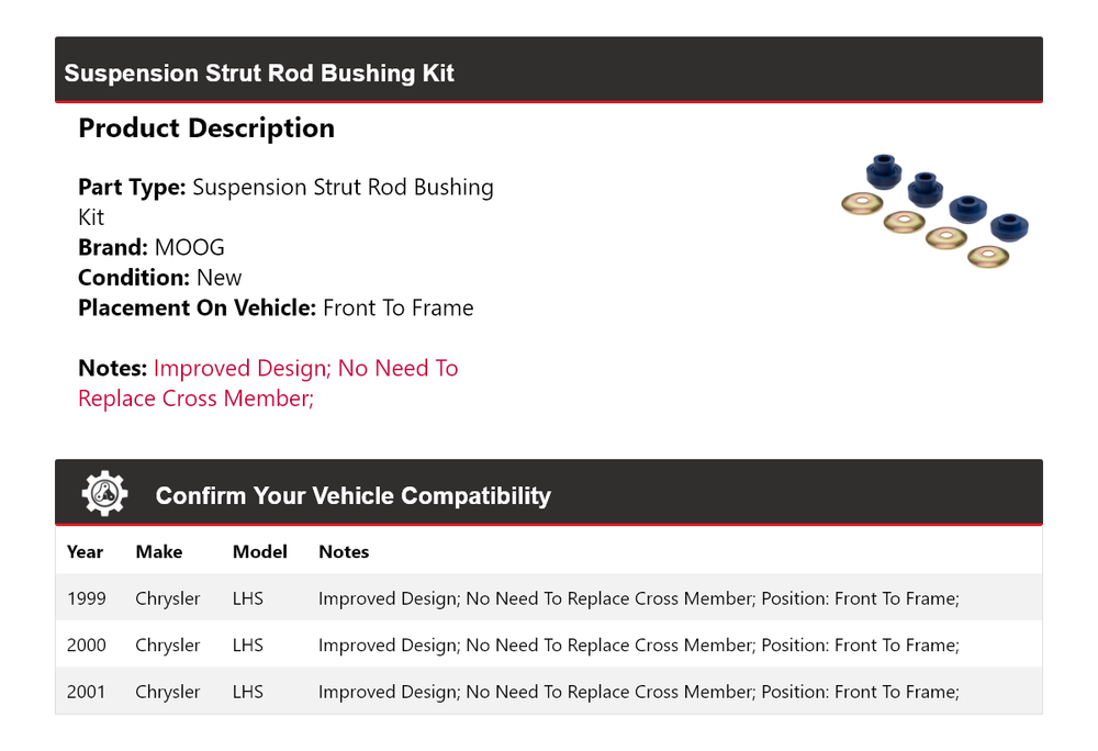 Document For 1999-2001 Chrysler LHS Suspension Strut Rod Bushing Kit Front To Frame MOOG Notes: Improved Design; No Need To Replace Cross Member; Placement on Vehicle: Front To Frame Product Description Description Brand: MOOG Warranty: 12 Month Warranty Part Type: Suspension Strut Rod Bushing Kit Compatible Years: 1999 2000 2001 Description Strt Rod Bushing Kit Front To Frame Suspension Strut Rod Bushing Kit Easy to install. Restores like-new steering and handling. Engineered to meet or exceed OE requirements. Construction and design validated by MOOG engineers. Incorporates proven design and engineering features. Item Specifics Bushing Inside Diameter: 0.800 IN Bushing Length: 1.830 IN Bushing Material: Polyurethane Meets/Exceeds OE Manufacturer Specs: Yes Bushing Outside Diameter: 2.240 IN Confirm Your Vehicle Compatibility Year Make Model Notes 1999 Chrysler LHS Improved Design|No Need To Replace Cross Member| Position: Front To Frame; 2000 Chrysler LHS Improved Design|No Need To Replace Cross Member| Position: Front To Frame; 2001 Chrysler LHS Improved Design|No Need To Replace Cross Member| Position: Front To Frame; Please read before purchasing Shipping and Cancellation Policy We utilize UPS, FedEx, and USPS for shipping, selecting the nearest available location to expedite delivery. Tracking numbers will be uploaded on eBay upon shipment. Most items are shipped on the same business day. Please note that interchange tables are intended for American Market Vehicles only. All orders are processed automatically. Before placing your order, please: Ensure that this part fits your vehicle by entering your vehicle's Year, Make, Model, Trim, and Engine in the Compatibility Table. Additionally, review the notes section in the compatibility chart for additional specifications about this part. If you're still unsure whether the part fits your car, please contact us for assistance. Verify that the item you're about to purchase will solve the problem with your car. Double-check that the delivery address provided during checkout is accurate. Return Policy We offer free returns for domestic purchases. However, please note that we are not responsible for the cost of international return shipping. Before returning items or leaving anything other than positive feedback, please contact us. For further details regarding returns, please refer to the "Shipping and Payments" tab. Additionally, it is important to understand that manufacturers reserve the right to modify the appearance or material of their items. They may even discontinue an item and replace it with an updated version. Consequently, the picture displayed may not always reflect the most recent changes, though this occurs rarely. We source our pictures directly from the manufacturer and may not immediately receive updated photos if changes are made. California Proposition 65 WARNING: This product may contain chemicals known to the State of California to cause cancer and birth defects or other reproductive harm. For more info go to www.p65warnings.ca.gov 2024 DTautoparts All Rights Reserved