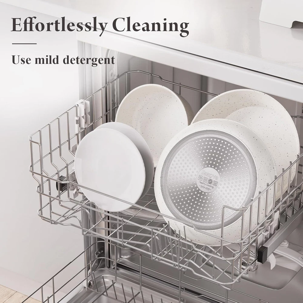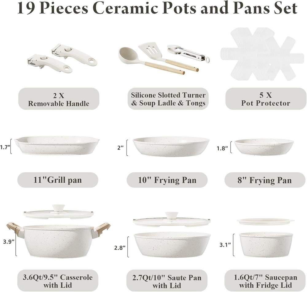 19 Pcs Pots and Pans Set Non Stick Ceramic Cookware Set with Removable Handles, Non Toxic Induction Kitchen Cookware Sets RV Cookware,Dishwasher/Oven Safe PFAS/PTFE/PFOA Free Cream White Item Description About this item Non Toxic Ceramic Coating - Made of natural ceramic, our kitchen cookware set is Teflon-free and guarantees no PFAS, PTFE, PFOA,PFOS, lead, or cadmium.Stain-resistant and durable for long-lasting use; Ideal choice for safety-conscious families, especially those with babies Optimized Storage Idea - Save 70% space by neatly stacking pots and pans in cabinets. Whether you have limited storage or simply wish to keep your kitchen neat and organized, our stackable cookware will be your go-to choice Innovative Detachable Handles - The detachable handles can be effortlessly removed and reattached whenever needed. Transform pots with a "CLICK" into baking dishes, serving plates, or fridge storage, enhancing versatility Ultra Non-Stick Performance - With a non-stick surface, these cookware set ensures effortless food release. Also it requires less oil or butter for healthier cooking options Easy Cleaning - While our cookware is dishwasher-safe for your convenience, we highly recommend handwashing. A simple rinse or quick wipe effortlessly removes any residue. Detach the handle when not in use while heating, care better for a longer life span. Universal Cooktop Compatibility: Enlarged, thickened magnetic base ensures compatibility with all stovetops, including induction and oven; Crafted from recyclable aluminum ensures lightweight yet sturdy, and promotes rapid and even heating 19-Piece Set Includes: 8-inch & 10-inch Frying Pan,1.6Qt/7-inch Saucepan & 3.6Qt/9.5-inch Casserole,2.7Qt/10-inch Sauté Pan & 11-inch Grill Pan,Removable Handles *2, 9.5-inch & 10-inch Silicone Lid,7" Fridge Lid, Silicone Utensils *3(Slotted Turner&Soup Ladle&Tongs), Pot Protectors *5 › See more product details *PFAS/PTFE/PFOA Free Natural Material Coating, Perform Well on Low to Medium Heat Safety First - Our cookware features natural ceramic nonstick,setting it apart from Teflon - free from harmful chemicals and heavy metals such as PFAS,PTFE,PFOA,lead, and cadmium.Prioritize your health with a toxic-free cooking experience.Built for Last - Stain & scratch-resistant,keeps great nonstick performance. With good care and reasonable use, our ceramic cookware could stay quite long even after years. *Safety First - Our cookware features natural ceramic nonstick,setting it apart from Teflon - free from harmful chemicals and heavy metals such as PFAS,PTFE,PFOA,lead, and cadmium.Prioritize your health with a toxic-free cooking experience. *Built for Last - Stain & scratch-resistant,keeps great nonstick performance. With good care and reasonable use, our ceramic cookware could stay quite long even after years. *Stay Away from Annoying Stains Ultra Smooth & Nonstick Smooth interior surface makes it exceptionally nonstick - you can effortlessly cook your favorite dishes without worrying about food sticking to the pans. *Hand Wash Recommend/Dishwasher Safe Cleaning Could Be Such a Breeze The non-stick feature not only enhances your cooking experience but also makes cleaning up a breeze. Say goodbye to stubborn food remnants and sticky residue! With just a quick wipe or gentle hand wash, these pans are ready to shine again. *Quick Dishes Serving Unlock the boundless potential of the cookware with its detachable handle – perfect for cooking on any stovetop or serving as elegant dinnerware on the table. *Easy Baking Prep From stovetop to oven, you can seamlessly transition from sautéing ingredients to finishing off your dish in the oven without having to transfer your food to a separate baking dish. This versatility not only saves time but also ensures even heat distribution for consistent cooking results. *Simple Fridge Store Store leftovers in the fridge with the included lids to minimize waste. *Fast Water Strain The build-in strainer at the edge of the lid can easily filter water or soup, without worrying the food will fall through. *Free Outdoor Cooking Detachable handle significantly reduces the size and weight of the cookware, making it incredibly portable and space-saving. Now you can effortlessly pack your cookware set for outdoor picnics, camping trips, or fitting it snugly in your RV kitchen. Introducing our innovative Removable Handle Cookware Set, designed to revolutionize your cooking experience. With seamless flexibility at just a click, this set offers endless possibilities that traditional cookware simply cannot achieve. Smooth interior surface makes it exceptionally nonstick - you can effortlessly cook your favorite dishes without worrying about food sticking to the pans. The non-stick feature not only enhances your cooking experience but also makes cleaning up a breeze. Say goodbye to stubborn food remnants and sticky residue! With just a quick wipe or gentle hand wash, these pans are ready to shine again. Unlock the boundless potential of the cookware with its detachable handle – perfect for cooking on any stovetop or serving as elegant dinnerware on the table. From stovetop to oven, you can seamlessly transition from sautéing ingredients to finishing off your dish in the oven without having to transfer your food to a separate baking dish. This versatility not only saves time but also ensures even heat distribution for consistent cooking results. Store leftovers in the fridge with the included lids to minimize waste. The build-in strainer at the edge of the lid can easily filter water or soup, without worrying the food will fall through. Detachable handle significantly reduces the size and weight of the cookware, making it incredibly portable and space-saving. Now you can effortlessly pack your cookware set for outdoor picnics, camping trips, or fitting it snugly in your RV kitchen. Constructed with enlarged aluminum conductive base, heat could transfer quickly and evenly. Whether you're seari