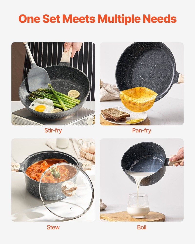 Features: · 19-Piece Cookware Set: A versatile pots and pans set that includes: 6in sauce pan with lid, 7in sauce pan with lid, 8in frying pan, 9in frying pan, 11in frying pan, 11in saute pan with lid, 11in stockpot with lid, 11in square grill pan, 2 10x10in pan protectors, 3 14x14in pan protectors, silicone spoon, silicone shovel · Premium Material: Made with a Maifan stone non-stick coating, this cookware set ensures easy food release and effortless cleaning. The interior withstands temperatures up to 380°C, making it reliable for daily use. The cookware does not include lead, cadmium, and PFOA. Cook with less oil for a healthier meal experience · Compatible with All Stovetops: Crafted from 2.5mm thick aluminum, the rv cookware base heats quickly and evenly. The high-magnetic conductive bottom makes it suitable for all stovetops, including gas, electric, and induction · Multi-Purpose Cookware: Versatile and functional, this space saving pots set seamlessly transitions from stovetop to grill, and tabletop. Its elegant and modern design enhances the presentation of your dining experience · User-Friendly Design: Featuring heat-resistant silicone handles, this kitchen cooking set provides a comfortable grip while preventing burns. The transparent glass lids allow for easy monitoring of your food while cooking. Effortless to clean, it wipes down in seconds, making kitchen maintenance simple.