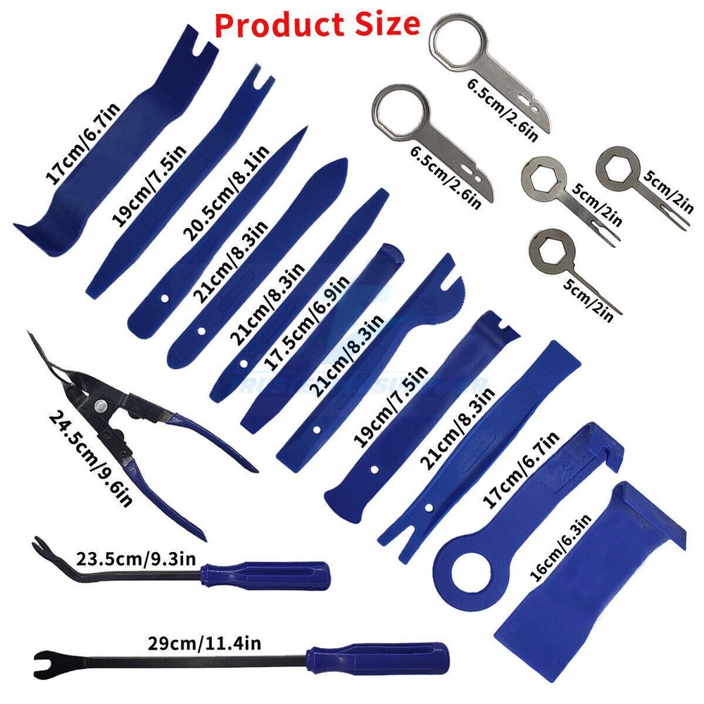 Product Description 19x Car Trim Removal Tool Set Hand Tools Pry Bar Panel Door Interior Clip Kit US Product Description: Multi-use Purposes - 19pcs specially designed trimming tools, excellent forautomotive, marine, furniture or aircraft trim removal and installation, including door panels, moldings, window trims, clips, fasteners, emblems, panels, radios, ect. Meets All Needs - The profectional tools can fit all types of car modifications. And its ergonomic design and lightweight help you efficiently handle various interior and exterior car trimming with ease Premium Quality Material- Made of durable and impact resistant nylon fiber, won't break like the ABS ones. It is eco-friendly, non-toxic and breakage-proof, abrasion and corrosion resistant for long lasting durability. Harmless to Car- The moderate curve design is anti-scratches and harmless to car paint. Easy Storage and Higly Portable- Come with nice zipper storage pouch. each tool can be stored properly so that you don’t misplace or lose them. The special hand strap desgin can free your hands for other works and improve its portability. Multi-Function Tools: 1.Trim Removal Tools 2.Clip Removal Pliers 3.Precision Hook Pick 4.Stereo Removal Tools 5.U-shaped Removal Tool 6.Car Terminal Removal Tools 7.Upholstery Fastener Removers Product Specifications: Color: Blue Material: Polypropylene material Size: 320 * 233 * 50 Suitable for 1: Car radio/radio, door trim, installation clips Suitable for 2: Dome lights, windows, audio CD control area, and interior Packaging included: 11 x interior disassembly tool 2 release tools 4 stereo disassembly tools 1 ceiling light clanking sound 1 portable zippered storage bag About Us Payment Shipping Returns Contact Us 1. Unless specified otherwise, all our products are IN STOCK and are shipped from USA Local warehouse - Not Overseas! 2. We provide a 30 day Satisfaction Guarantee or your money back (provided items are in the same new and resaleable condition.) 3. We have a PayPal Verified Business Account, please buy with Confidence! 4. Every item will be tesrted before send.We know our products well and if we don't have the answers we will do our best to find them for you! 5. Our friendly team look forward to serving you! Your satisfaction is our No.1 Priority We will do our best to satisfacy you. 1.Paypal, Credit Card, G Pay etc, many payment way is accepted. 2.Please be sure your shipping address is correct before make a payment. 1.We will ship out the item within 1-3 business days after comfirming the payment, appreciate your patience. 2.If the items are broken on the way(we will check the orders clearly before we sent them),please contact us in 3 days you received it. We will send you a new one or refund your payment. 1.We stand behind every buyer.Items can be returned for exchange or refund within 30 days. 2.Please contact us when you have any confusion of our item, we will solve the trouble for you as soon as possible. 1.This is professional Seller.We will reply your message within 24 hours. 2.Please contact us whenever you have any question about the item. We will deal with it as soon as possible. 3. If you are unhappy with the item or our service,please Contact Us before leave feedback,just give me a chance,thank you! About Us 1. Unless specified otherwise, all our products are IN STOCK and are shipped from USA Local warehouse - Not Overseas! 2. We provide a 30 day Satisfaction Guarantee or your money back (provided items are in the same new and resaleable condition.) 3. We have a PayPal Verified Business Account, please buy with Confidence! 4. Every item will be tesrted before send.We know our products well and if we don't have the answers we will do our best to find them for you! 5. Our friendly team look forward to serving you! Your satisfaction is our No.1 Priority We will do our best to satisfacy you. Payment 1.Paypal, Credit Card, G Pay etc, many payment way is accepted. 2.Please be sure your shipping address is correct before make a payment. Shipping 1.We will ship out the item within 1-3 business days after comfirming the payment, appreciate your patience. 2.If the items are broken on the way(we will check the orders clearly before we sent them),please contact us in 3 days you received it. We will send you a new one or refund your payment. Returns 1.We stand behind every buyer.Items can be returned for exchange or refund within 30 days. 2.Please contact us when you have any confusion of our item, we will solve the trouble for you as soon as possible. Contact Us 1.This is professional Seller.We will reply your message within 24 hours. 2.Please contact us whenever you have any question about the item. We will deal with it as soon as possible. 3. If you are unhappy with the item or our service,please Contact Us before leave feedback,just give me a chance,thank you! You may also like 12V Smart Car Battery Charger Automatic Lifepo4 Repair Maintainer Trickle 15.69 USD 17.89 USD Free shipping 12% off 650Pcs Car Retainer Auto Fasteners Push Trim Plastic Clips Pin Rivet Bumper Kit 11.69 USD Free shipping 3in1 52mm 2" Chrome Car Triple Gauge Set Kit Water Temp Oil Pressure Volt Meter 20.89 USD Free shipping 2 Roll x 2" 50FT Black Exhaust Wrap Header Manifold Fiberglass Heat Wrap Tape 20.69 USD 22.75 USD Free shipping 9% off Hitch Pin Lock with 2 Keys and Cover Truck Trailer Receiver Hitch 5/8" Locking 11.88 USD Free shipping Remote Battery Disconnect Switch 12V/24V 240A Kill Switch LED Voltmeter Display- 26.5 USD 27.89 USD Free shipping 5% off powered by