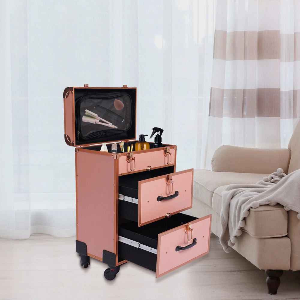 Description This is a movable multi-layered makeup case designed for professional beauty artists to make up anytime and anywhere. This rolling makeup case is constructed of high-quality aluminum alloy that is sturdy and durable. It has extra large capacity compartments and multi-layer drawers. This case is ideal for all people who love beauty or nail art. Key Features High-quality Materials: The frame of the makeup case is wrapped with high-quality aluminum alloy, which will not easily rust and fade. And the thicker, all-aluminum drawbar makes the case more stable, refusing to shake. Large Capacity: This makeup case has 3 layers, the top layer can store nail polish or lipstick; the bottom two drawers can store full-size cosmetics and beauty appliances, such as perms, manicure mac 1*Alu Travel Rolling Makeup Train Case Cosmetic Trolley Makeup Storage Organizer Description This is a movable multi-layered makeup case designed for professional beauty artists to make up anytime and anywhere. This rolling makeup case is constructed of high-quality aluminum alloy that is sturdy and durable. It has extra large capacity compartments and multi-layer drawers. This case is ideal for all people who love beauty or nail art. Key Features High-quality Materials: The frame of the makeup case is wrapped with high-quality aluminum alloy, which will not easily rust and fade. And the thicker, all-aluminum drawbar makes the case more stable, refusing to shake. Large Capacity: This makeup case has 3 layers, the top layer can store nail polish or lipstick; the bottom two drawers can store full-size cosmetics and beauty appliances, such as perms, manicure machines and light therapy supplies. This multifunctional product can meet your storage needs. Excellent Weight-bearing Capacity: The rectangular construction and aluminum alloy frame give the case a superb load-bearing capacity (up to 110.3 lbs). You can safely put all your hair and beauty tools on it. Sorted Storage: Beauty products with different functions and sizes are stored in the corresponding drawer and compartment, making the tools ranged orderly, so it is convenient for you to quickly find the tools you want. Easy to Move and Carry: The universal wheels are easy to move and very convenient, especially for nail salons and beauty salons that have a lot of tools and need to move frequently. And it comes with a telescopic pull bar ( maximum length is 32.7inchs ) and a top handle, which is easy to carry on trips and business trips. Stylish Appearance: This rolling make-up case gives a stylish and exquisite look with its simple construc tion and stylish gold . Such a retro make-up case will decorate your dressing room well and make a good impression when you are working outside. Secure & Reliable: The metal locks of the case protect the contents securely and the lockable design ensures security and privacy. Worry-free Service: We have been working hard to provide better service and quality for our customers, which is our goal. If there is any quality problem with our products. Please contact us in time. Details Transparent Storage Bag: The transparent storage bag on the inside of the lid allows for wet and dry storage, for example, you can store wet beauty eggs and powder puffs to avoid cross-contamination. Rounded Edges: The top of the cosmetic case has been designed with rounded corners rather than sharp edges to avoid scuffing. Reinforced Lock: Reinforced lock not only makes it convenient for you to open and close, but also does not affect the appearance, and solves the embarrassment of bursting when going out. Application This rolling make-up case is suitable for professional make-up artists, hairdressers, nail technicians, and beauticians in beauty centers, salons, private homes, parties, and other occasions. Specification Number of Layers: 3 Color: Gold Material: Aluminum Alloy Frame and Plastic Fireproof Board Panel Shape: Rectangular Processing Method: Frosted Rolling Wheel Style: Universal Wheel Carrying Parts: Retractable Handle Gross Weight: 9kg/ 19.8lbs Net Weight: 7.5kg/16.5lbs Package Size: 57*42*32cm/22.4*16.5*12.6inch Product Size: 36*23*58cm/14.2*9.1*22.8in Maximum Load: 50kg/110.3lbs Package Included 1 x Makeup Case 4 x Universal Wheels 2 x Keys Notes Please allow the slight color difference caused by the shooting light and 1-3cm error due to manual measurement, and make sure you do not mind before you order. Welcome to Rongorange View more↓ Payment Delivery details Terms of sales About us Contact us Payment We accept ebay payment 。 Fees such as import duties, taxes are not included in the item price or shipping costs. These charges are the buyer's responsibility. Delivery details Shipping: 2-9 working days to: USA Terms of sales We maintain high standards of excellence and strive for hundred percent customer satisfaction. Feedback is very important to us. We hope that you contact us immediately before you give neutral or negative feedback, so that we can address your concerns. It is impossible to address issues if we do not know about them! About us Your satis faction is our ultimate goal. We work hard to earn your trust and future business. Our certified technicians have tested each item before shipping. The unit comes with 1 year limited warranty on all manufacturing defects. a) If you receive a defective item, you may return it or ask for a discount. Please contact us within 14 days after you receive the package. b) What you returned must be intact and in its original packaging as re? u. Customer is responsible for shipping costs of the returned item. c) We will cover the cost of shipping back t with the shipping rate indicated in the registration page. We will send you a new unit or refund the full payment you paid. Thank you. Contact us Business Hour Business Hour: Monday To Friday: 8:30 AM to 5:00 PM (Beijing China time) Due to time zones, our reply to your questions may not be immediately. But within above working time, we will