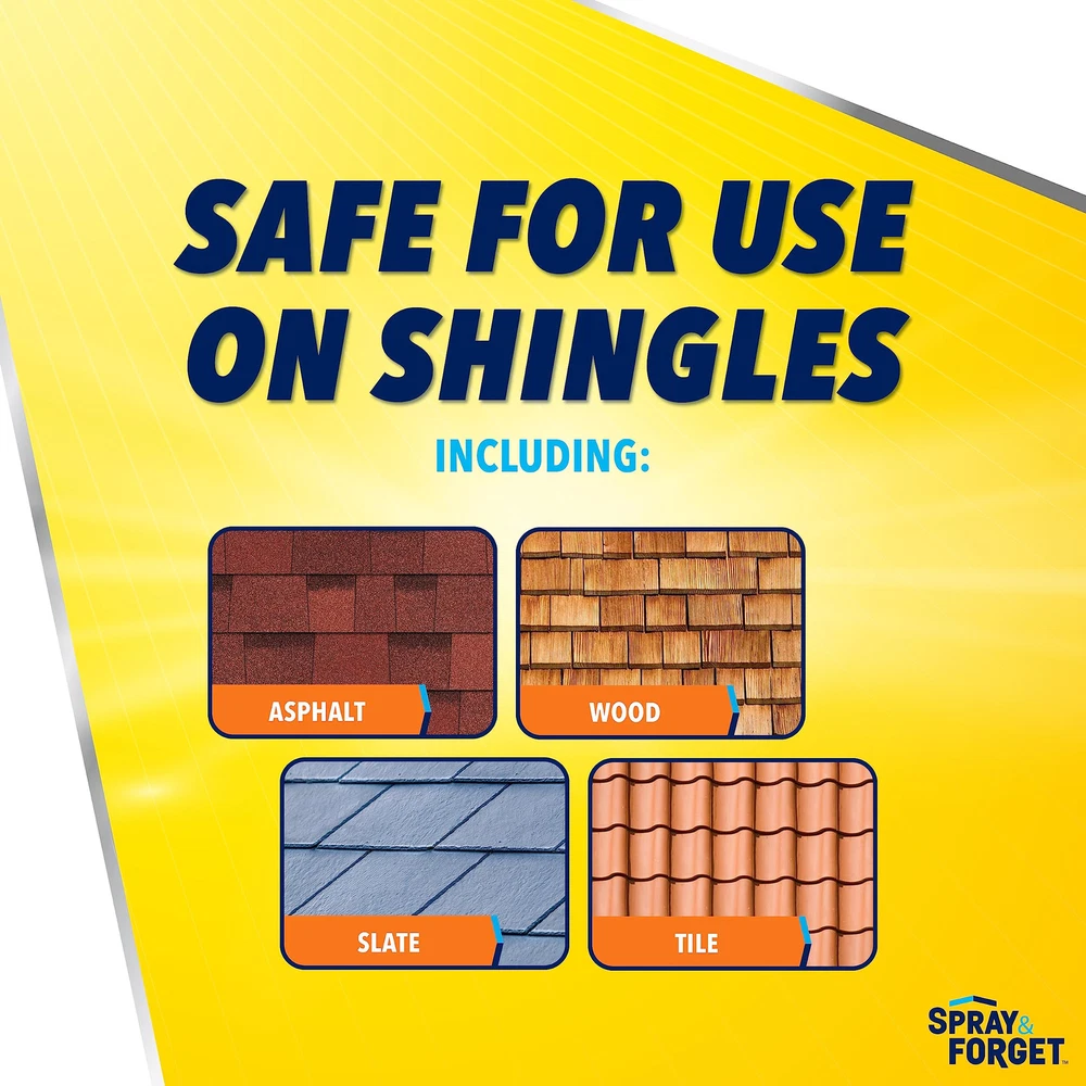 Clean up your roof with Revolutionary Roof Cleaner Concentrate. This roof cleaner uses a fast-acting formula that effectively removes stubborn black streaks and other stains caused by algae, mold and mildew – delivering results in minutes, not weeks! Packed in a 1-gallon bottle, this concentrate can make up to 10 gallons of cleaning solution – enough to cover 1000 to 2000 square feet*. is an ideal roof cleaner for asphalt shingles, wood shingles, slate shingles, clay shingles and tile shingles. DIRECTIONS FOR USE: 1) Mix 1:9 ratio of product and water. 2) Rinse surrounding plants with water. 3) Spray mixture from pump sprayer on roof. 4) Wait 1 minute while foam works on stains. Most stains will turn orange when cleaning. 5) Turn nozzle to “RINSE” and spray until orange color is gone for more immediate results or allow rain to rinse over time. 6) Repeat if necessary (darker stained roofs may need multiple applications). 7) Rinse surrounding plants, gutters and decks with water when finished. Use only as directed. For outdoor use only. Inspect roof prior to stepping or walking on. Make sure it is dry and clear of debris. Avoid with eyes and skin. Use eye protection and resistant gloves when applying. Wash thoroughly with soap and water after handling. * Results may vary depending on soil level. REMOVES STAINS & BLACK STREAKS: Revolutionary Roof Cleaner Concentrate effectively removes stubborn black streaks as well as other stains caused by algae, mold and mildew. WORKS FAST: This bleach and phosphate-free concentrate works fast so you get results in minutes, not weeks! FOR USE ON SHINGLES including asphalt, wood, slate, clay and tile. COVERS A WIDE AREA: Roof Cleaner Concentrate can make up to 10 Gallons of cleaner solution – enough to cover 1000 - 2000 square feet. * EASY TO USE: Just mix 1:9 ratio of product and water. Spray mixture onto roof and wait 1 minute for foam to lift and turn stains orange. Rinse for more immediate results or allow rain to rinse over time. Not all stains will turn orange.