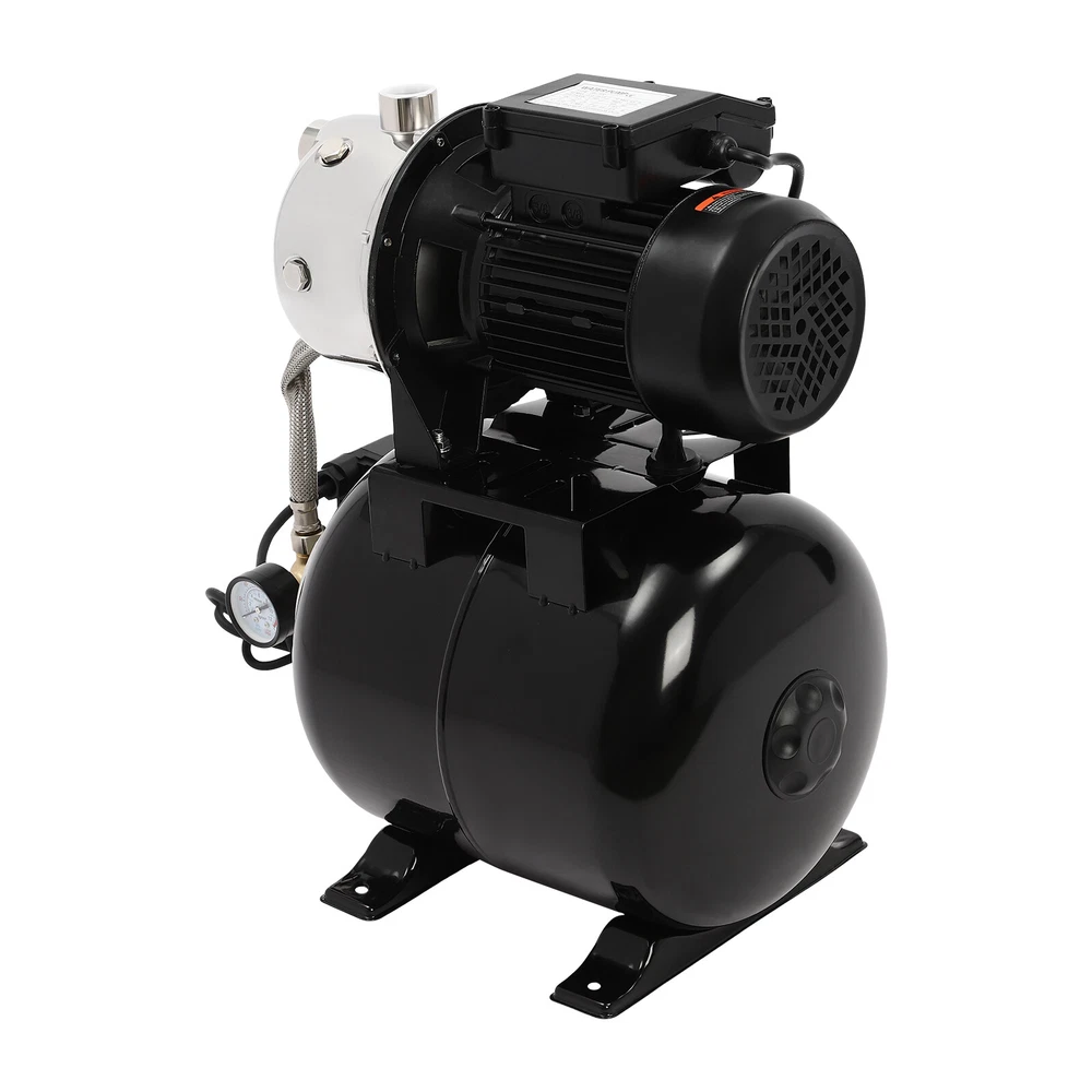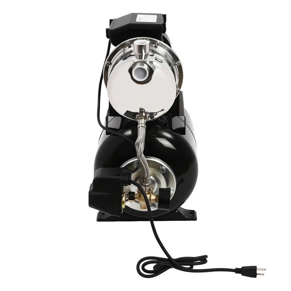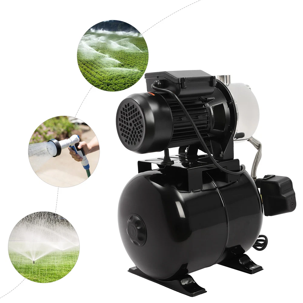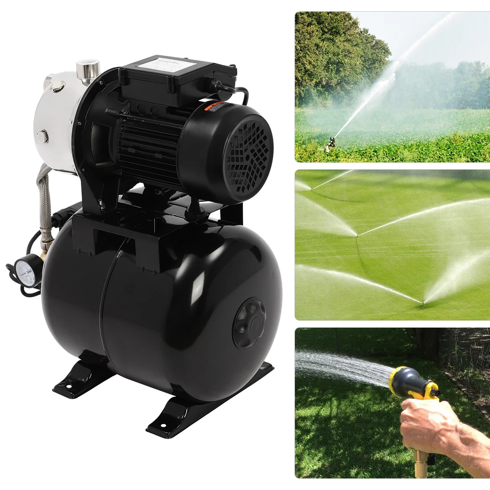 Details IP44 Protection Level: It can prevent dust and rain from accumulating to a certain extent, and prevent rain or water from splashing into the interior of the equipment, thus prolonging the service life of the product. Support Base: With pre-drilled holes on the base, you can secure this product on the ground with screws for better stability during operation. Application The product is suitable for long-distance water transportation, garden irrigation, farm irrigation, lawn sprinkler irrigation, high-rise living water, faucet and shower pressurization, groundwater and well water extraction, water supply, and so on. Package Included 1* Shallow Well Pump 1* PTFE Tape 1* Multi-language Manual 1HP Irrigation Water Pump Shallow Well Pump with Pressure Tank 3420r/min 0.75kw Description Built with high-quality materials, this shallow well water pump with a powerful pure copper motor and a 6.34-gallon pressure tank is durable and efficient, making it an ideal tool for your home tap water boosting, agricultural or gardening pumping, and irrigation work. The automatic pressure switch and self-priming system make the operation of the product easier and smarter, making your life more comfortable and your work more efficient. Key Features Build to Last : With a high-quality stainless steel pump head, cast aluminum pump casing, and the paint spraying process, the product is sturdy, resistant to rust, corrosion, and deformation, and can keep practicality for a long time. High Efficiency : It is powered by a 1HP motor that can spin up to 3420rpm, giving the product a maximum flow rate of 105.94 ft³/hour, which provides the power to pump water faster and easier. High Pumping Head: With a maximum head of 147.64 feet, the pump has a wide range of irrigation distances and acreages, which can significantly save the time and cost of manual transportation. Thoughtful Design: The 6.34gal pressure tank and automatic pressure switch allow the product to automatically start at 20psi and shut off at 40psi. In addition, the clear pressure gauge allows you to easily observe and promptly make adjustments. Safety Guarantee: The product has overload, overheating, and water shortage protection, which will make the product automatically stop working and cut off the power to ensure the safety of use. Excellent Sealing Performance: The product is equipped with a durable carbon ceramic mechanical seal and PTFE tape to prevent leakage and extend product life. Quick Heat Dissipation : The powerful fan and heat emission holes give the product excellent heat dissipation performance to prevent the product from overburning. Customer Service: We aim to provide quality products and services. If you have any problems, please feel free to contact us. We will reply and solve the problem for you as soon as possible. Details IP44 Protection Level: It can prevent dust and rain from accumulating to a certain extent, and prevent rain or water from splashing into the interior of the equipment, thus prolonging the service life of the product. Support Base: With pre-drilled holes on the base, you can secure this product on the ground with screws for better stability during operation. Application The product is suitable for long-distance water transportation, garden irrigation, farm irrigation, lawn sprinkler irrigation, high-rise living water, faucet and shower pressurization, groundwater and well water extraction, water supply, and so on. Specifications Color: Black Style: Modern Process: Spray Paint Material: Stainless Steel, Cast Aluminum, Ceramic Copper Type: Pure Copper Brushless Motor Plug Type: US Standard Flow Rate: 3m³/105.94ft³/h Max. Head: 45m/147.64ft Power: 0.75kw/1HP Speed: 3420r/min Input Current: 7A Frequency: 60Hz Voltage: 110V Capacitance Capacity: 35μF Protection Level: IP44 Insulation Grade: B Water Inlet Size: 2.54cm/1in Water Outlet Size: 2.54cm/1in Power Cord Length: 1m/3.28ft Tank Capacity: 24L/6.34Gal/25.36qt Suitable Water Temperature: 0-75℃/32-167℉ Phase: 1~Mot Noise: 0-30dB Thread Type: G Suitable Well Depth: 8-25m/26.25-82ft Product Overall Size: 45*27.5*49.5cm/17.72*10.83*19.49in Tank Size(D*H): 28*35cm/11.02*13.78in Motor Size(D*H): 13.5*37cm/5.31*14.57in Base Size: 24*27.5cm/9.45*10.83in Packaging Size: 50*35*58cm/19.69*13.78*22.83in Gross Weight: 13.2kg/29.1lbs Package Included 1* Shallow Well Pump 1* PTFE Tape 1* Multi-language Manual Notes Please check the size carefully before ordering. Please read the manual carefully before operating the pump. Please do not run the pump without water. Please be sure that the pump is properly grounded before operating. Please allow the slight color difference caused by the shooting light and 1-3cm error due to manual measurement, and make sure you do not mind before you order. Payment Delivery details Terms of sales About us Contact us Payment We accept ebay payment 。 Fees such as import duties, taxes are not included in the item price or shipping costs. These charges are the buyer's responsibility. Delivery details Shipping: 2-9 working days to: USA Terms of sales We maintain high standards of excellence and strive for hundred percent customer satisfaction. Feedback is very important to us. We hope that you contact us immediately before you give neutral or negative feedback, so that we can address your concerns. It is impossible to address issues if we do not know about them! About us Your satis faction is our ultimate goal. We work hard to earn your trust and future business. Our certified technicians have tested each item before shipping. The unit comes with 1 year limited warranty on all manufacturing defects. a) If you receive a defective item, you may return it or ask for a discount. Please contact us within 14 days after you receive the package. b) What you returned must be intact and in its original packaging as re? u. Customer is responsible for shipping costs of the returned item. c) We will cover the cost of shipping back t with the shipping rate 
