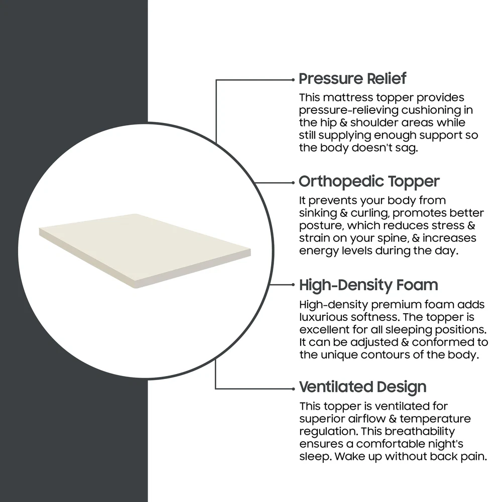 The premium foam adds luxurious softness while not taking away from the support of the mattress. These bed toppers have been effective in enhancing the comfort level of new and old mattresses alike, providing a better sleep experience for most people. This Convoluted Egg Shell Breathable Foam Topper is made from good quality foam that gently cradles you in individualized comfort and support. It also provides you with pressure-relieving cushioning in the hip and shoulder areas while still supplying enough support, so the body doesn't get imbalanced. These unique mattress toppers are to be used on top of your mattress for additional comfort. This prevents your body from sinking and curling while sleeping and promotes a better posture, which reduces and strain on your spine and increases energy levels during the day. Our premium-level mattresses are here to help you get the best possible comfort at all times when you sleep or lie down to relax. Comfort: A mattress topper can add an extra layer of comfort to your mattress, making it feel softer and more luxurious. This can be especially beneficial if you have a firm or uncomfortable mattress. Support: Toppers can provide additional support to your body while you sleep. This can help alleviate pain and pressure points and promote better alignment of your spine. CertiPUR-US certified foam: Rest easy knowing that the topper's foams are CertiPUR-US certified, meeting stringent standards for durability, performance, and content. Quality you can trust. Temperature regulation: Mattress toppers are designed to regulate temperature and keep you cool during the night. This can be especially beneficial if you tend to overheat while you sleep. Cost-effective: If you're not ready to invest in a new mattress, a mattress topper can be a cost-effective solution to improve your sleep experience. It's also easier to replace a topper than a mattress, which can be a more affordable option in the long run.