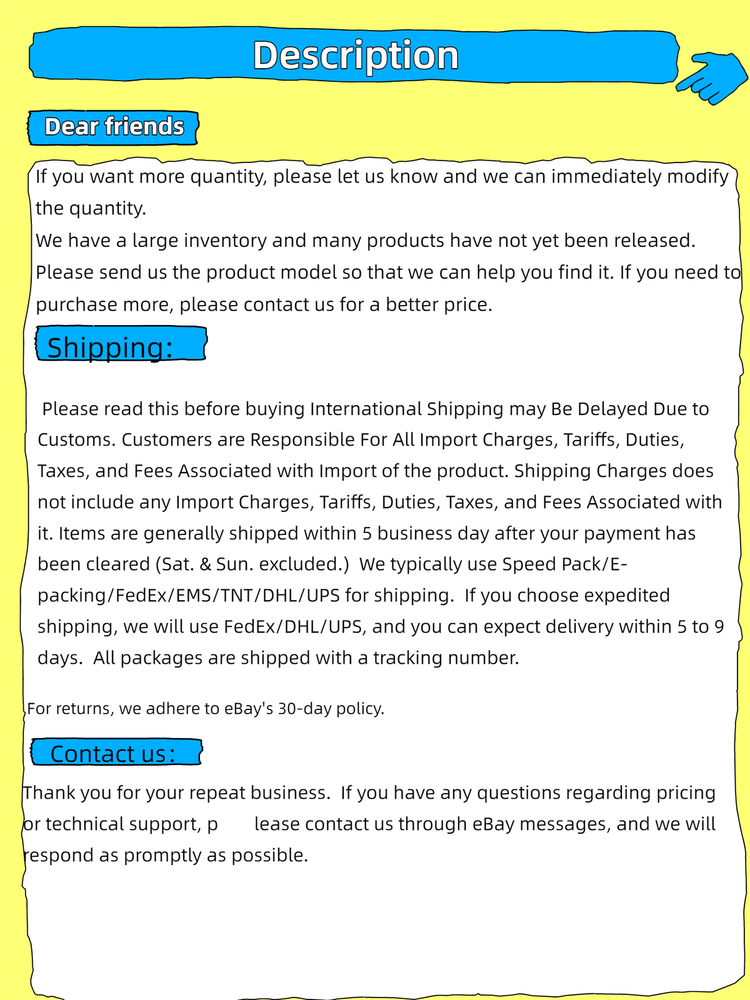 Dear friends Industrial control products come with a one-year warranty If you want more quantity, please let us know and we can immediately modify the quantity. We have a large inventory and many products have not yet been released. Please send us the product model so that we can help you find it. If you need to purchase more, please contact us for a better price. Items are shipped within 3-5 days after payment is received. Suspension of taxes: Import duties, taxes and charges are not included in the item price or shipping. These fees are the responsibility of the buyer. If you need items not listed on eBay, drop us a line and we'll try to find them through our own global supply chain. For returns, we adhere to eBay's 30-day policy. Please ensure that the item is unopened when returning. contact us: If you have any questions, we will be happy to help you. Please allow us to respond to your email within 24 hours. Please leave a comment on ebay (welcome to use) or contact us via email.