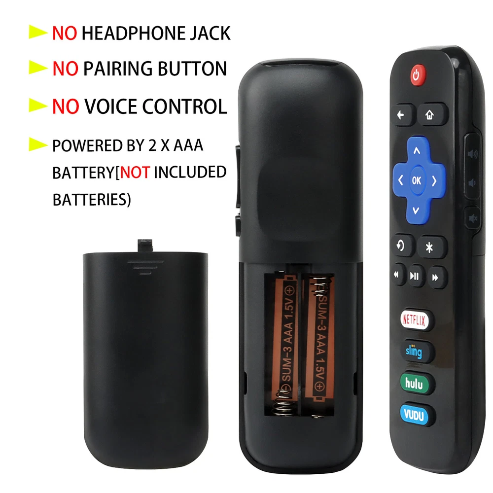 Product Description If you have any questions, please contact customer service first, do not open disputes easily, thank you! Specification: Type: remote control Compatible brand:For tcl ROKU TV Part of the applicable models:RC280 32S3800 43S303 55FS3750 Applicable equipment:TV Material:ABS Color:black Battery:2*aaa(not included) Quantity:1 set Remote control can solve your home backup remote control needs. Infrared remote no pairing or programming needed. Just Insert 2 Pcs*AAA batteries to get it work(Batteries and manual are not included) Compatible with: For TCL Roku TV For Element Roku TV For Sanyo Roku TV For LG Roku TV For RCA Roku TV For Philips ROKU TV For HITACHI Roku TV For HAIER Roku TV NOT Compatible with: For Roku Streaming Stick For Roku 1/2/3/4 For Roku Express For Roku Premiere For Roku Ultra Package Included: 1*remote control (batteries not included) Notes: Please allow 1-3 mm error due to manual measurement. Please make sure you don't mind before ordering. Due to the lighting of the photos and the difference of monitors, the pictures may not reflect the actual color of the real item. Please make sure you don't mind before ordering, thank you About Us We accept all payments authorized by eBay. powered by