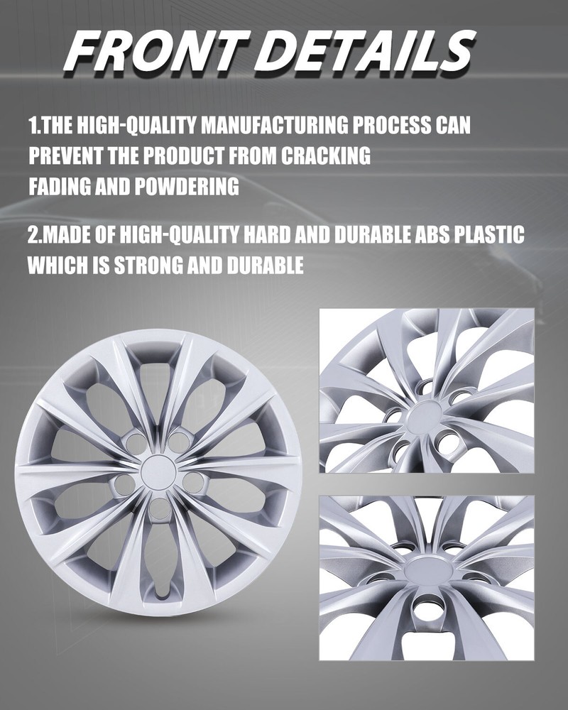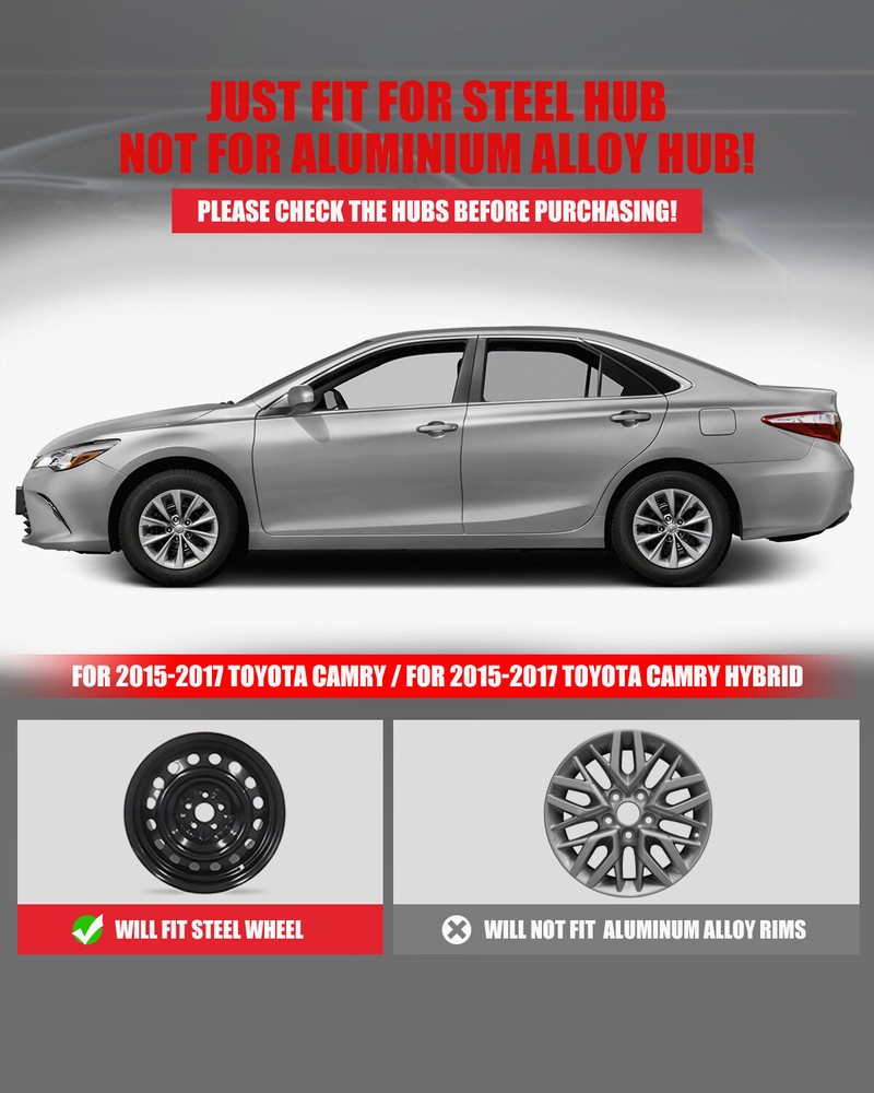 Store Categories Other Car Refrigerator Front Bumper Rear Bumper Fender Flares Inner Fenders Side Steps Running Board A-Pillar Light Mount Brackets Headlights Taillights Fog Lights LED Headlights LED Taillights LED Fog Lights Jeep Chevrolet Ford Toyota Dodge GMC Wheel Covers Features ✴ PERFECT FIT: This wheel hub cap is specifically designed to perfectly fit for 16-inch wheels, ensuring a seamless match and enhanced aesthetics. It complements the overall design of the vehicle, elevating its visual appeal. ✴ HIGH-QUALITY MATERIAL: Constructed from high-quality materials, this wheel hub cap guarantees durability and longevity. It withstands various road conditions and environmental factors encountered during daily driving, maintaining its pristine condition. ✴ EASY INSTALLATION: Installing this wheel hub cap is a breeze and requires no specialized tools or modifications. It comes with a user-friendly system, allowing for a hassle-free installation process by following the provided instructions. ✴ PROTECTIVE FUNCTION: Besides its aesthetic appeal, this wheel hub cap serves as a protective barrier for the wheels. It prevents scratches and potential damage caused by stones, debris, or other objects, safeguarding the wheel's surface. ✴ AFTER-SALES SERVICE: If There Is a Loss of Product Parts, or Any Parts of The Problem, We Can Provide After-Sales Service, Please Contact Us on The Order Page. Wheel Covers Specification ✴ Type: Hub caps ✴ Number in Pack: 1 ✴ Color: Silver Lacquer ✴ Material: ABS ✴ Compatible Wheel Diameter: 16 in ✴ Finish: Glossy ✴ Installation Type: Snap-On ✴ Model: For 2015-2017 Toyota Camry/For 2015-2017 Toyota Camry Hybrid Wheel Covers Package ✴ 1 Hub cap and 1 retention ring Payment Delivery details Terms of sales About us Contact us Payment We accept PayPal, credit card , Apple Pay & Google Pay etc. Delivery details All items will be shipped within 1-3 business days after payment received, we will try our best to ship out as soon as we can, hope for your understanding. Please double confirm your address and contact information, which will help the delivery faster and more accurately. Note :buyers who purchase international products need to pay import tariffs!!! Terms of sales Professional installation is highly recommended. Any problem of the item please feel free to contact us first , please D o Not leave negative feedback before that, or simply return it within 60 Days in original condition. We will resolve it for you ASAP. About us Any questions please do not hesitate to contact us directly by eBay message . We will reply you within 24 hours asap, thanks for your understanding. Contact us Should you have any problem or require any further information please feel free to contact us . If you are satisfied with our product and service, please kindly leave us a positive feedback. Popular Categories On Mar 14, 2025 at 20:40:43 PDT, seller added the following information: