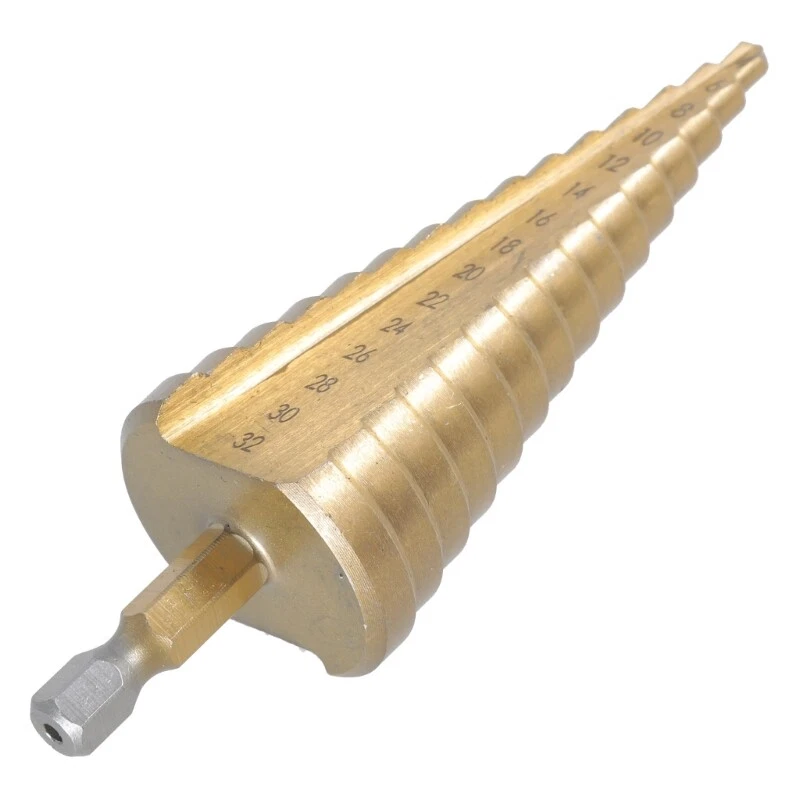 brand new and high quality Material: HSS Color: as shown in pic Color: as shown in pic Features: This is HSS High Speed Steel Step Drill / Pagoda Drill Bit, which is made from high quality HSS steel, and with the for coated to reduce friction and heat. It is very suitable for using to cut holes in a variety of materials including steel, brass, plastic, Finish: Shaft Type: for Triangle Shank 4-32mm Size: (Length approx.)10.2cm/ 4.02" The Cutters Come in The Sizes: 4-32mm (4mm, 6mm, 8mm, 10mm, 12mm, 14mm, 16mm, 18mm, 20mm, 22mm, 24mm, 26mm, 28mm, 30mm, 32mm) Quantity: 1PC Note: Due to the difference between different monitors, the picture may not reflect the actual color of the item. Thank you!!