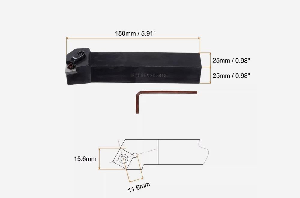 Brand new Model: MCFNR 2525M12 Material: Carbide Shank D: 25mm Shank L: 150mm Accept Inserts: CNMG1204** Features: 1.To maintain tight tolerances unmatched performance. 2.Accessories steel is good, long life, reducing the user cost of the tool. 3.High grip strength, impact resistance and strong, clear speed advantage in cutting off a large margin and processing 4.User clamping and convenient way to replace, only a wrench to complete the replacement of the blade and pad. 5.Practical and a variety of processing environments, even in very dirty environments such as cast iron also has good features. Package included: 1 x MCFNR 2525M12 holder 1 x “L” Type wrench
