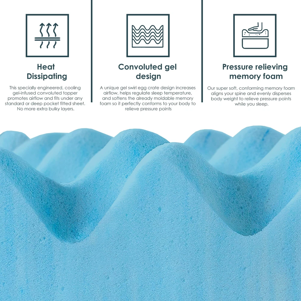 The premium infused memory foam toppers adds luxurious softness while not taking away from the support of the mattress. These bed toppers have been effective in enhancing the comfort level of new and old mattresses alike, providing a better sleep experience for most people. This Convoluted Egg Shell Breathable Foam Topper is made from good quality foam that gently cradles you in individualized comfort and support. It also provides you with pressure-relieving cushioning in the hip and shoulder areas while still supplying enough support, so the body doesn't get imbalanced. These unique mattress toppers are to be used on top of your mattress for additional comfort. This prevents your body from sinking and curling while sleeping and promotes a better posture, which reduces and strain on your spine and increases energy levels during the day. Our premium-level mattresses are here to help you get the best possible comfort at all times when you sleep or lie down to relax. Pressure : The convoluted design of the foam topper provides targeted pressure and support to different parts of the body. This can help reduce pain and discomfort in areas such as the hips, shoulders, and back. Temperature Regulation: The addition of to the foam can help regulate body temperature, keeping you cool throughout the night. This can be particularly helpful for people who tend to sleep hot. Motion Isolation: Memory foam toppers, including convoluted memory foam toppers, are known for their ability to isolate motion. This means that if your partner moves around in bed, you are less likely to be disturbed by their movements. Durability: Convoluted memory foam toppers are designed to be durable, which means they can provide consistent support and pressure for several years. CertiPUR-US certified foam: Rest easy knowing that the topper's foams are CertiPUR-US certified, meeting stringent standards for durability, performance, and content. Quality you can trust.