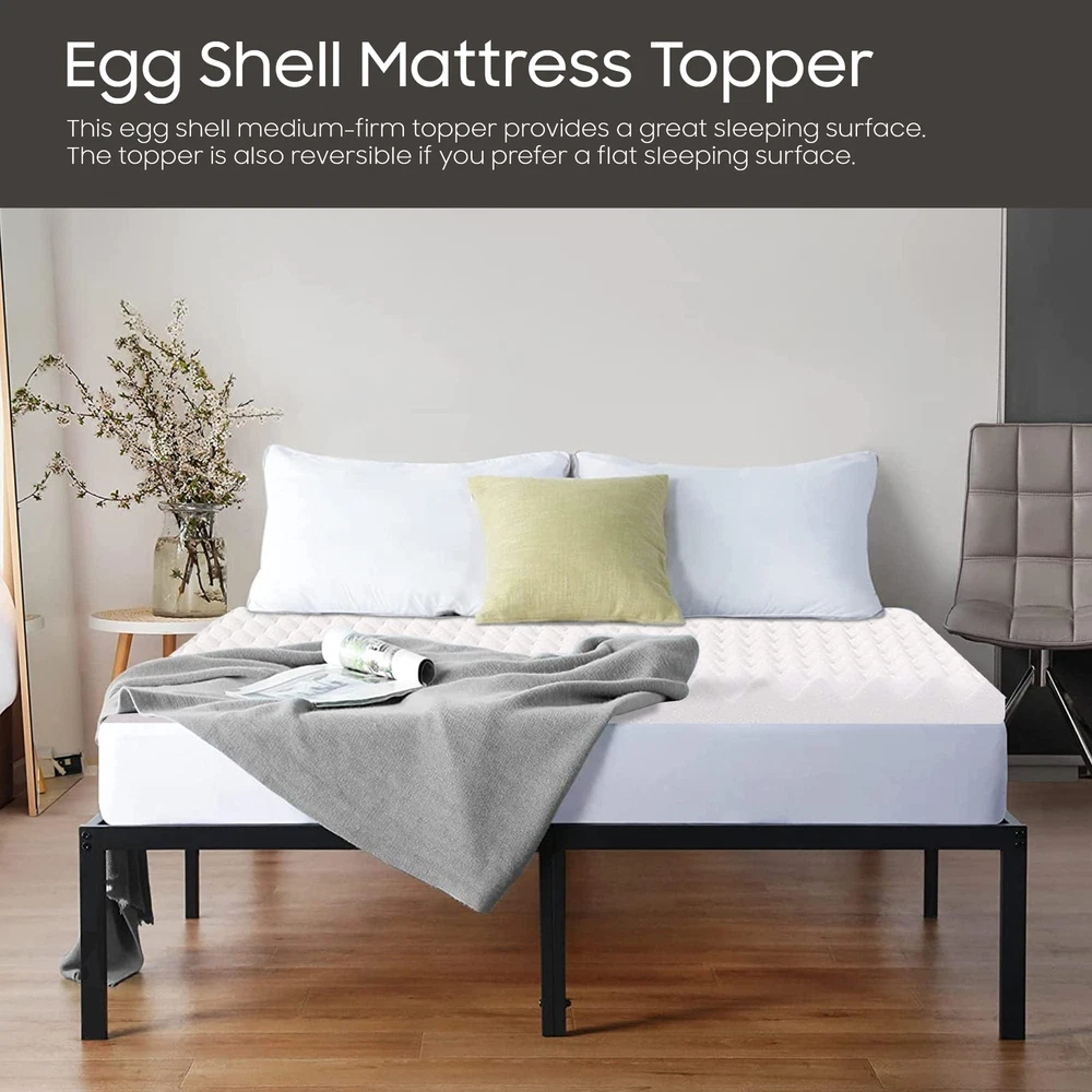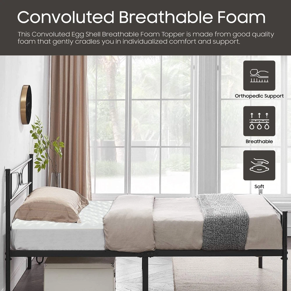 The premium foam adds luxurious softness while not taking away from the support of the mattress. These bed toppers have been effective in enhancing the comfort level of new and old mattresses alike, providing a better sleep experience for most people. This Convoluted Egg Shell Breathable Foam Topper is made from good quality foam that gently cradles you in individualized comfort and support. It also provides you with pressure-relieving cushioning in the hip and shoulder areas while still supplying enough support, so the body doesn't get imbalanced. These unique mattress toppers are to be used on top of your mattress for additional comfort. This prevents your body from sinking and curling while sleeping and promotes a better posture, which reduces and strain on your spine and increases energy levels during the day. Our premium-level mattresses are here to help you get the best possible comfort at all times when you sleep or lie down to relax. Pressure : The convoluted design of the foam helps to distribute weight evenly, which can help reduce pressure points on the body. This can be particularly helpful for people who suffer from joint pain or other conditions that make it difficult to get comfortable in bed. Increased comfort: The convoluted design can also make the mattress topper feel softer and more comfortable, which can lead to a more restful night's sleep. CertiPUR-US certified foam: Rest easy knowing that the topper's foams are CertiPUR-US certified, meeting stringent standards for durability, performance, and content. Quality you can trust. Motion isolation: The convoluted foam design can help to absorb movement, which can be helpful for people who share a bed with a partner. This can prevent motion from transferring across the bed and disturbing the other person's sleep. Versatility: Convolute foam mattress toppers are making them versatile and suitable for use with different types of mattresses. Toppers can be used on a variety of surfaces, such as futons or camping cots, to provide extra cushioning and comfort.